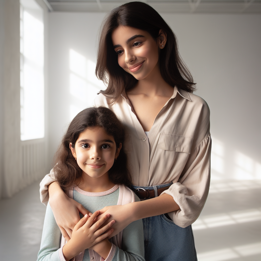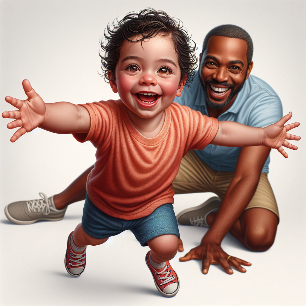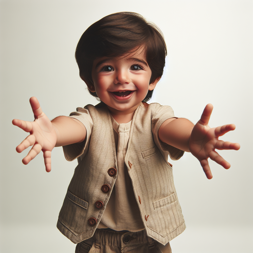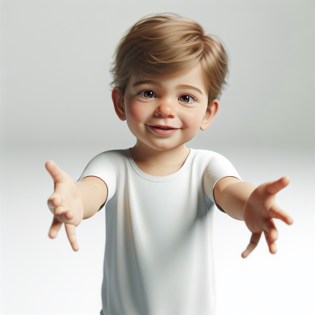 "enhanced_prompt": "Create a realistic image of a young toddler with arms extended, as if reaching for a cuddle. The child is centered in the image, standing on a plain white background. The toddler's face shows a warm, inviting smile with eyes wide open, conveying a sense of affection and eagerness. The scene emphasizes the natural expression and body language of the child, with no props or furniture. Ideal for toddler learning materials.",