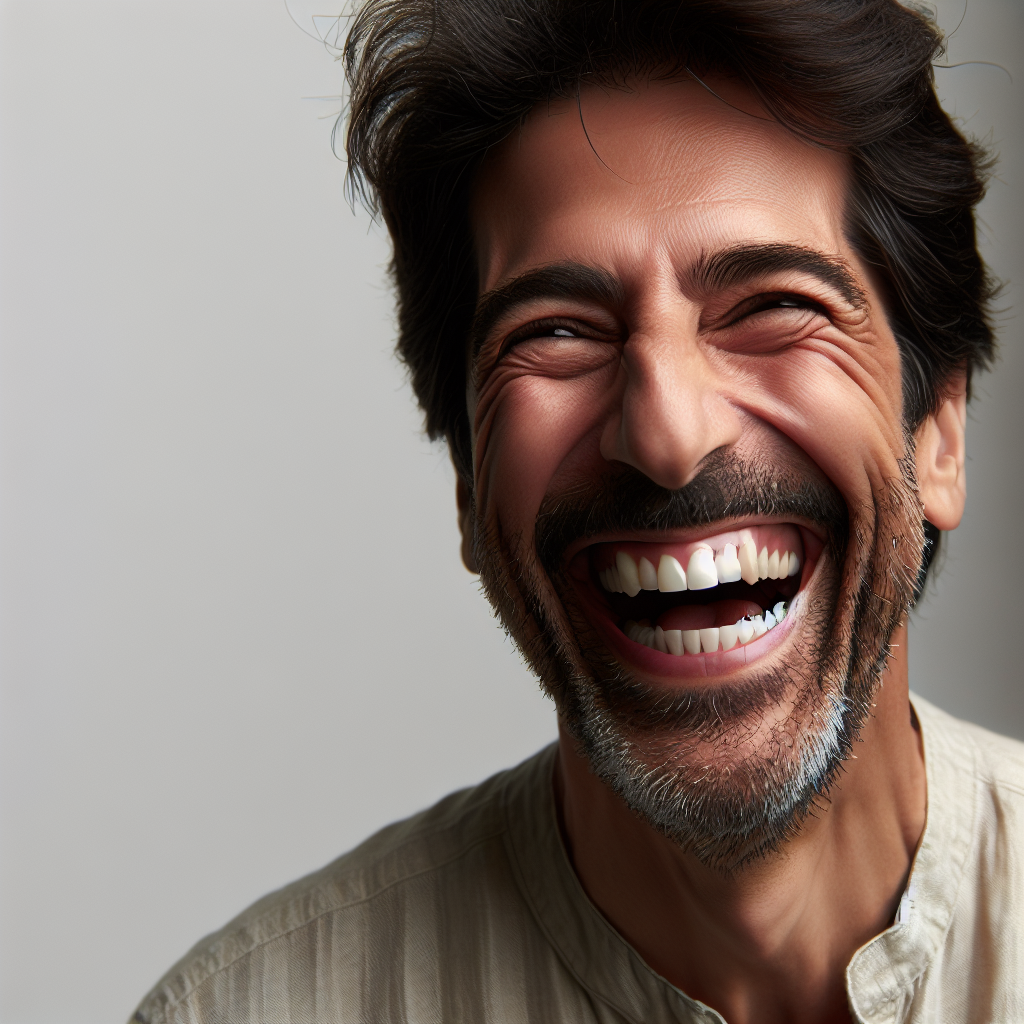 "prompt_used": "A adult showing the emotion: 'laugh'. Clear facial expression, plain white background.",