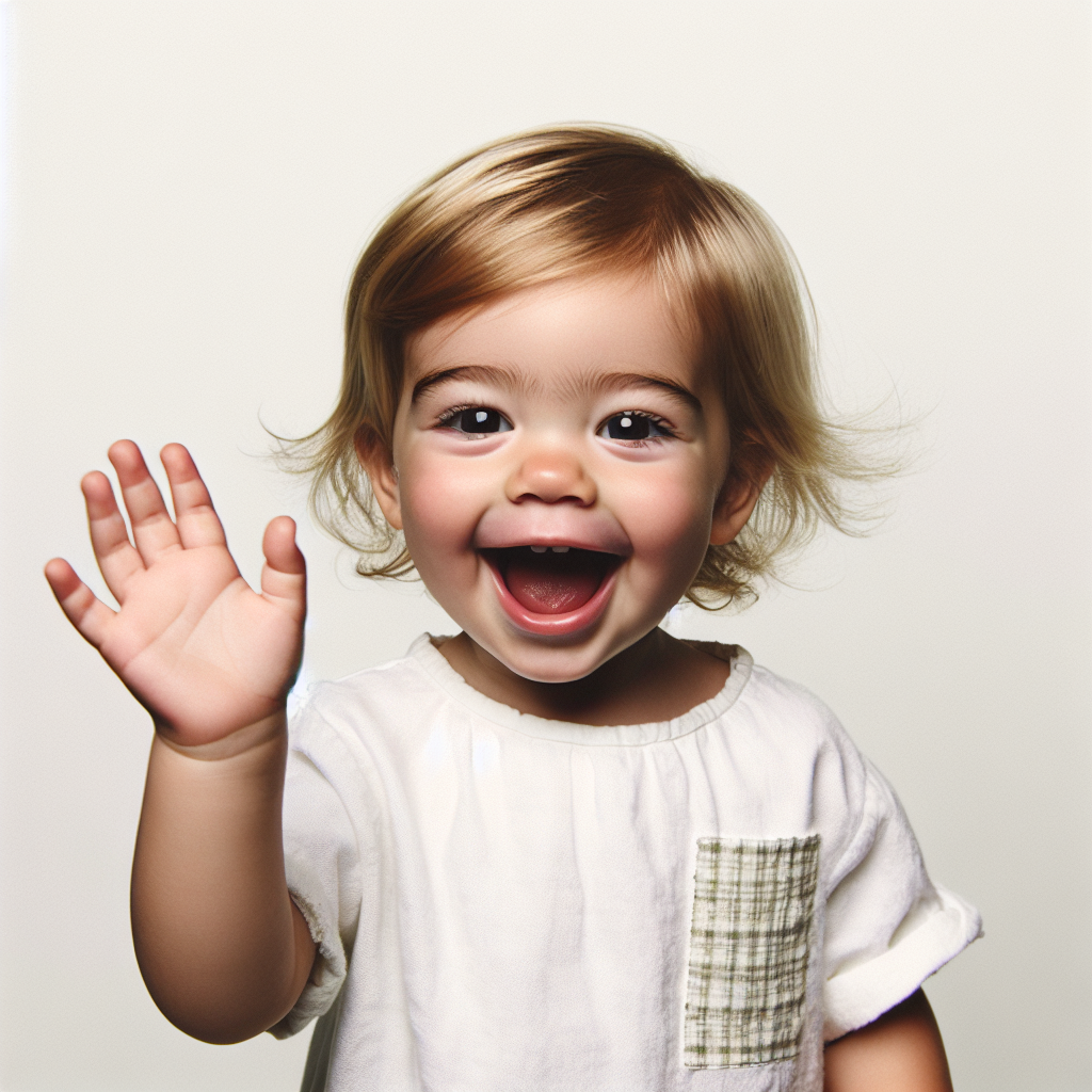 "enhanced_prompt": "Create a highly realistic image of a young toddler, about 2 years old, standing on a plain white background. The toddler is mid-action, waving enthusiastically with their right hand, and their facial expression is joyful and friendly. The toddler is centered in the image, with a focus on their expressive eyes and smile. Ensure the child's clothing is simple and unadorned to keep the scene uncomplicated, allowing the focus to remain on the toddler's action and expression. This image is ideal for toddler learning materials.",