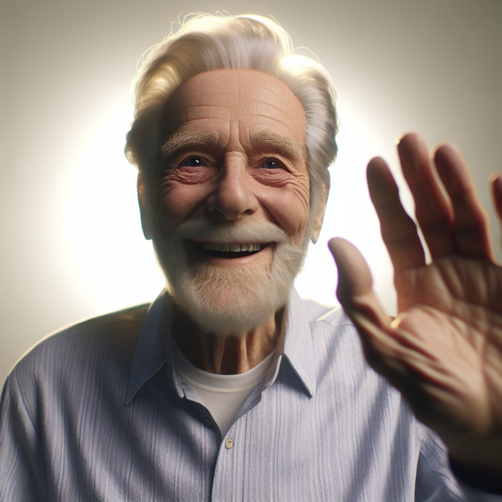 "enhanced_prompt": "Prompt: Create a highly realistic image of an elderly human, centered in the frame, clearly showing the action of 'waving' with a joyful and welcoming facial expression. The subject is against a plain white background with minimal distractions. The figure should be naturally lit, capturing the essence of warmth and friendliness. Avoid any unnecessary props or clutter to keep the focus on the subject's expression and gesture.",