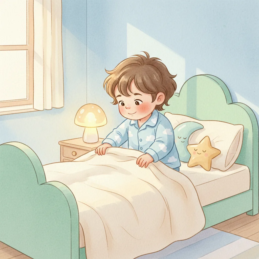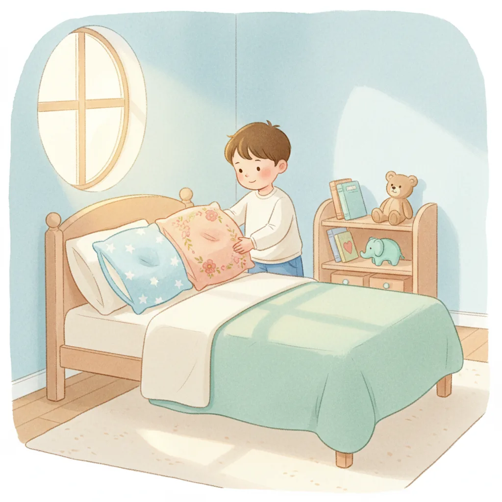 "content": "Creative Activity\n\n**Bedtime Tidy-Up Chart** \nCreate a simple chart with pictures showing the steps of tidying up a bed: \n1. Pull up the sheets \n2. Arrange the pillows \n3. Smile and feel proud \nLet the child place a sticker next to each step they complete before bedtime.\n\n**Tidy-Up Storybook** \nHelp the child make a mini-storybook using drawings or cut-out pictures. \nEach page shows a step of tidying up the bed. \nEncourage them to \"read\" their storybook before bed to reinforce the routine.",