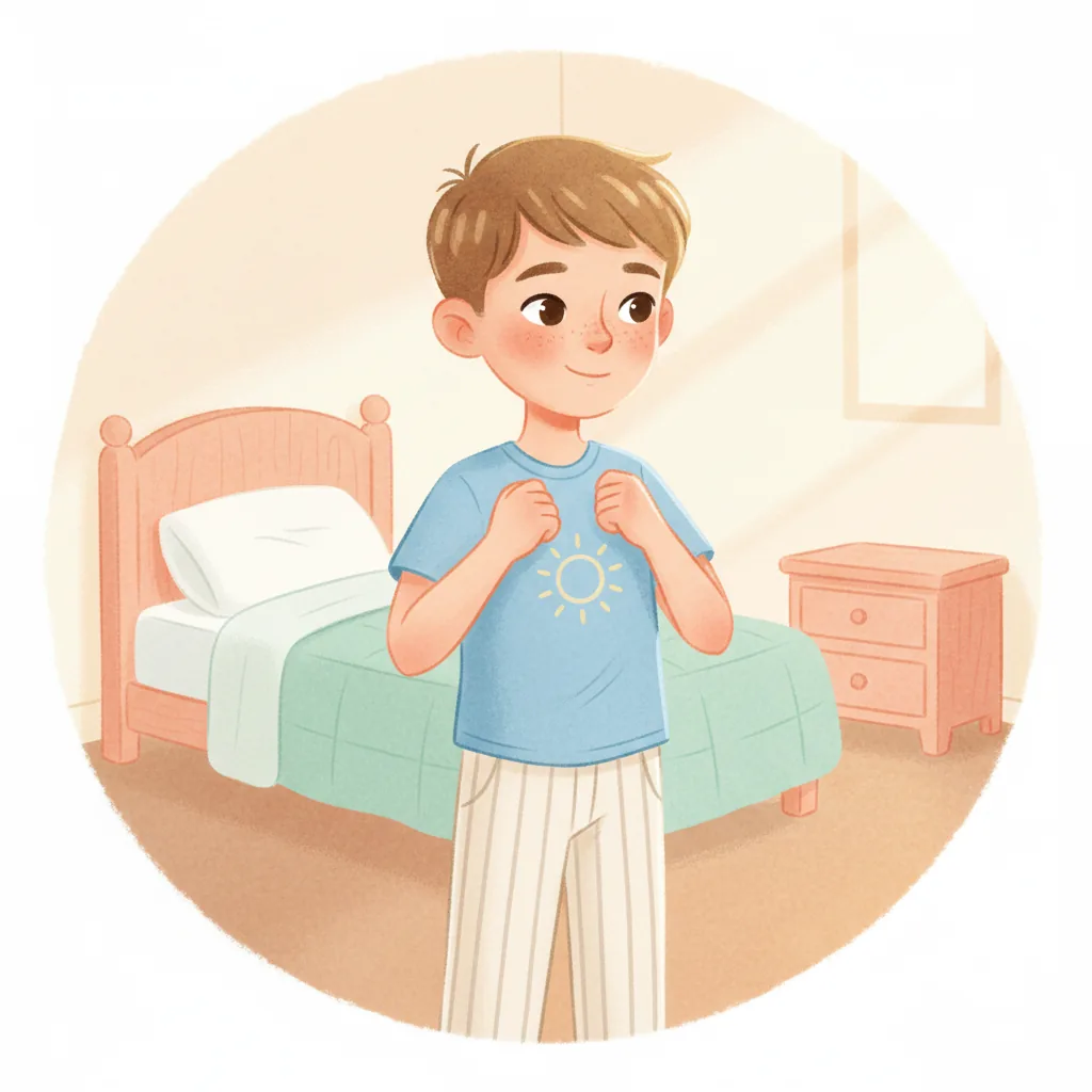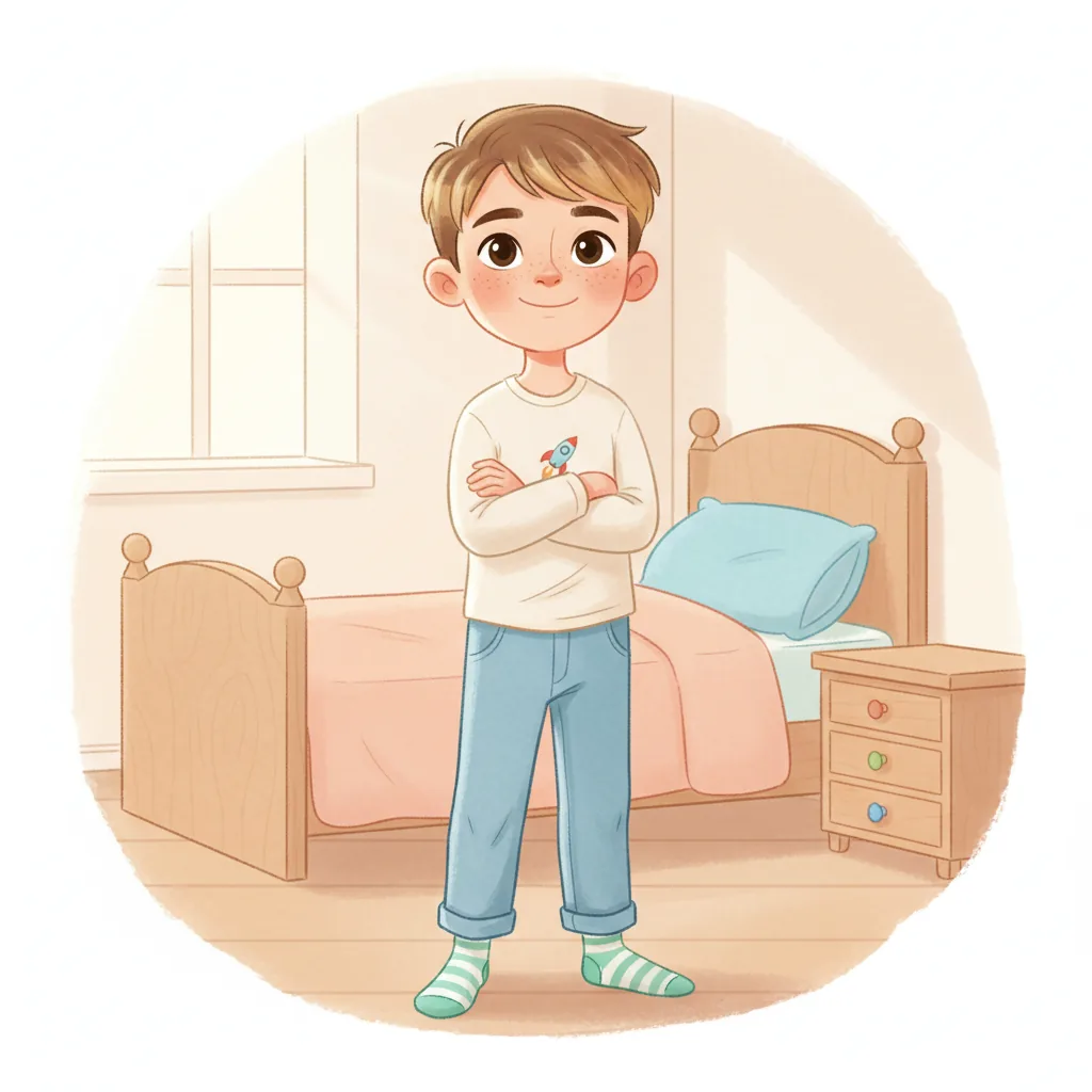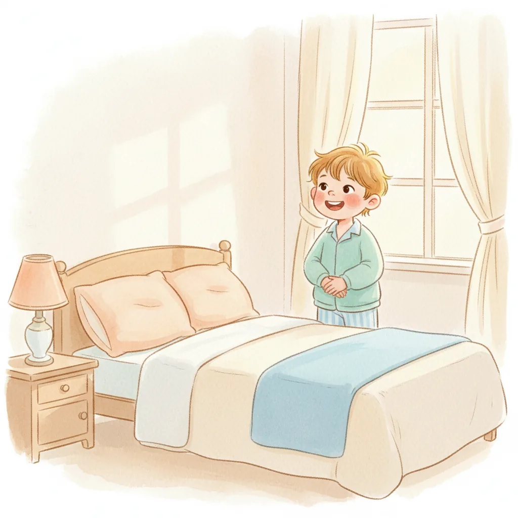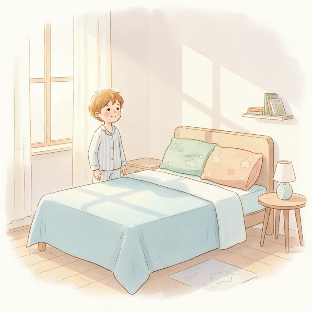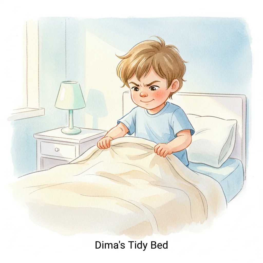 "content": ": Dima's Bedtime Tidy-Up Adventure**\n\n**Scenario 1** \nPretend the child is about to tidy their bed. \nPractice saying, \"I can do this myself!\" — feeling excited and brave. \nEncourage them to start pulling up the sheets and smoothing them out.\n\n**Scenario 2** \nAct out a situation where the child finds their favorite toy or pillow. \nPractice placing it neatly on the bed and saying, \"This makes my bed cozy!\" — feeling proud and happy. \nTalk about how nice it feels to have a tidy bed.\n\n**Scenario 3** \nPretend the child has finished tidying their bed. \nPractice saying, \"Look, my bed is all ready for bedtime!\" — feeling calm and accomplished. \nThey can share a big smile with a parent or friend to show how proud they feel.",