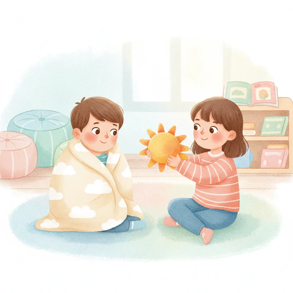 "content": "✏️ Vocabulary:\n\n1. **Cozy**\n - Feeling warm, comfortable, and safe\n\n2. **Tidy**\n - Neat and in order\n\n3. **Helper**\n - Someone who assists or makes things better\n\n4. **Smooth**\n - Soft and even, without bumps\n\n5. **Neat**\n - Clean and organized\n\n6. **Proud**\n - Feeling happy about something you did well\n\n7. **Calm**\n - Feeling relaxed and peaceful\n\n8. **Responsible**\n - Being able to do things by yourself and take care of tasks",