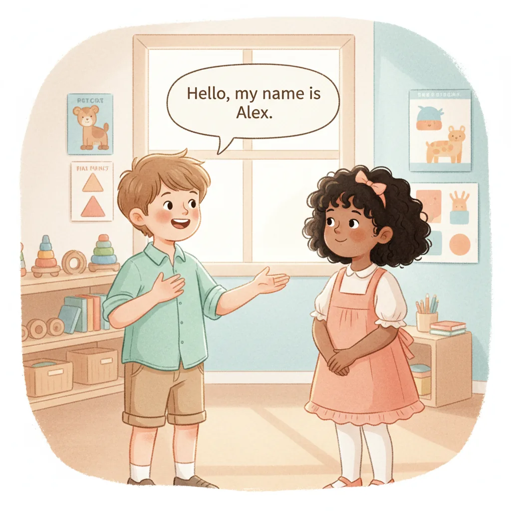 "content": "**Name Tag Necklace** \nHelp the child create a name tag necklace using paper, string, and colorful markers. \n- Cut out a paper circle or rectangle. \n- Write their name in big, bright letters. \n- Decorate with stickers or drawings. \n- Attach a string to wear as a necklace. \nPractice introducing themselves to family or friends using their name tag.\n\n**Meet and Greet Role Play** \nSet up a mini role-play using stuffed animals or puppets. \n- Act out meeting a new friend. \n- Practice saying \"Hello, my name is...\" \n- Encourage the child to ask the toy's name and say, \"Nice to meet you.\" \nThis helps build confidence in introducing themselves to others.",