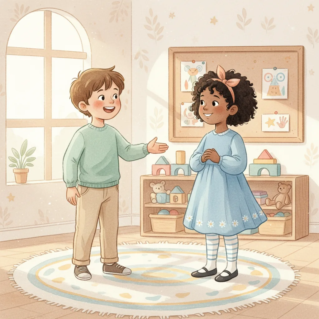"content_es": "**Role-Play Activity**\n\n\n**Escenario 1** \nImagina que el niño ve a un nuevo amigo en el parque de juegos. \nPractica tomar una gran respiración y decir, \"Hola, me llamo [Nombre del Niño].\" \n¡Siéntete orgulloso por ser valiente!\n\n**Escenario 2** \nRepresenta una situación donde un amigo se presenta. \nPractica respondiendo con: \"Mucho gusto,\" y siente felicidad por dentro.\n\n**Escenario 3** \nImaginen que el niño y un amigo están jugando juntos. \nPractiquen decir, \"Gracias por jugar conmigo,\" y siéntanse emocionados de hacer un nuevo amigo.",