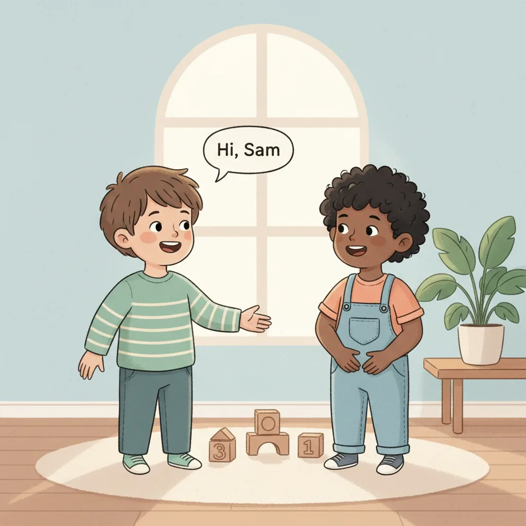 "es": "Open-Ended Questions\n\n\n1. ¿Cómo te sientes cuando conoces a alguien nuevo?\n\n2. ¿Qué puedes hacer si te sientes tímido pero quieres decir hola?\n\n3. ¿Por qué es importante presentarte a nuevos amigos?\n\n4. ¿Cómo crees que se sintió Sam cuando le pediste jugar juntos?\n\n5. ¿Qué te gusta decir cuando quieres hacer un nuevo amigo?",