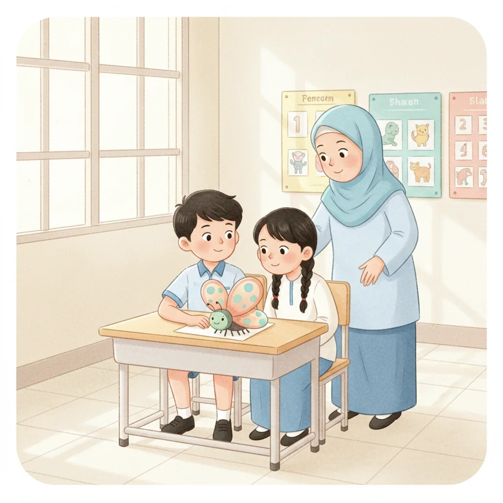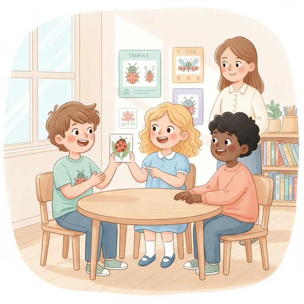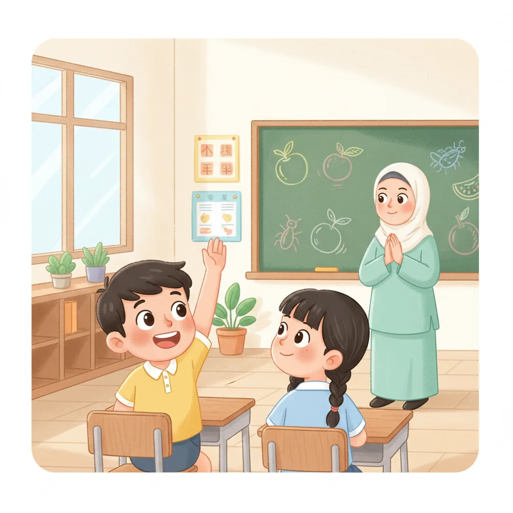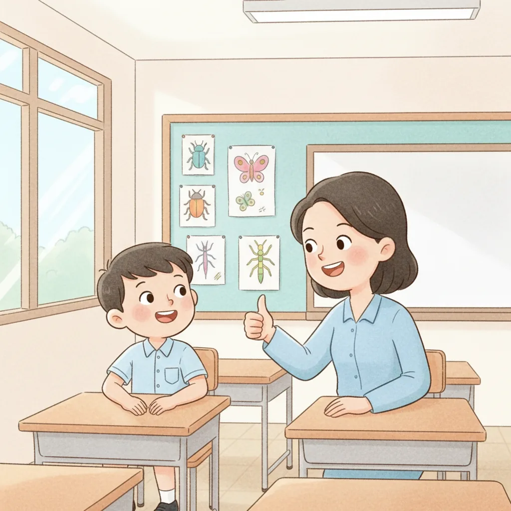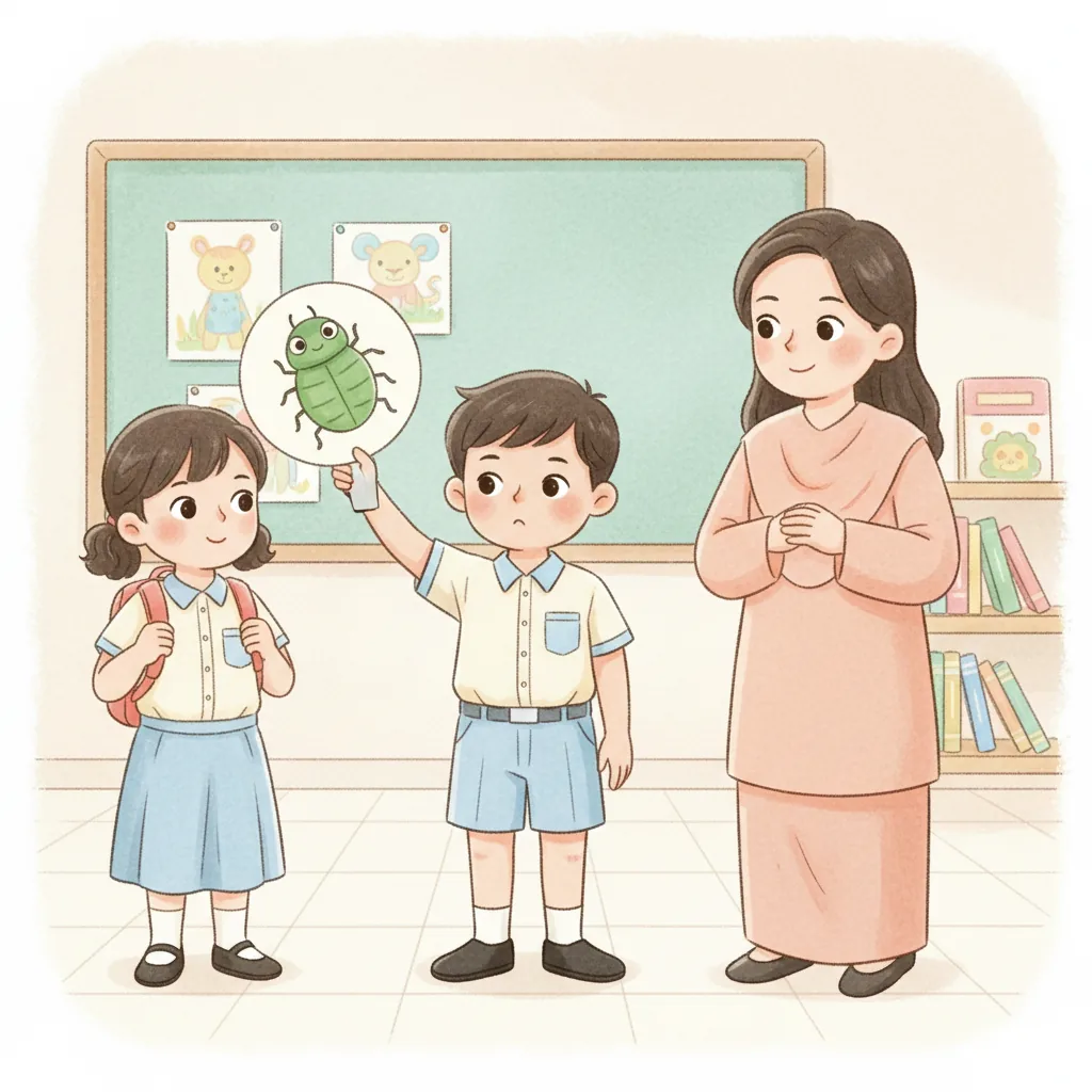 "content": "🧠 Topic: Thomas Learns to Play and Share in Malaysia \nComprehension Questions (Choose the Best Answer)\n\n1. What does Thomas love? \n A: Bugs ✅ \n B: Cars ❌\n\n2. How did Thomas feel when he went to school? \n A: Excited but a little nervous ✅ \n B: Sad and upset ❌\n\n3. What did Thomas want to talk about when his teacher was speaking? \n A: Ants ✅ \n B: Dinosaurs ❌\n\n4. What did Thomas do to feel calm? \n A: Played with a fidget toy ✅ \n B: Ran around the classroom ❌\n\n5. How did Thomas feel after sharing a fun fact about fruit flies? \n A: Happy ✅ \n B: Angry ❌\n\n6. What did Thomas ask his friends at recess? \n A: \"Can I join?\" ✅ \n B: \"Can I leave?\" ❌\n\n7. What did Thomas learn about sharing and waiting? \n A: It helps him have fun with friends ✅ \n B: It makes him feel lonely ❌",