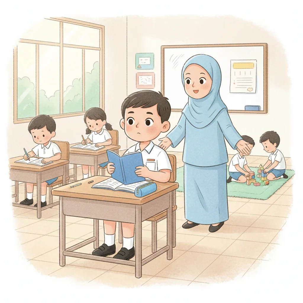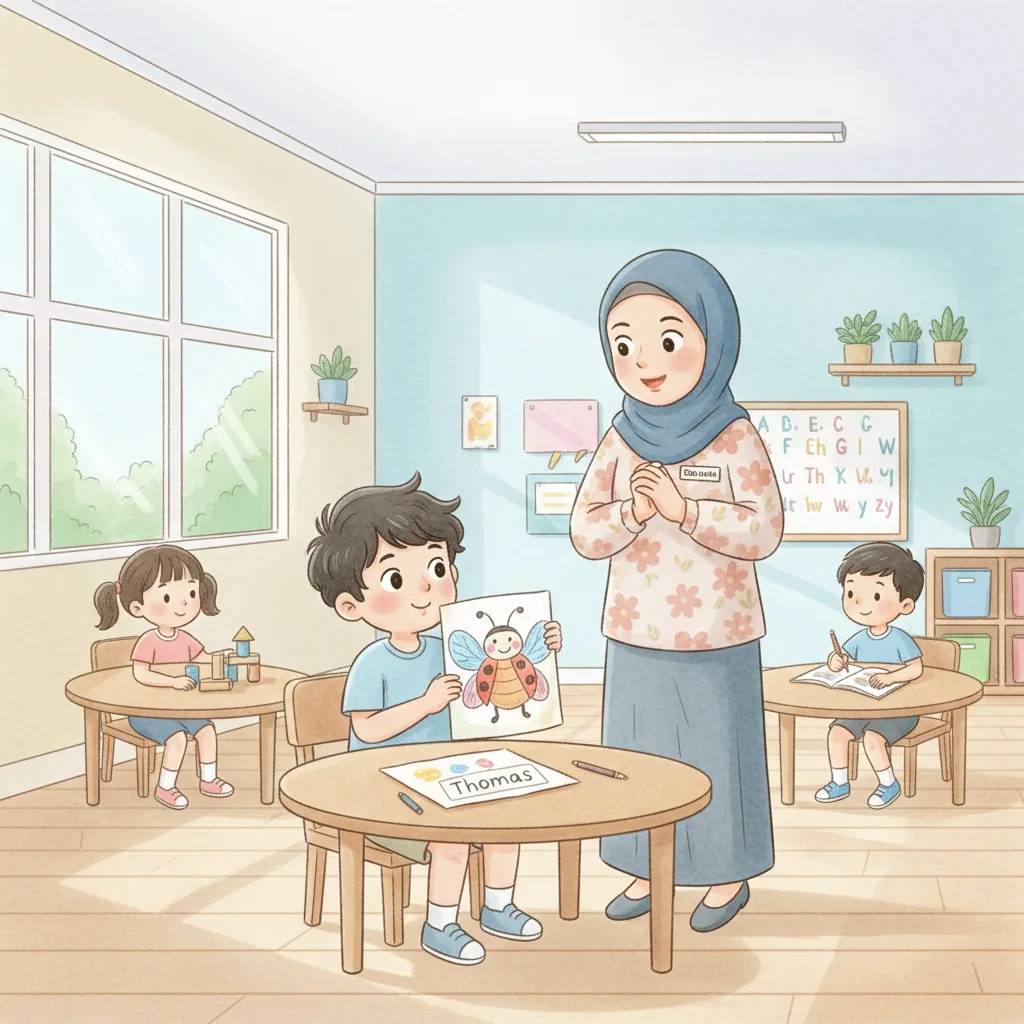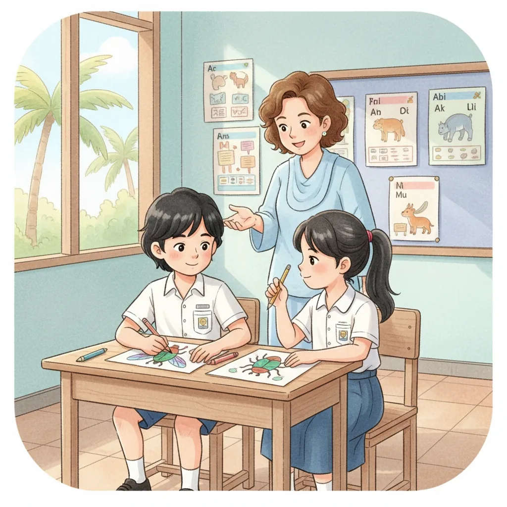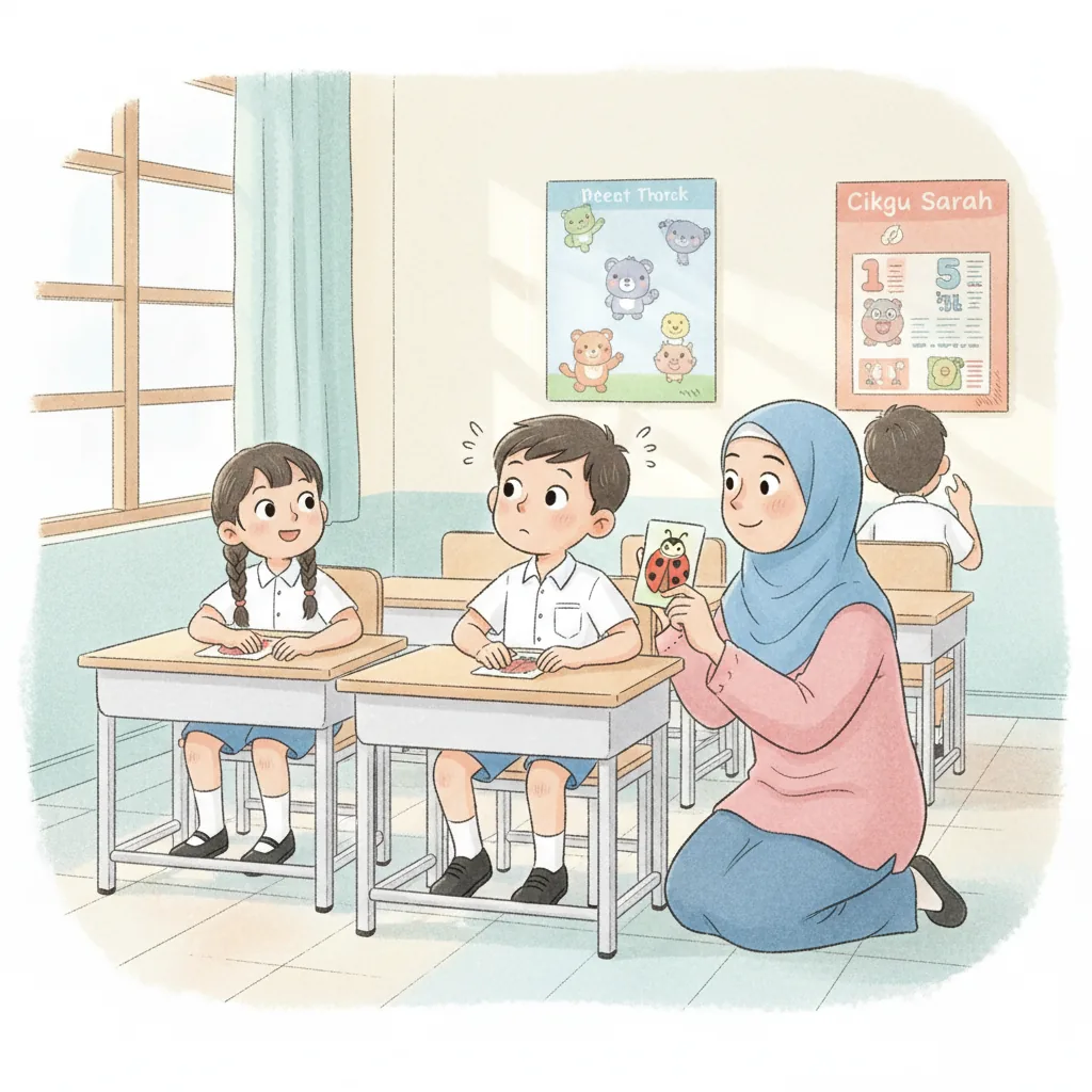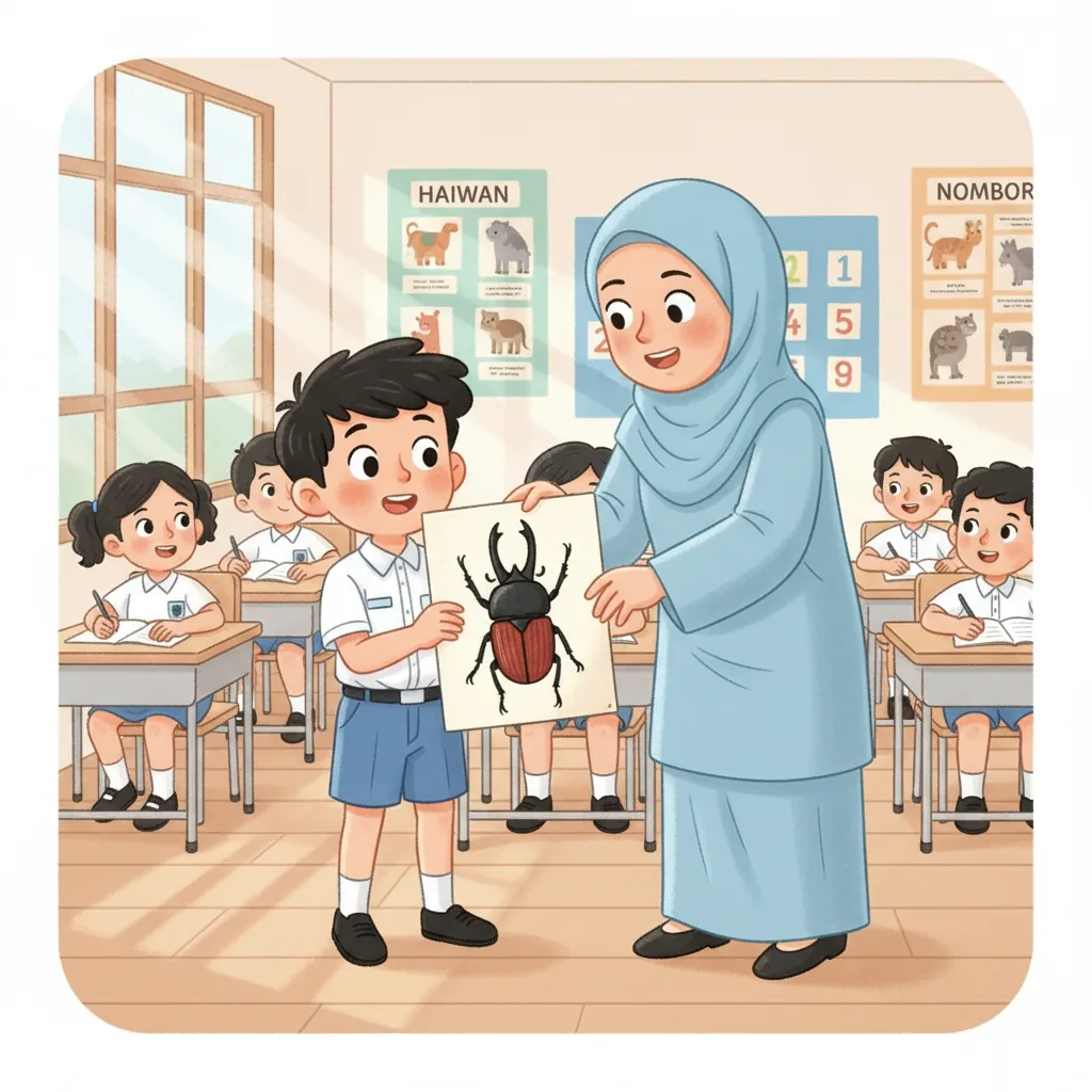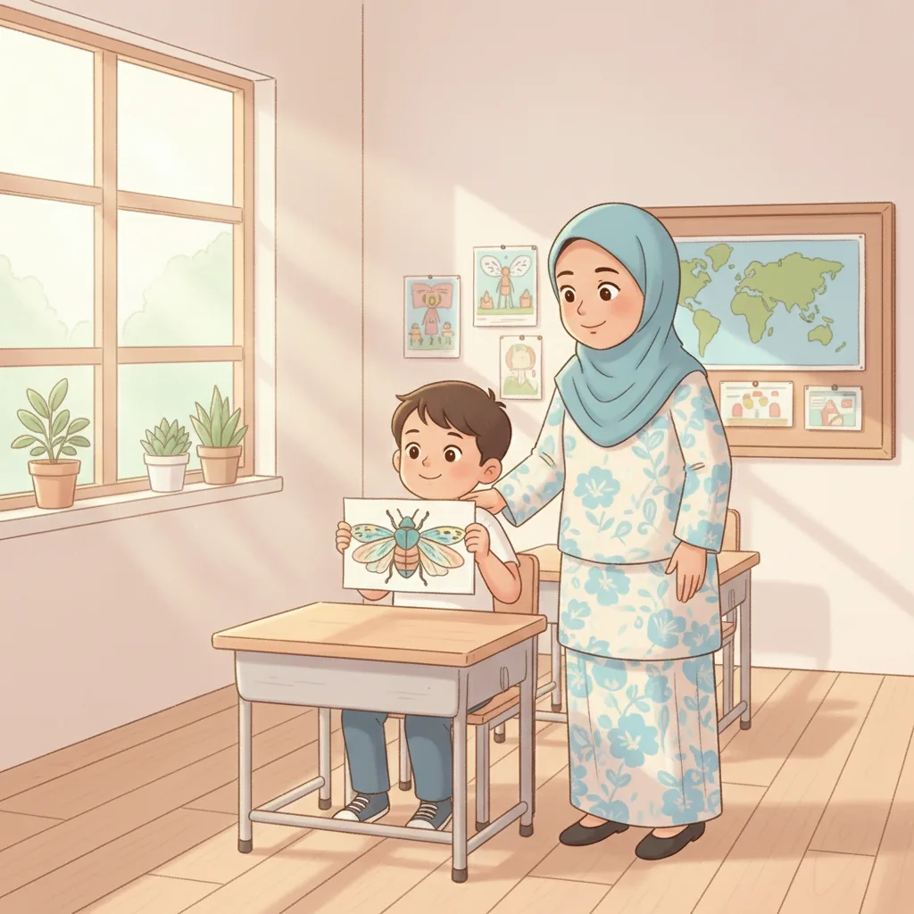 "content": "🧠 Topic: Thomas Learns to Play and Share in Malaysia \nComprehension Questions (Choose the Best Answer)\n\n1. What does Thomas love? \n A: Bugs ✅ \n B: Cars ❌\n\n2. How did Thomas feel when he went to school? \n A: Excited but a little nervous ✅ \n B: Sad and upset ❌\n\n3. What did Thomas want to talk about when his teacher was speaking? \n A: Ants ✅ \n B: Dinosaurs ❌\n\n4. What did Thomas do to feel calm? \n A: Played with a fidget toy ✅ \n B: Ran around the classroom ❌\n\n5. How did Thomas feel after sharing a fun fact about fruit flies? \n A: Happy ✅ \n B: Angry ❌\n\n6. What did Thomas ask his friends at recess? \n A: \"Can I join?\" ✅ \n B: \"Can I leave?\" ❌\n\n7. What did Thomas learn about sharing and waiting? \n A: It helps him have fun with friends ✅ \n B: It makes him feel lonely ❌",