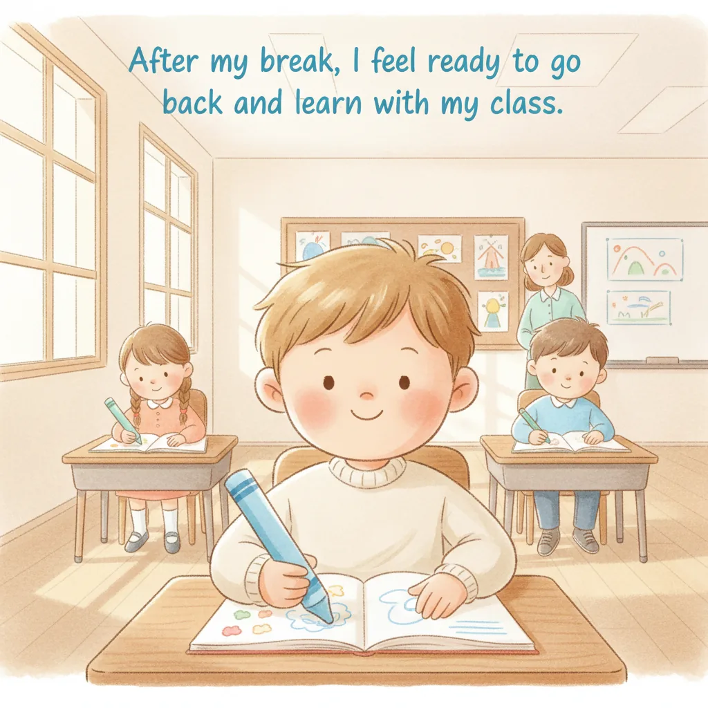 "content": "✏️ Vocabulary:\n\n1. **Excited**\n - Feeling very happy and eager about something\n\n2. **Nervous**\n - Feeling a little worried or unsure about what will happen\n\n3. **Proud**\n - Feeling good about something you did\n\n4. **Calm**\n - Feeling relaxed and not upset\n\n5. **Share**\n - Letting others use what you have or talking about something with others\n\n6. **Join**\n - To become part of a group or activity\n\n7. **Wait**\n - Staying patient until it is your turn\n\n8. **Friend**\n - Someone you like and have fun with",