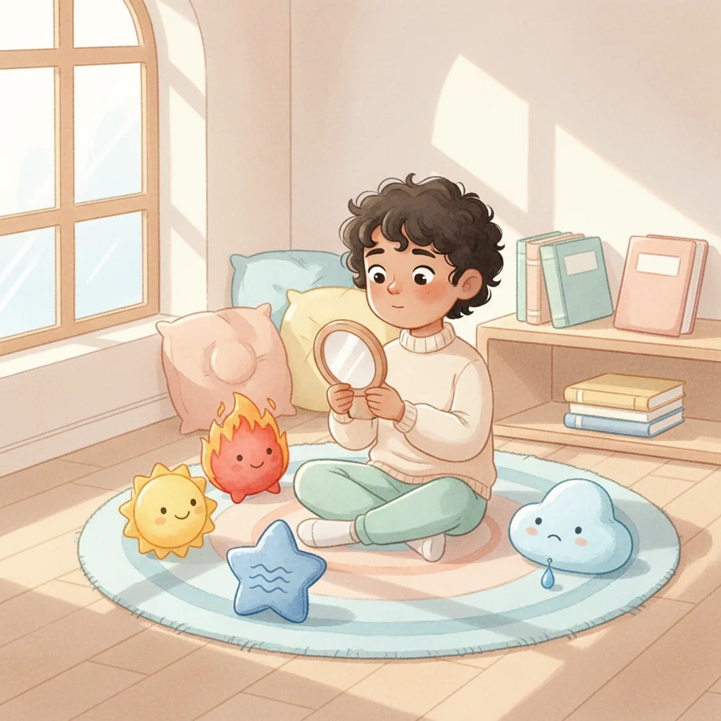 "es": "✏️ Vocabulary:\n\n\n1. **Sentimientos** \n- Emociones como feliz, triste o enojado dentro de ti\n\n2. **Feliz** \n- Sentirse bien y querer sonreír o jugar\n\n3. **Triste**\n- Sentirse mal y a veces querer llorar o recibir un abrazo\n\n4. **Enojado**\n- Sentirse molesto y querer gritar o pisar fuerte\n\n5. **Asustado**\n- Sentirse con miedo, como querer esconderse\n\n6. **Respirar**\n- Tomar aire dentro y fuera para ayudarte a calmarte\n\n7. **Seguro**\n- Sentirse protegido y no estar en peligro\n\n8. **Entender**\n- Saber lo que alguien siente o piensa",