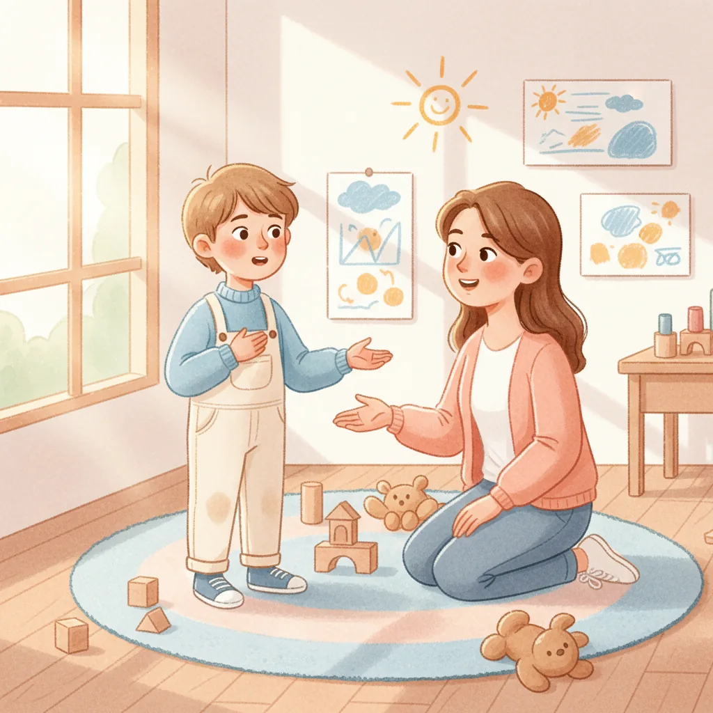 "es": "Texto: Puedo decirle a alguien cómo me siento. Decir \"Estoy feliz\" o \"Estoy triste\" ayuda a los demás a entenderme.",