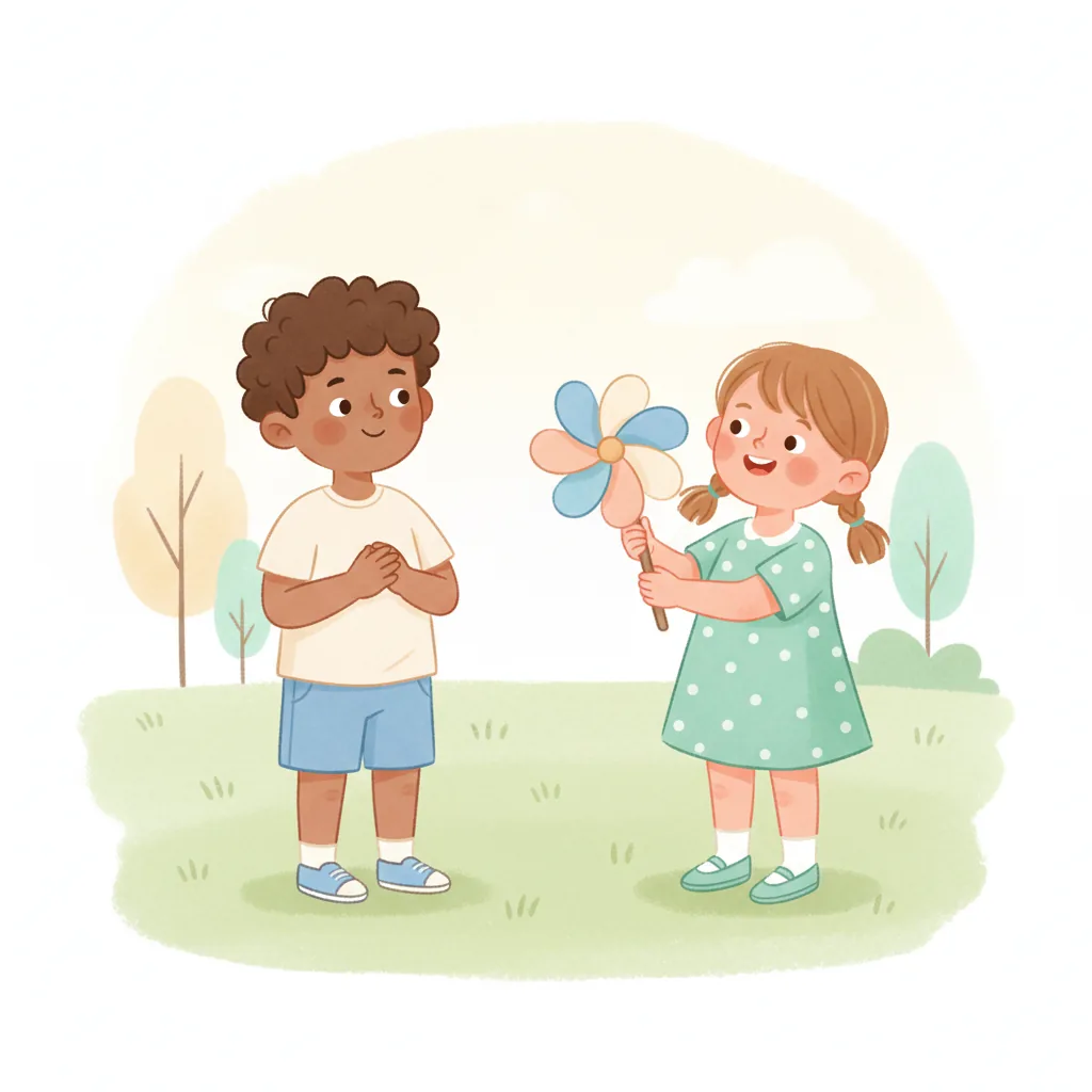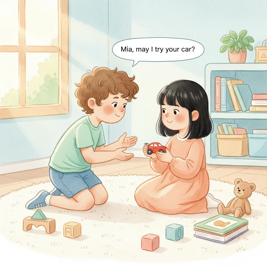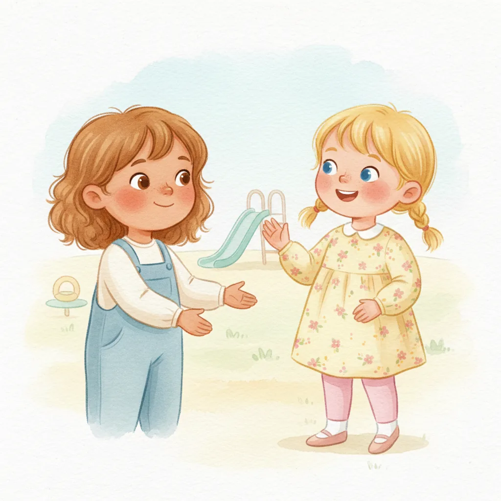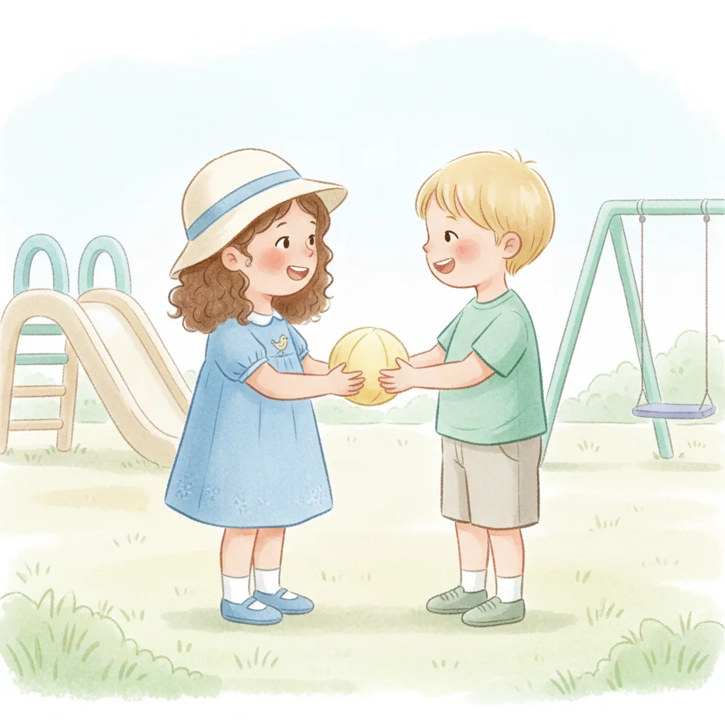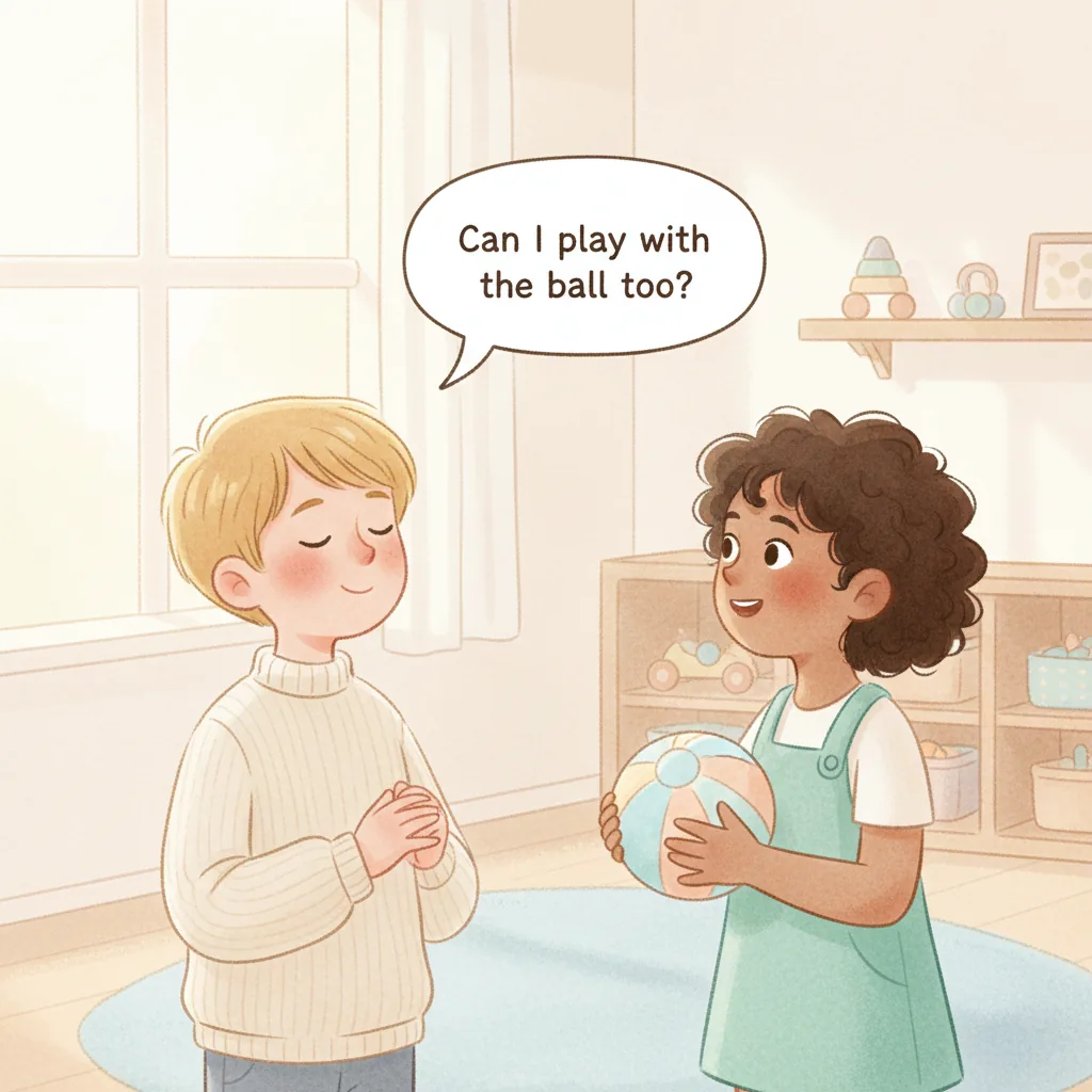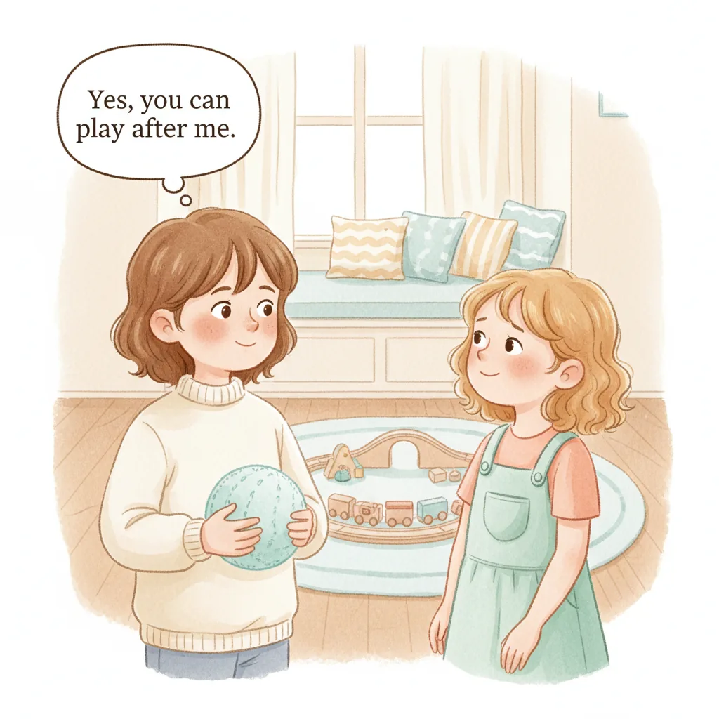 "content": "**Scenario 1** \nPretend the child sees a friend with a toy they want to play with. \nPractice approaching the friend and saying, \"Can I play with you?\" while feeling hopeful. \nThe friend can respond, \"Sure, let's take turns!\" and they both feel happy.\n\n**Scenario 2** \nAct out a situation where the child is waiting to use the swing. \nPractice watching the friend on the swing and saying, \"I can wait for my turn,\" feeling patient and calm. \nWhen the friend finishes, they say, \"Your turn!\" and the child feels excited and proud.\n\n**Scenario 3** \nPretend the child and a friend are playing catch. \nPractice saying, \"Your turn,\" after throwing the ball, and feeling joy when the friend catches it and says, \"Thank you!\" \nThey both smile and giggle, enjoying the game together.",