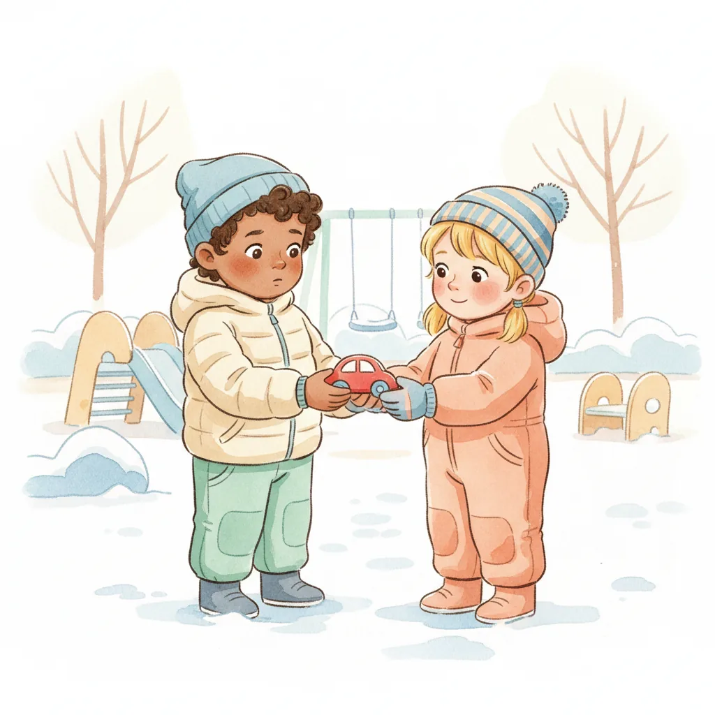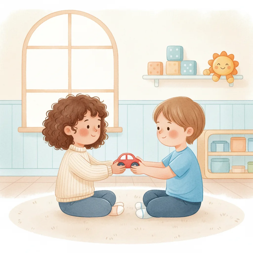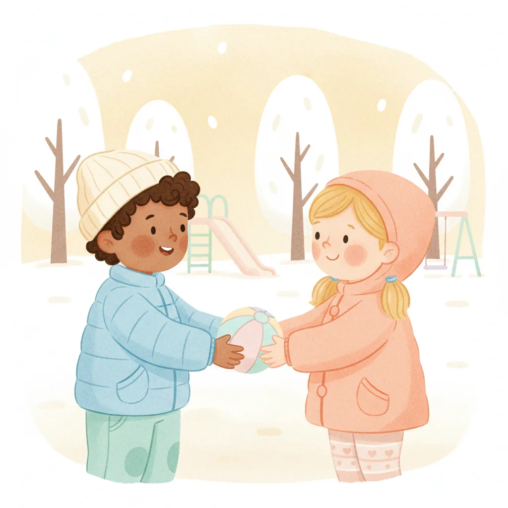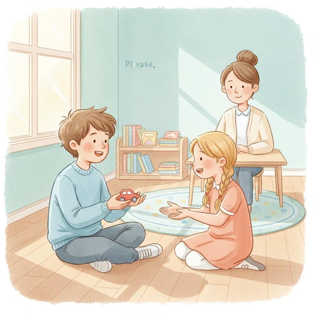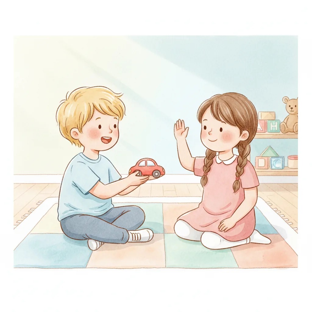 "content": "**Scenario 1** \nPretend the child sees a friend with a toy they want to play with. \nPractice approaching the friend and saying, \"Can I play with you?\" while feeling hopeful. \nThe friend can respond, \"Sure, let's take turns!\" and they both feel happy.\n\n**Scenario 2** \nAct out a situation where the child is waiting to use the swing. \nPractice watching the friend on the swing and saying, \"I can wait for my turn,\" feeling patient and calm. \nWhen the friend finishes, they say, \"Your turn!\" and the child feels excited and proud.\n\n**Scenario 3** \nPretend the child and a friend are playing catch. \nPractice saying, \"Your turn,\" after throwing the ball, and feeling joy when the friend catches it and says, \"Thank you!\" \nThey both smile and giggle, enjoying the game together.",