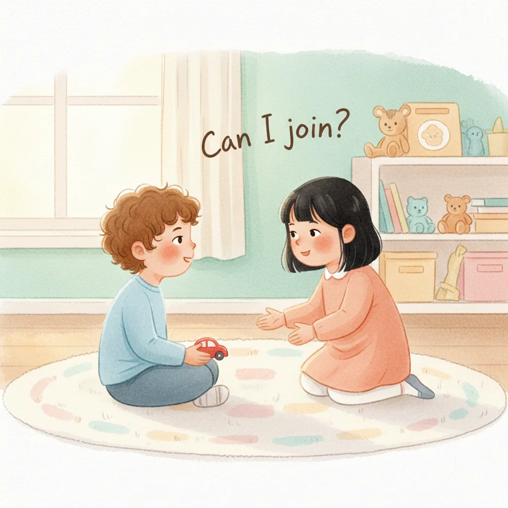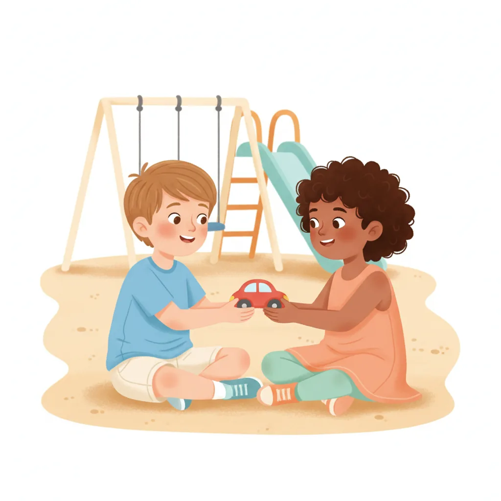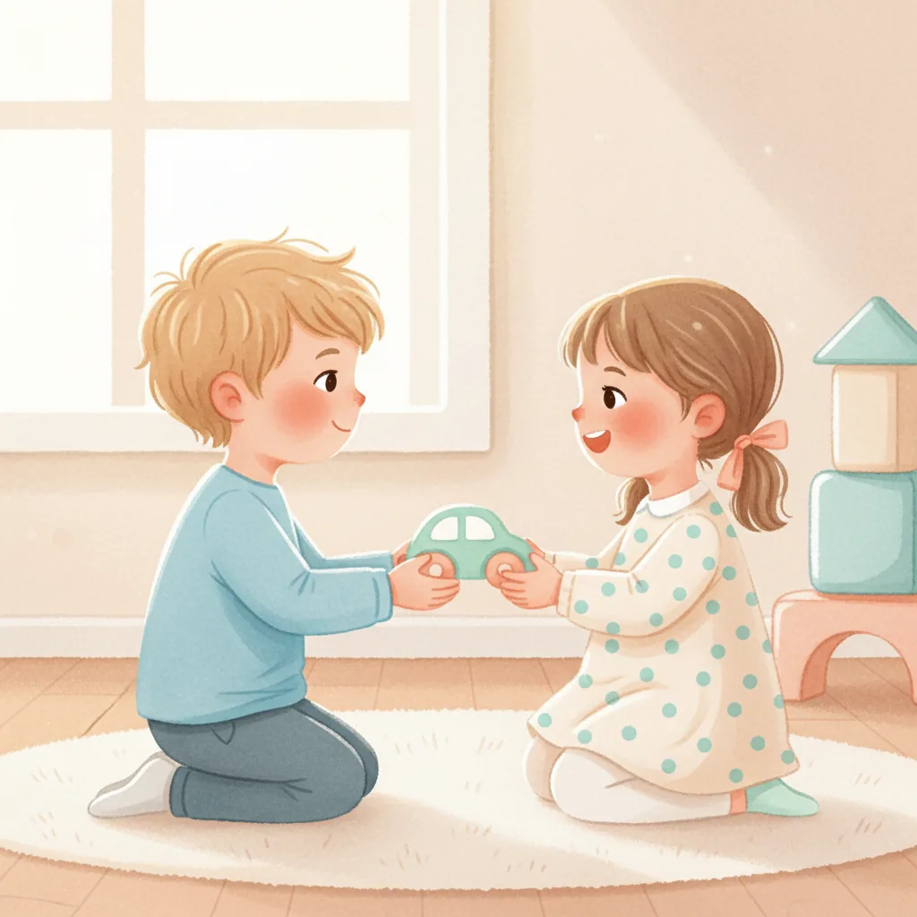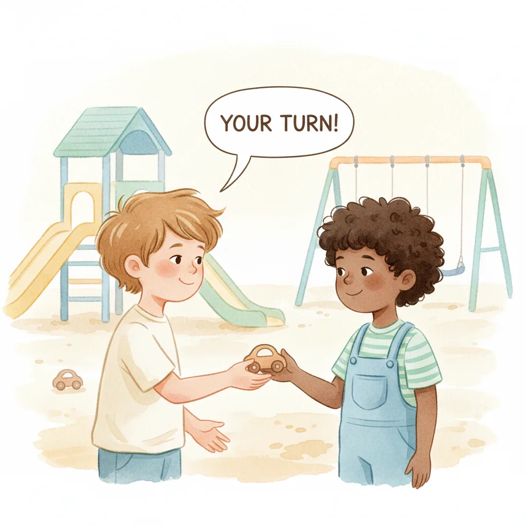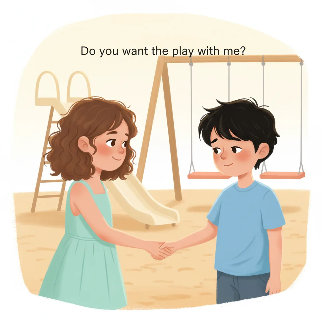 "content": "**Scenario 1** \nPretend the child is with a friend who seems sad. \nPractice asking, \"Do you want to play with me?\" — with a caring tone, feeling concerned and hopeful.\n\n**Scenario 2** \nAct out a situation where the child is gently petting a stuffed animal. \nPractice using gentle hands and saying, \"You are such a good pet!\" — feeling calm and gentle.\n\n**Scenario 3** \nPretend the child and a friend are taking turns with a toy. \nPractice saying, \"Your turn!\" with a smile — feeling happy and sharing.",