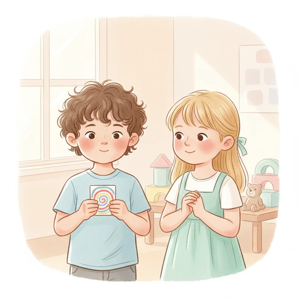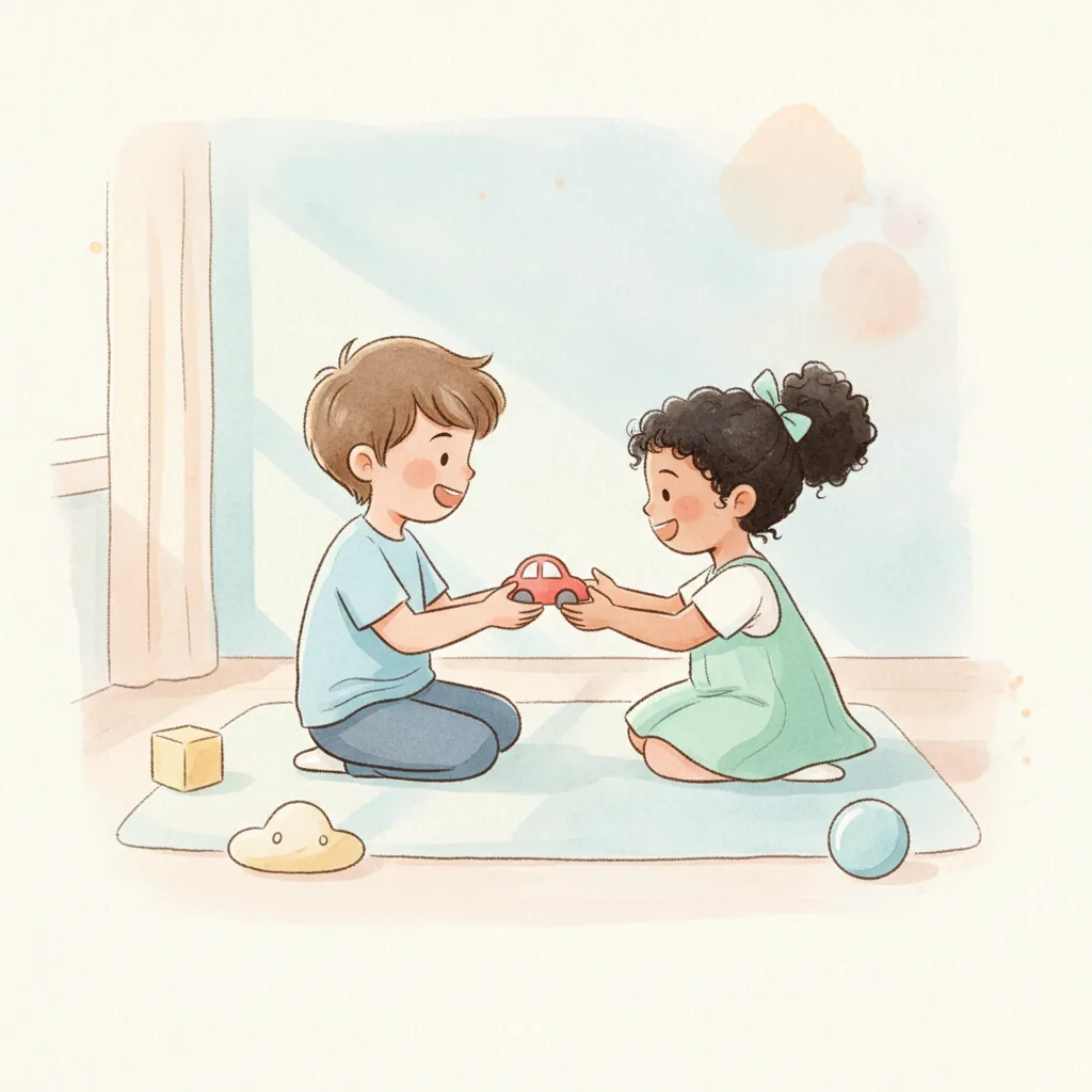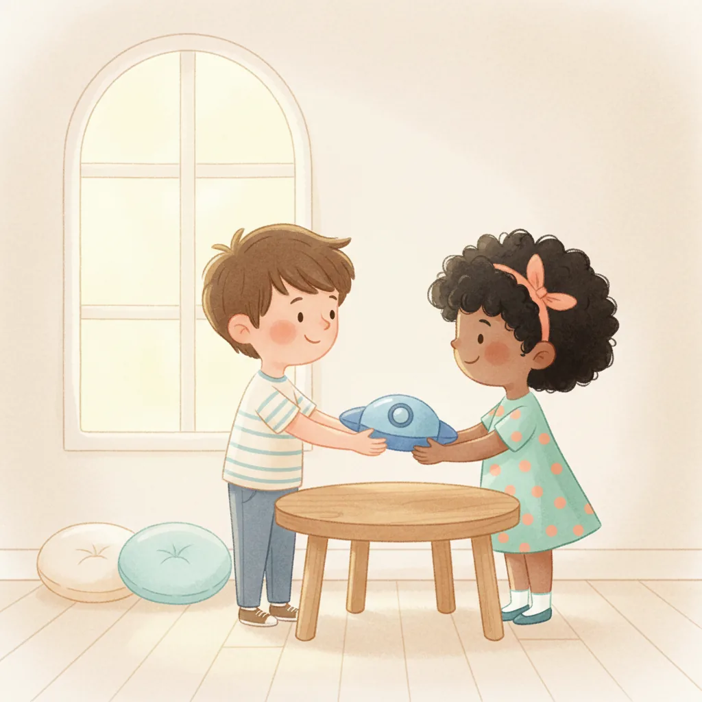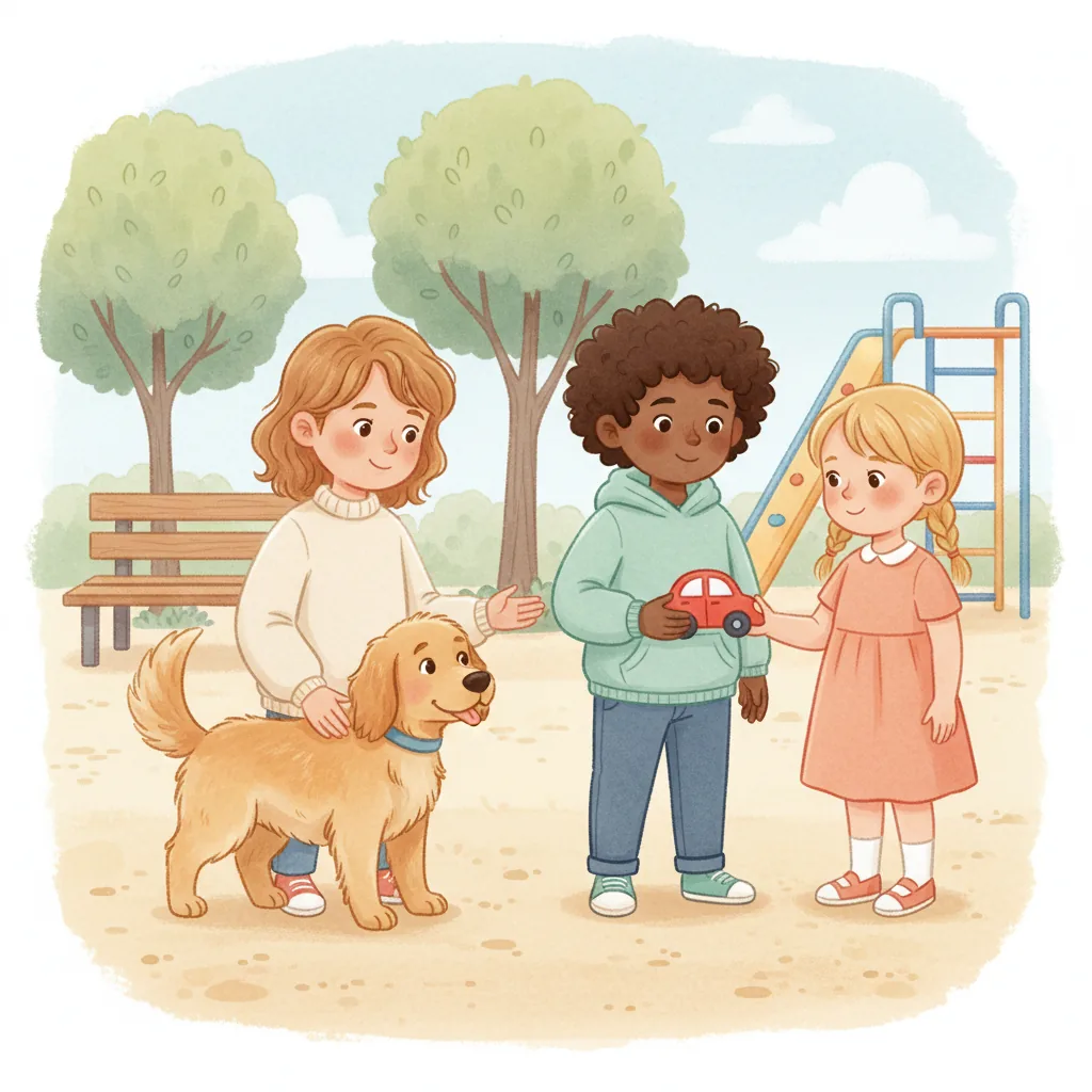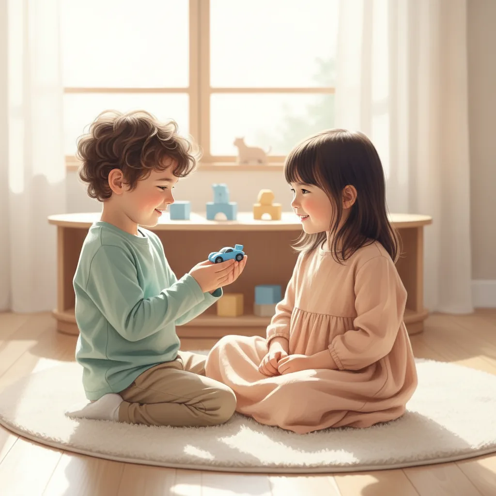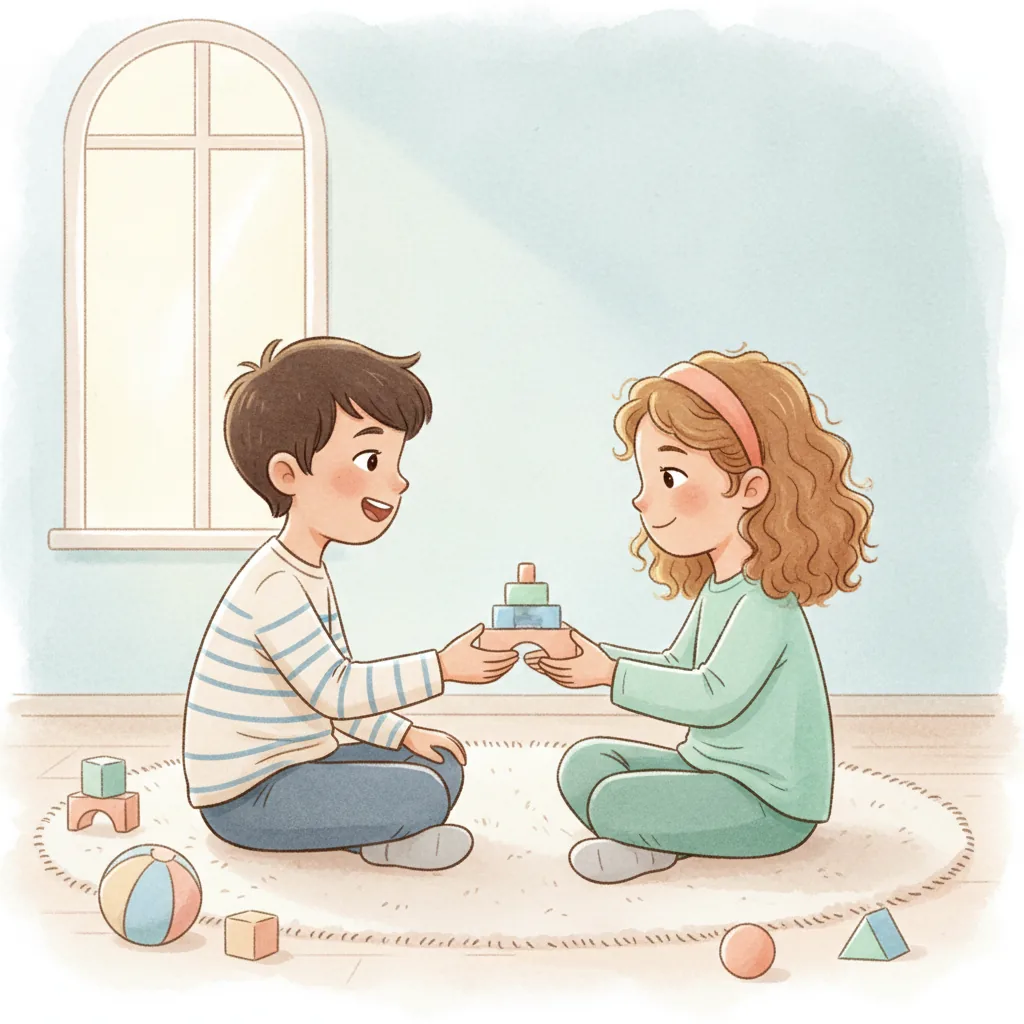 "content": "**Scenario 1** \nPretend the child is with a friend who seems sad. \nPractice asking, \"Do you want to play with me?\" — with a caring tone, feeling concerned and hopeful.\n\n**Scenario 2** \nAct out a situation where the child is gently petting a stuffed animal. \nPractice using gentle hands and saying, \"You are such a good pet!\" — feeling calm and gentle.\n\n**Scenario 3** \nPretend the child and a friend are taking turns with a toy. \nPractice saying, \"Your turn!\" with a smile — feeling happy and sharing.",