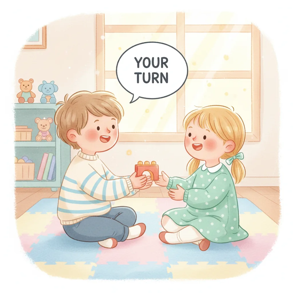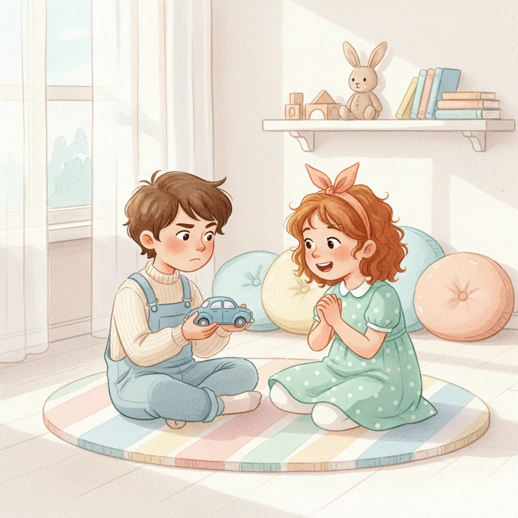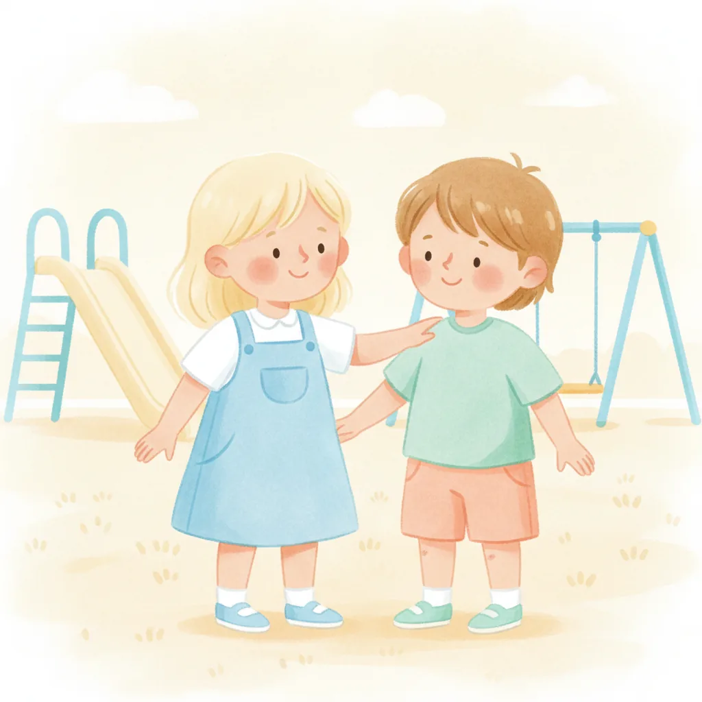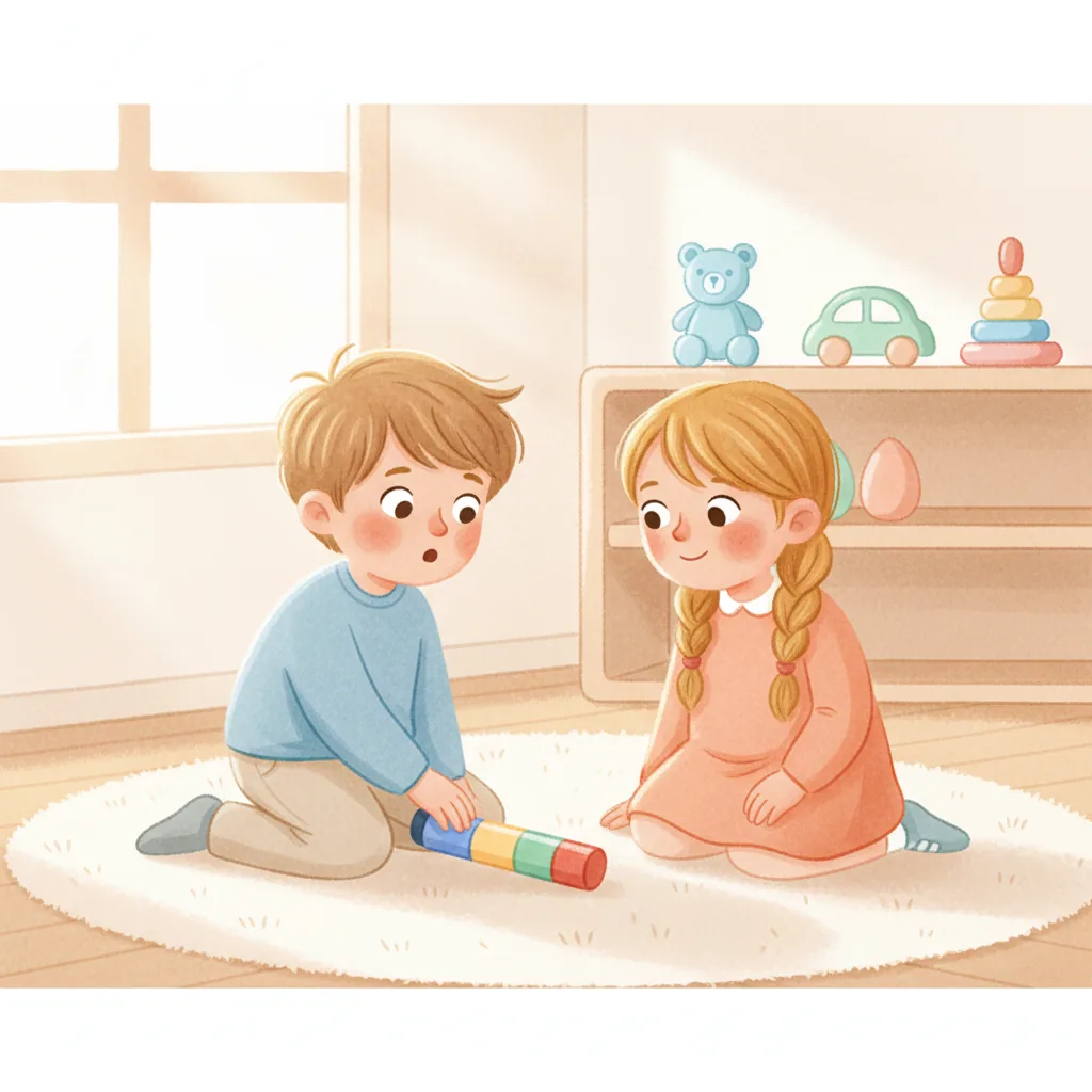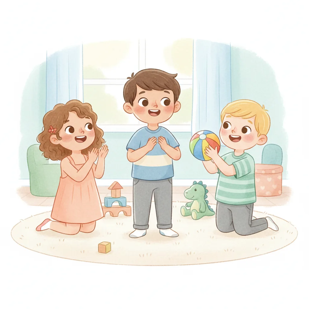 "content": "**Scenario 1** \nPretend the child is with a friend who seems sad. \nPractice asking, \"Do you want to play with me?\" — with a caring tone, feeling concerned and hopeful.\n\n**Scenario 2** \nAct out a situation where the child is gently petting a stuffed animal. \nPractice using gentle hands and saying, \"You are such a good pet!\" — feeling calm and gentle.\n\n**Scenario 3** \nPretend the child and a friend are taking turns with a toy. \nPractice saying, \"Your turn!\" with a smile — feeling happy and sharing.",