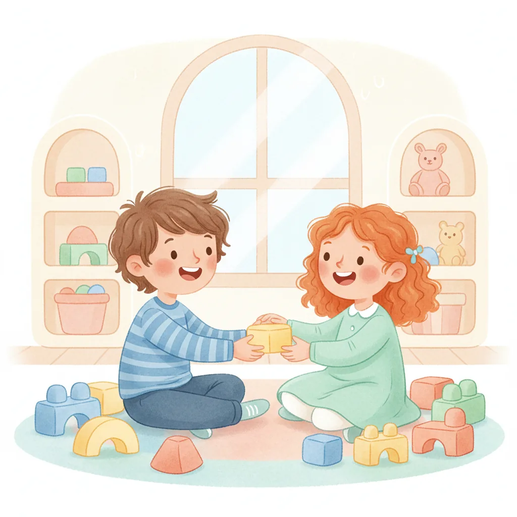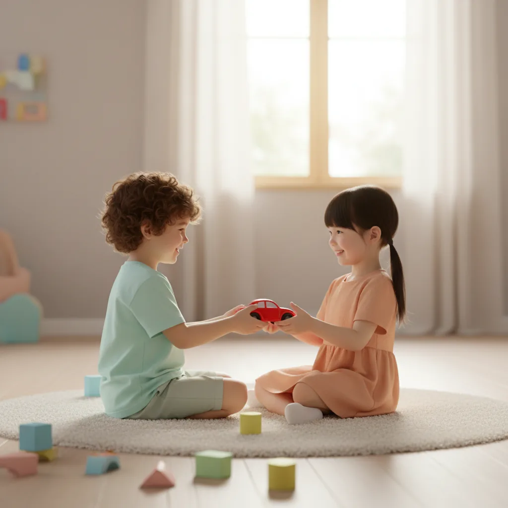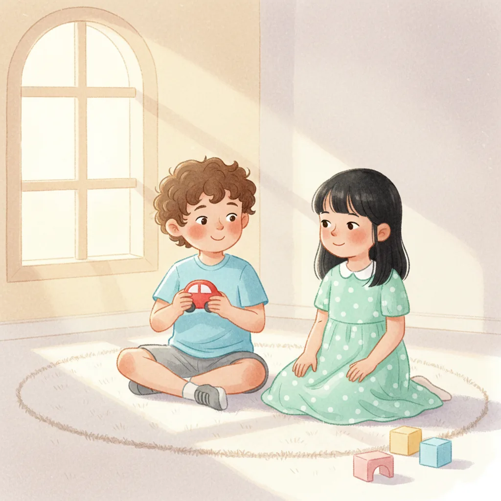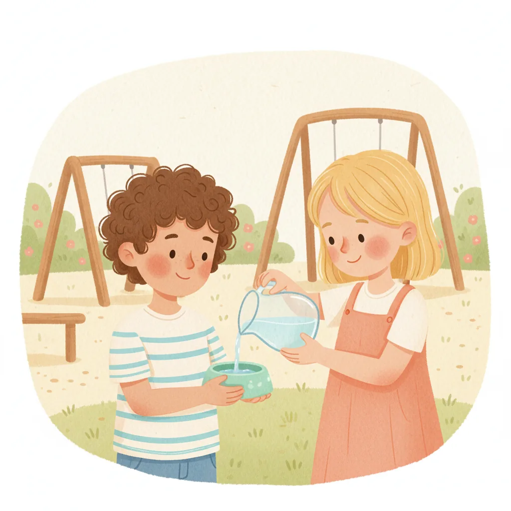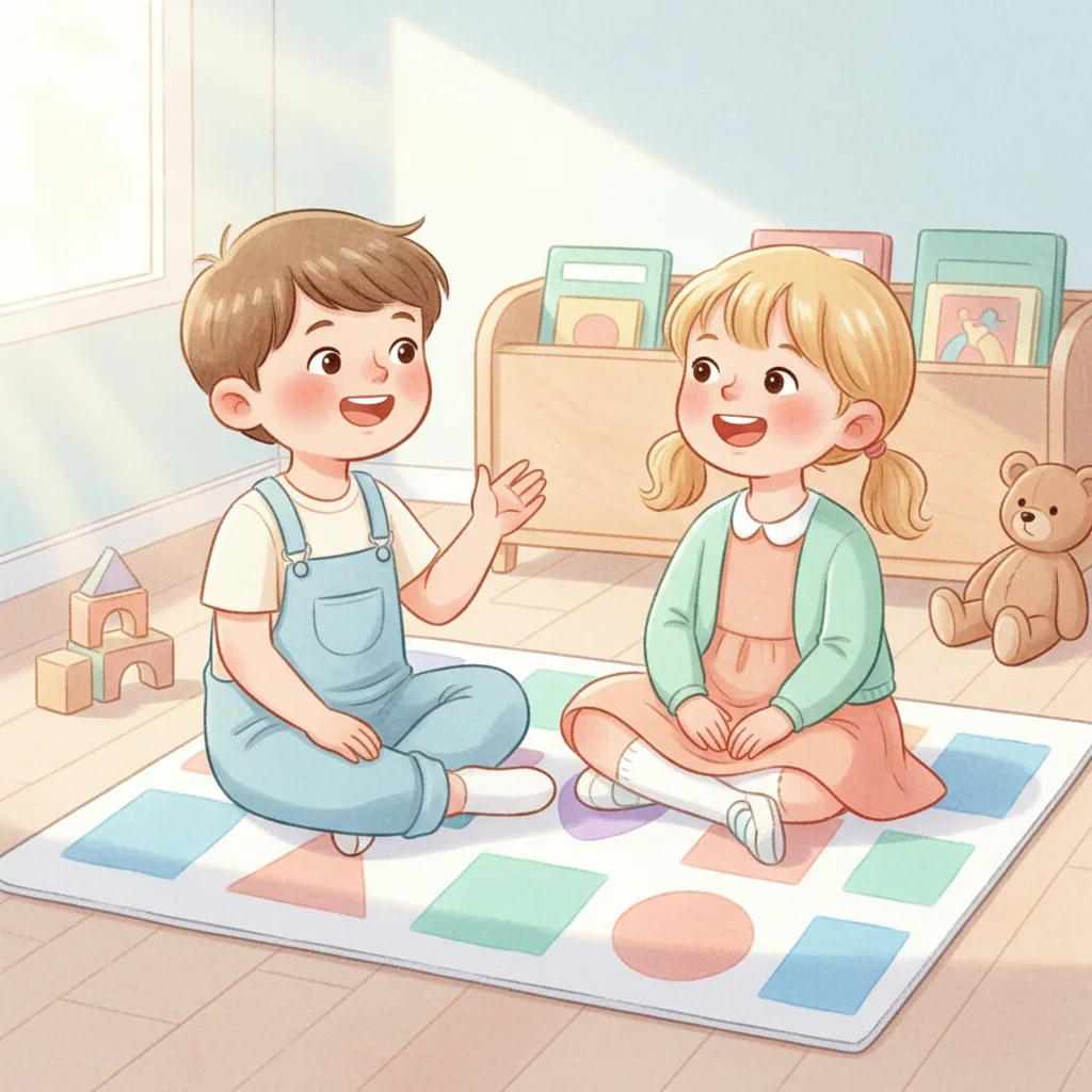 "content": "**Scenario 1** \nPretend the child is with a friend who seems sad. \nPractice asking, \"Do you want to play with me?\" — with a caring tone, feeling concerned and hopeful.\n\n**Scenario 2** \nAct out a situation where the child is gently petting a stuffed animal. \nPractice using gentle hands and saying, \"You are such a good pet!\" — feeling calm and gentle.\n\n**Scenario 3** \nPretend the child and a friend are taking turns with a toy. \nPractice saying, \"Your turn!\" with a smile — feeling happy and sharing.",