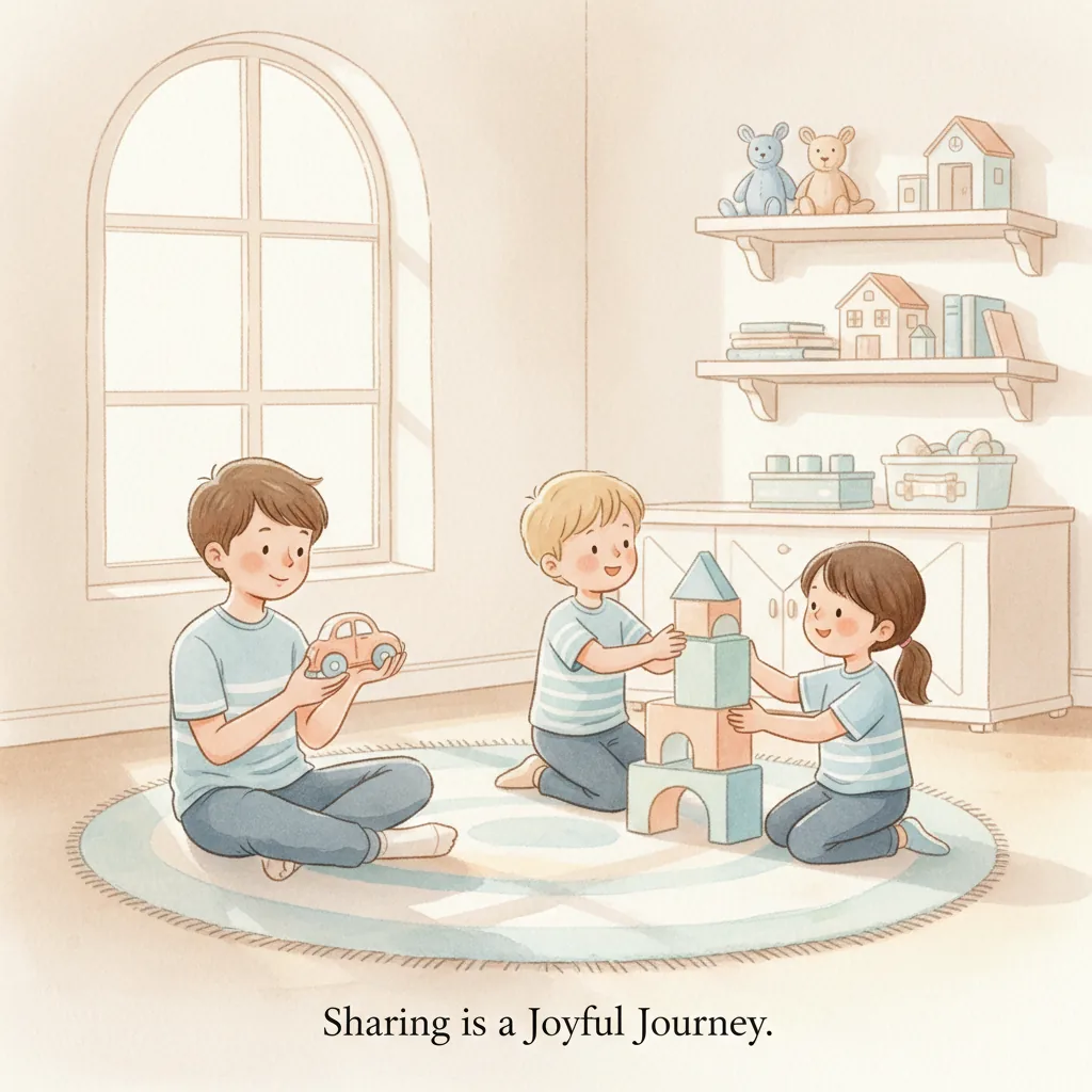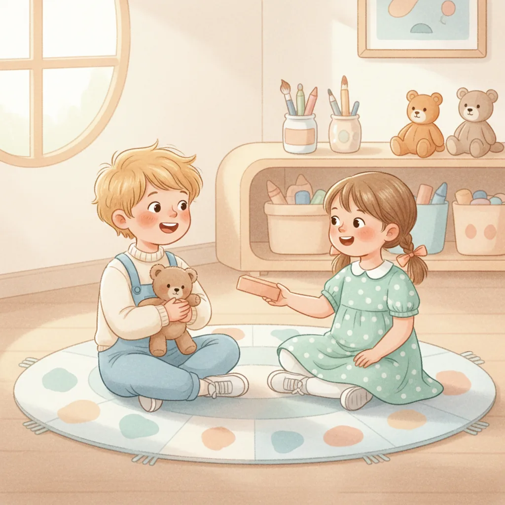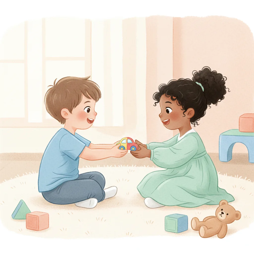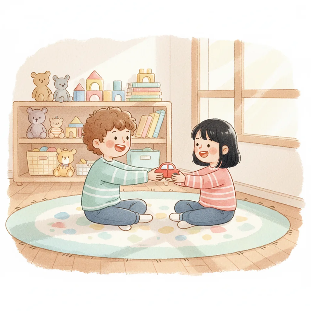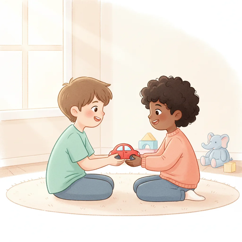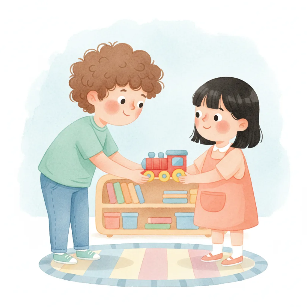 "content": "**Sharing Circle** \nGather a few toys (e.g., blocks, cars, dolls) and sit in a circle with the child and a few peers or family members. \nTake turns choosing a toy to play with for a short time, then say, \"Your turn!\" to pass it to the next person. \nEncourage everyone to share how it feels to take turns sharing toys.\n\n**Toy Sharing Storybook** \nHelp the child create a simple storybook by folding paper in half and drawing pictures. \nOn each page, illustrate scenes from the story, like asking to play, taking turns, and having fun. \nEncourage the child to add their feelings or thoughts to each page, such as \"I felt happy sharing!\"",