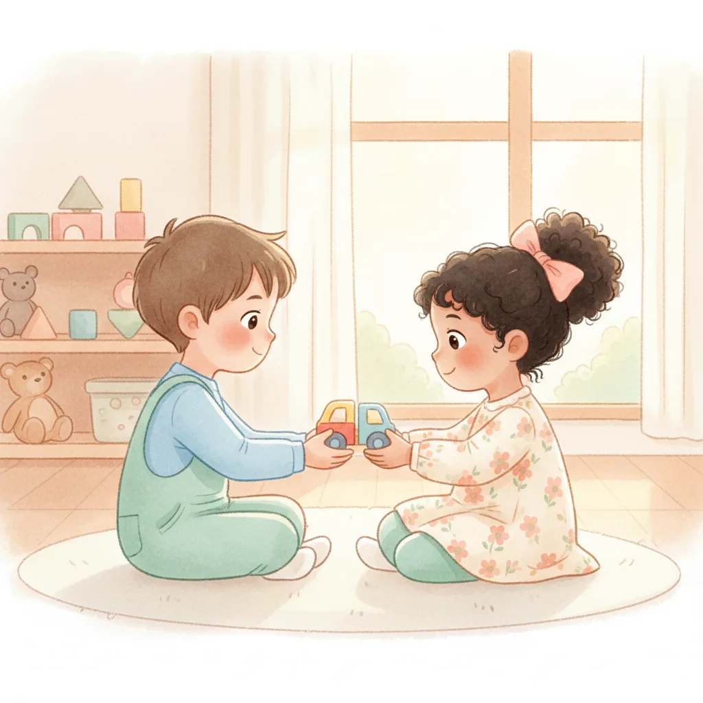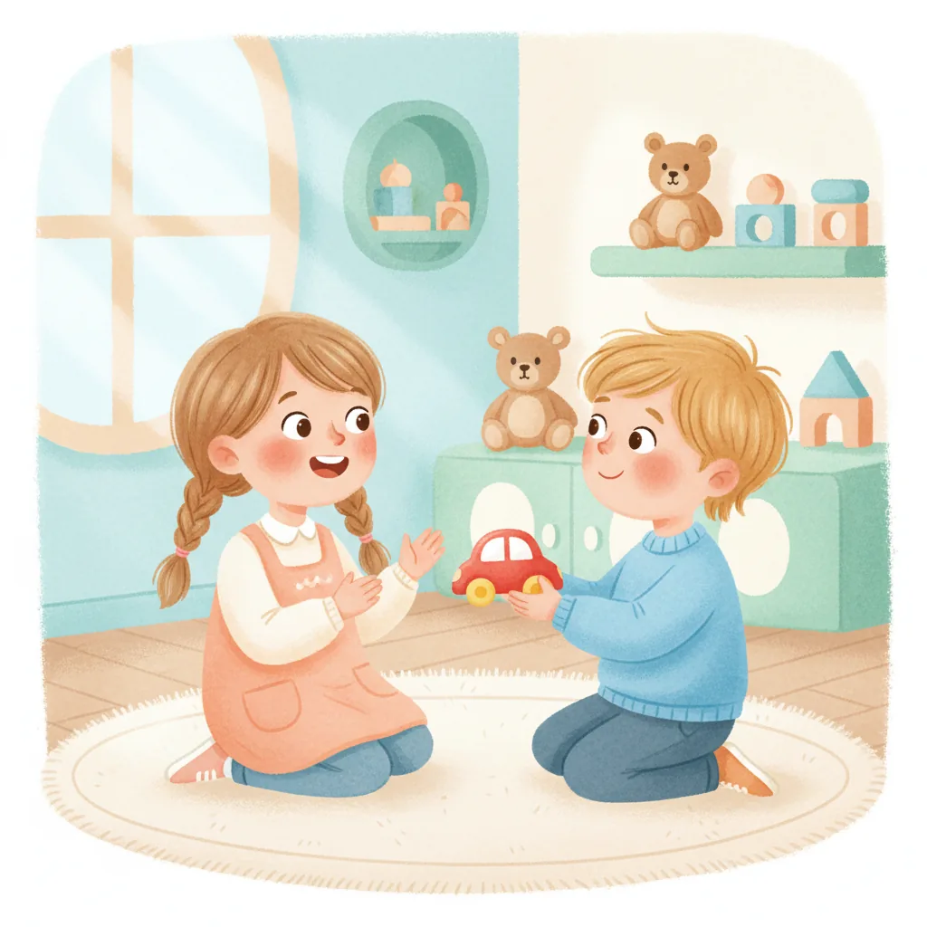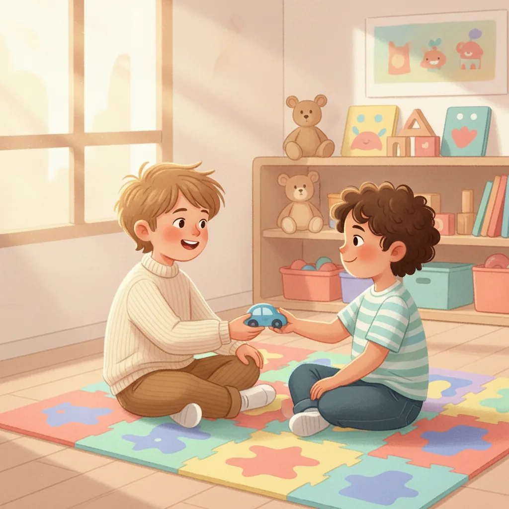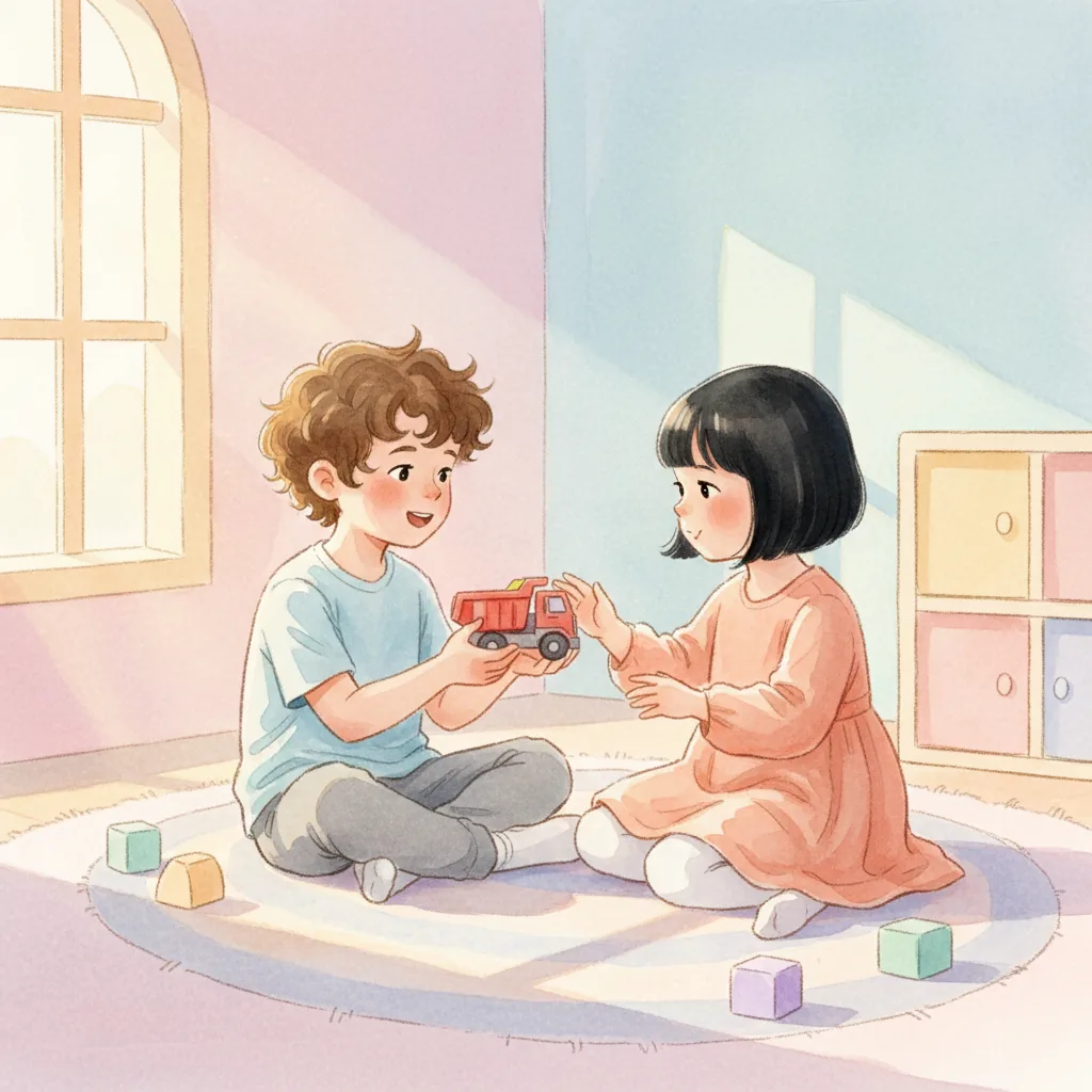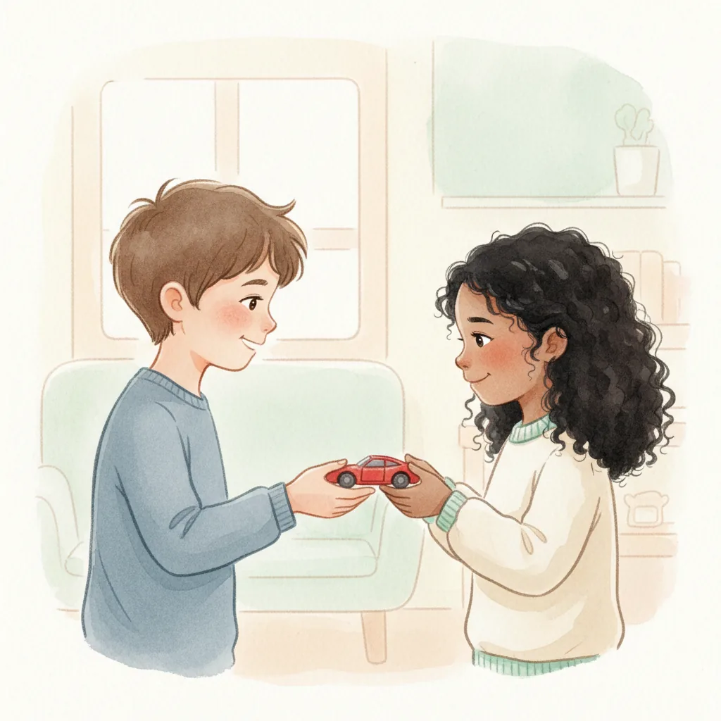 "content": "**Sharing Circle** \nGather a few toys (e.g., blocks, cars, dolls) and sit in a circle with the child and a few peers or family members. \nTake turns choosing a toy to play with for a short time, then say, \"Your turn!\" to pass it to the next person. \nEncourage everyone to share how it feels to take turns sharing toys.\n\n**Toy Sharing Storybook** \nHelp the child create a simple storybook by folding paper in half and drawing pictures. \nOn each page, illustrate scenes from the story, like asking to play, taking turns, and having fun. \nEncourage the child to add their feelings or thoughts to each page, such as \"I felt happy sharing!\"",