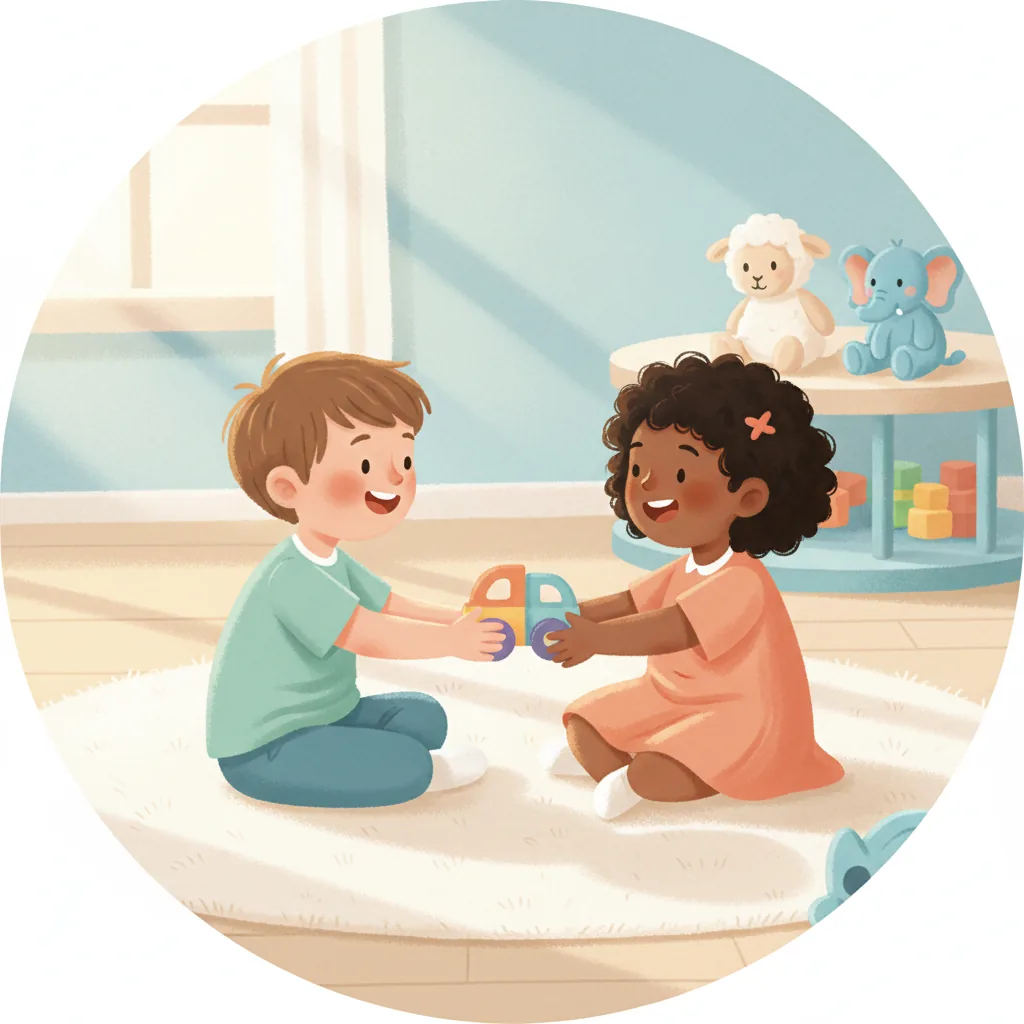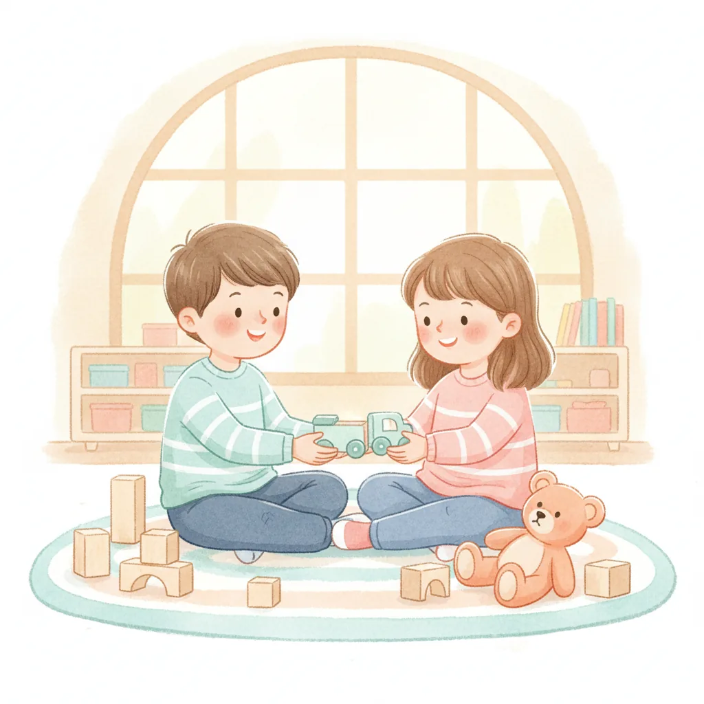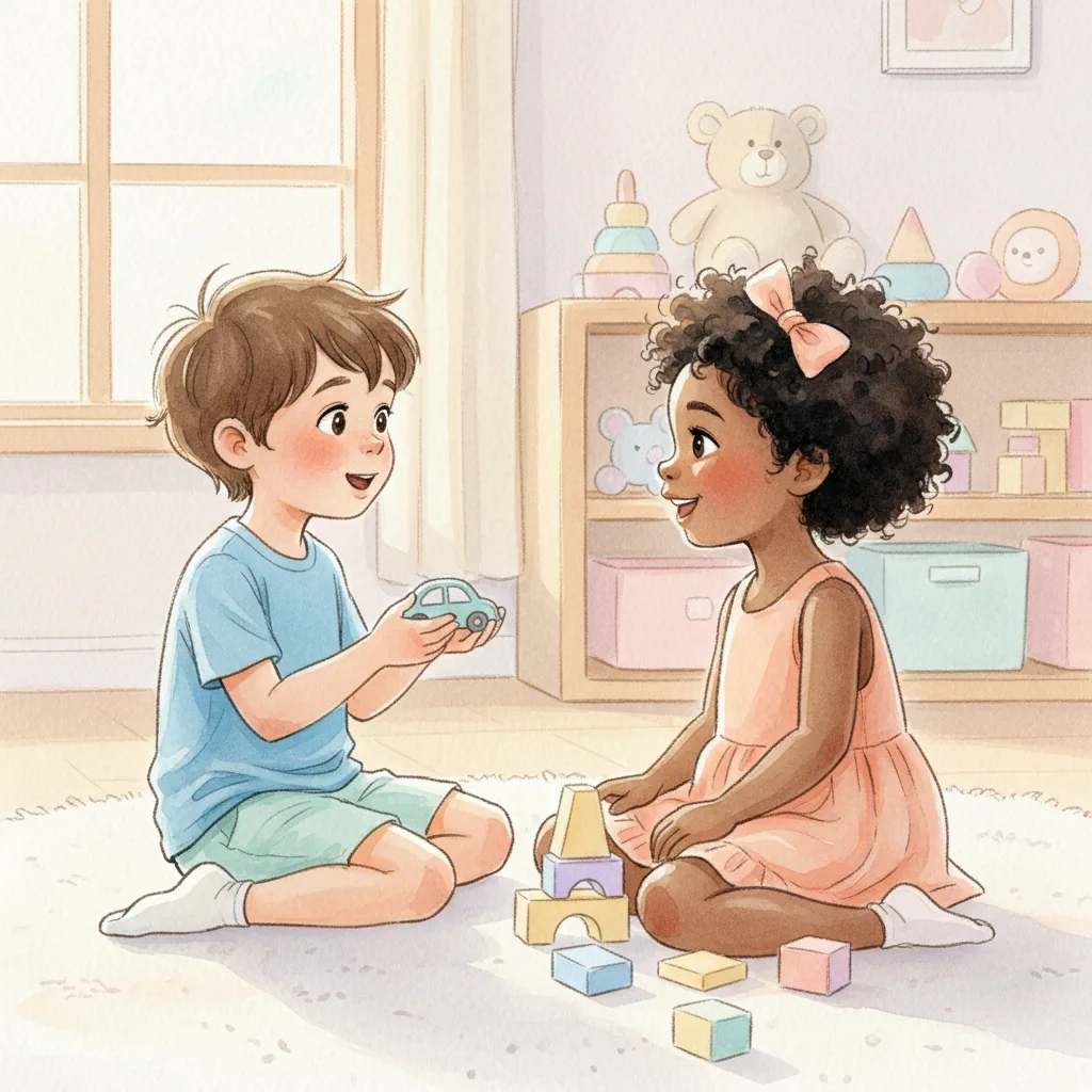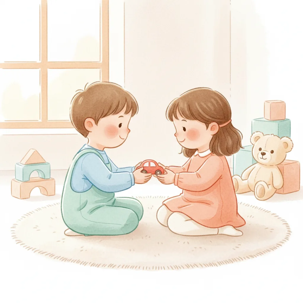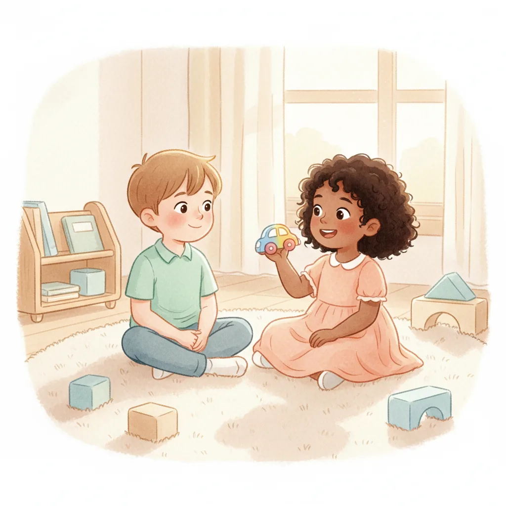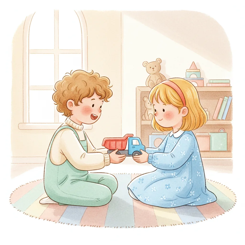 "content": "**Sharing Circle** \nGather a few toys (e.g., blocks, cars, dolls) and sit in a circle with the child and a few peers or family members. \nTake turns choosing a toy to play with for a short time, then say, \"Your turn!\" to pass it to the next person. \nEncourage everyone to share how it feels to take turns sharing toys.\n\n**Toy Sharing Storybook** \nHelp the child create a simple storybook by folding paper in half and drawing pictures. \nOn each page, illustrate scenes from the story, like asking to play, taking turns, and having fun. \nEncourage the child to add their feelings or thoughts to each page, such as \"I felt happy sharing!\"",