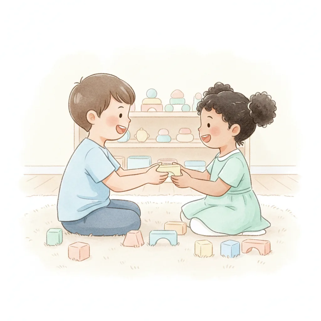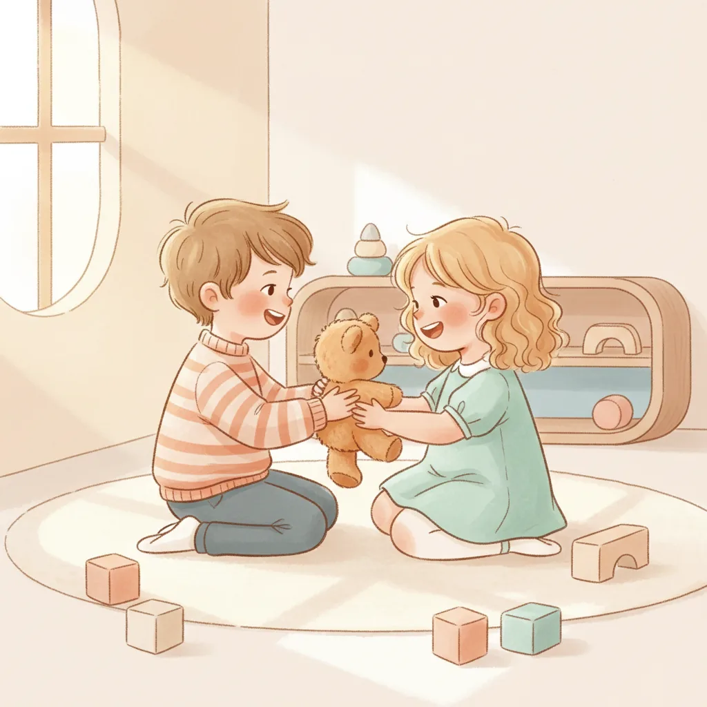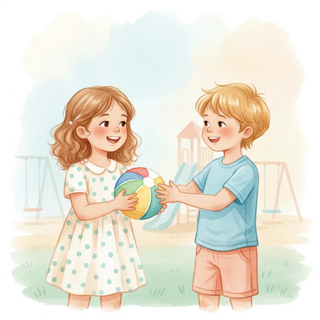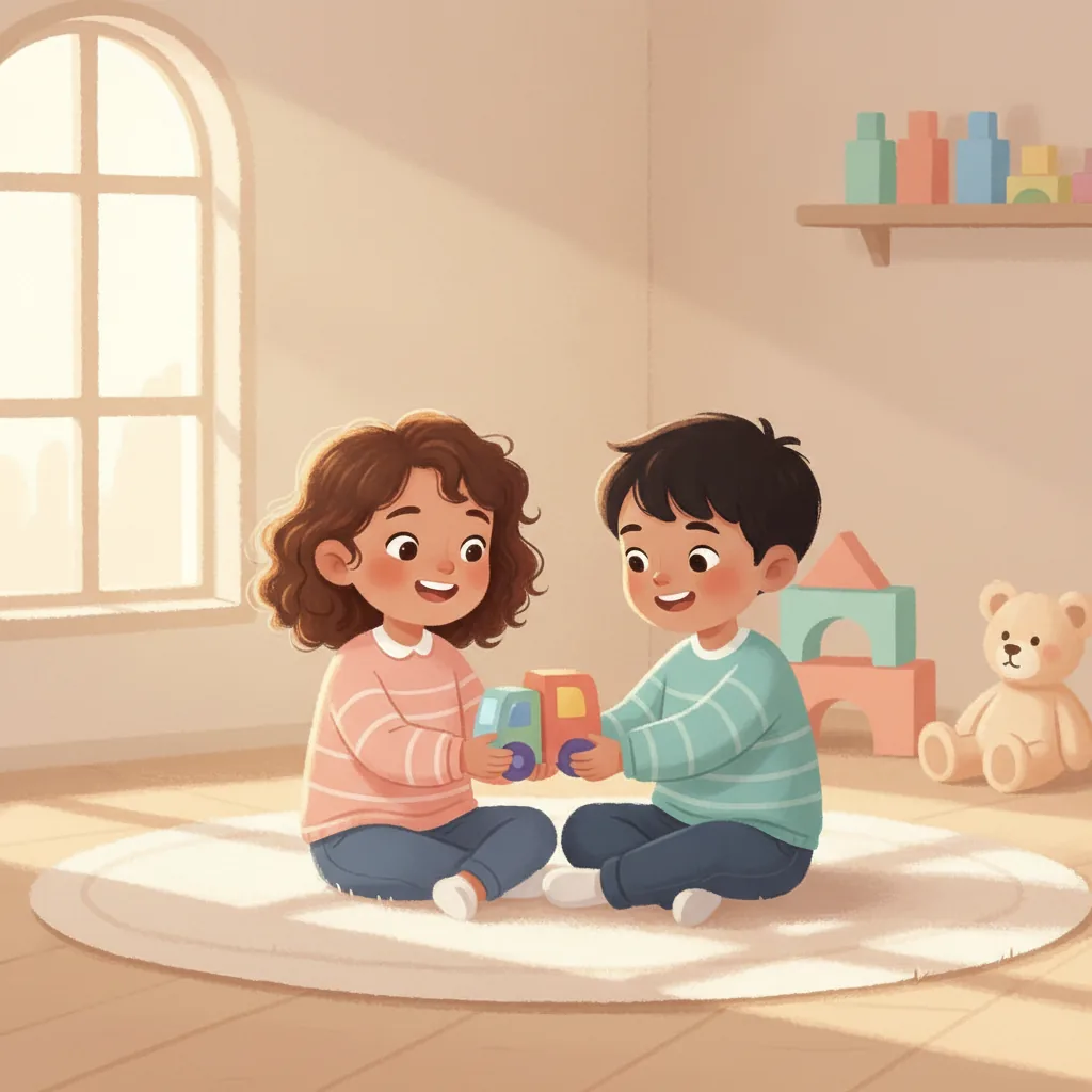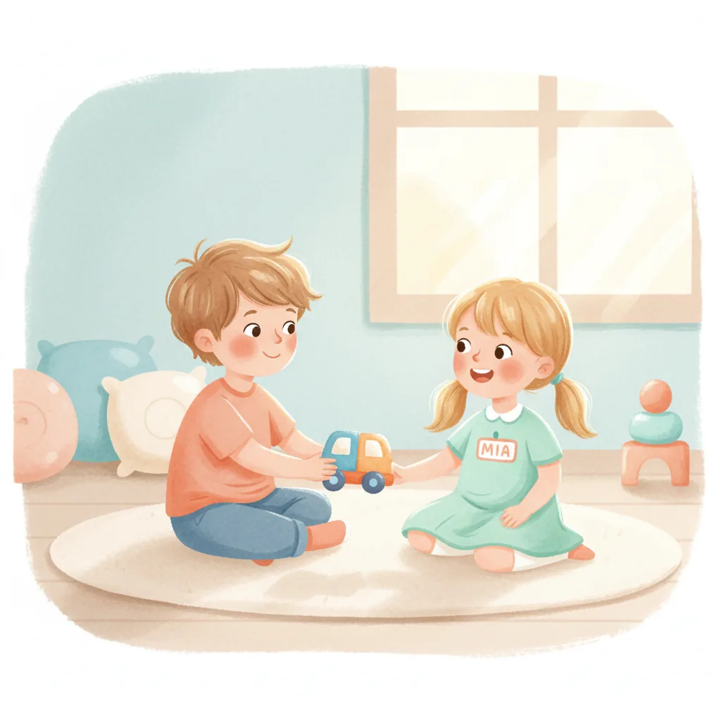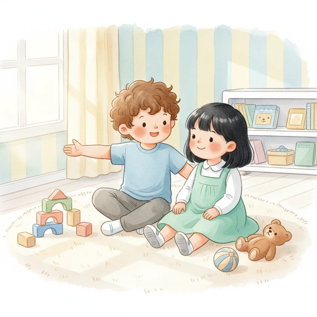 "content": "**Sharing Circle** \nGather a few toys (e.g., blocks, cars, dolls) and sit in a circle with the child and a few peers or family members. \nTake turns choosing a toy to play with for a short time, then say, \"Your turn!\" to pass it to the next person. \nEncourage everyone to share how it feels to take turns sharing toys.\n\n**Toy Sharing Storybook** \nHelp the child create a simple storybook by folding paper in half and drawing pictures. \nOn each page, illustrate scenes from the story, like asking to play, taking turns, and having fun. \nEncourage the child to add their feelings or thoughts to each page, such as \"I felt happy sharing!\"",