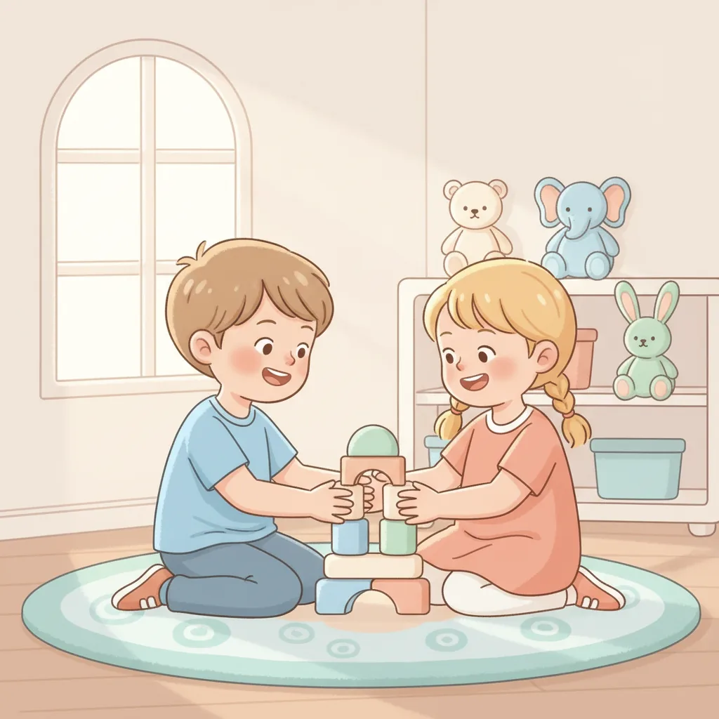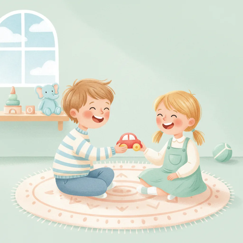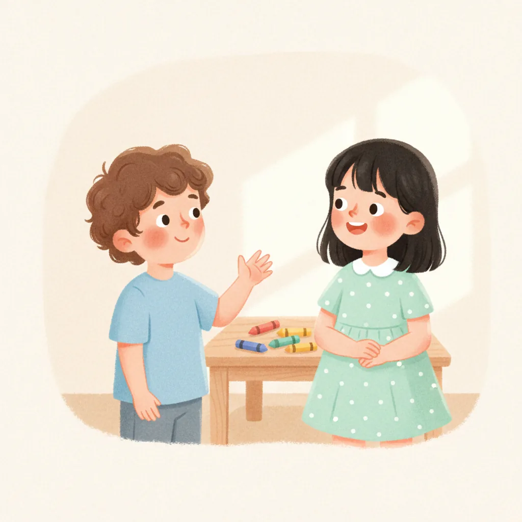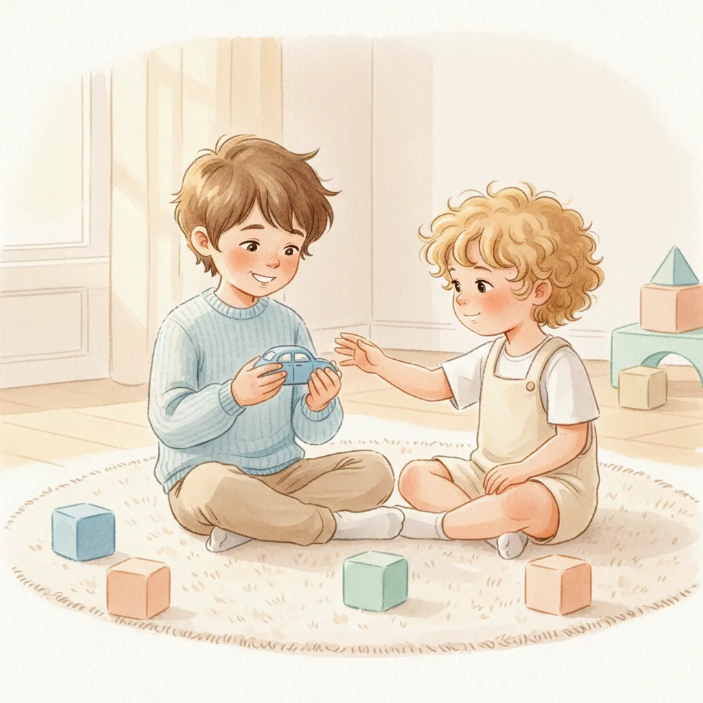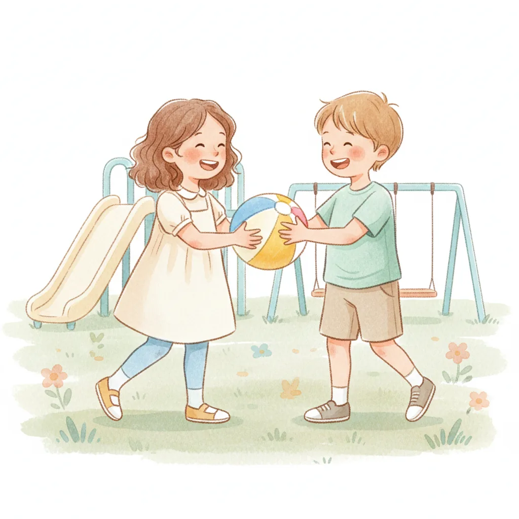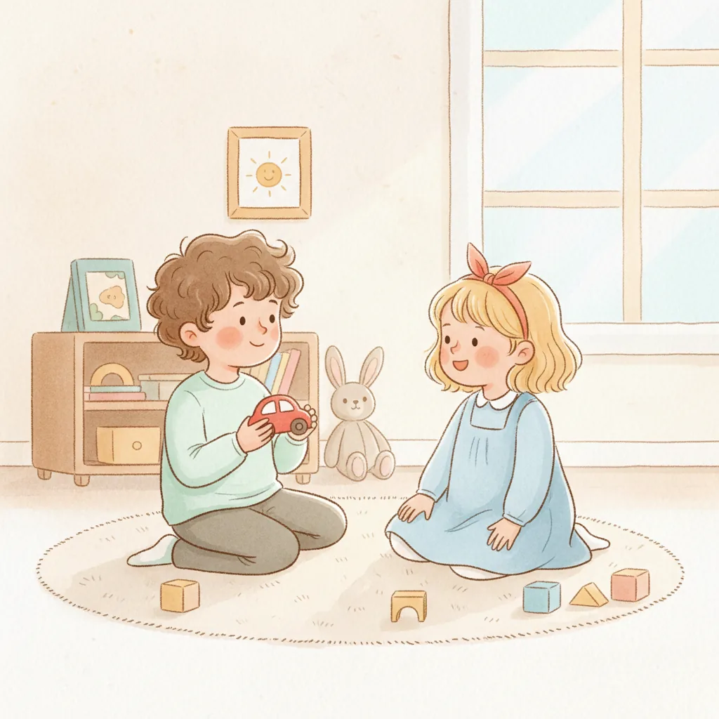 "content": "**Sharing Circle** \nGather a few toys (e.g., blocks, cars, dolls) and sit in a circle with the child and a few peers or family members. \nTake turns choosing a toy to play with for a short time, then say, \"Your turn!\" to pass it to the next person. \nEncourage everyone to share how it feels to take turns sharing toys.\n\n**Toy Sharing Storybook** \nHelp the child create a simple storybook by folding paper in half and drawing pictures. \nOn each page, illustrate scenes from the story, like asking to play, taking turns, and having fun. \nEncourage the child to add their feelings or thoughts to each page, such as \"I felt happy sharing!\"",