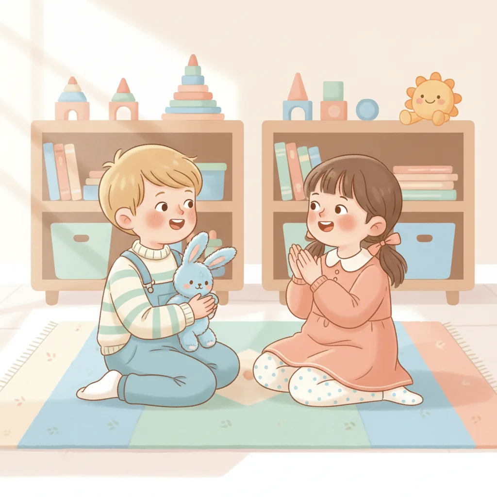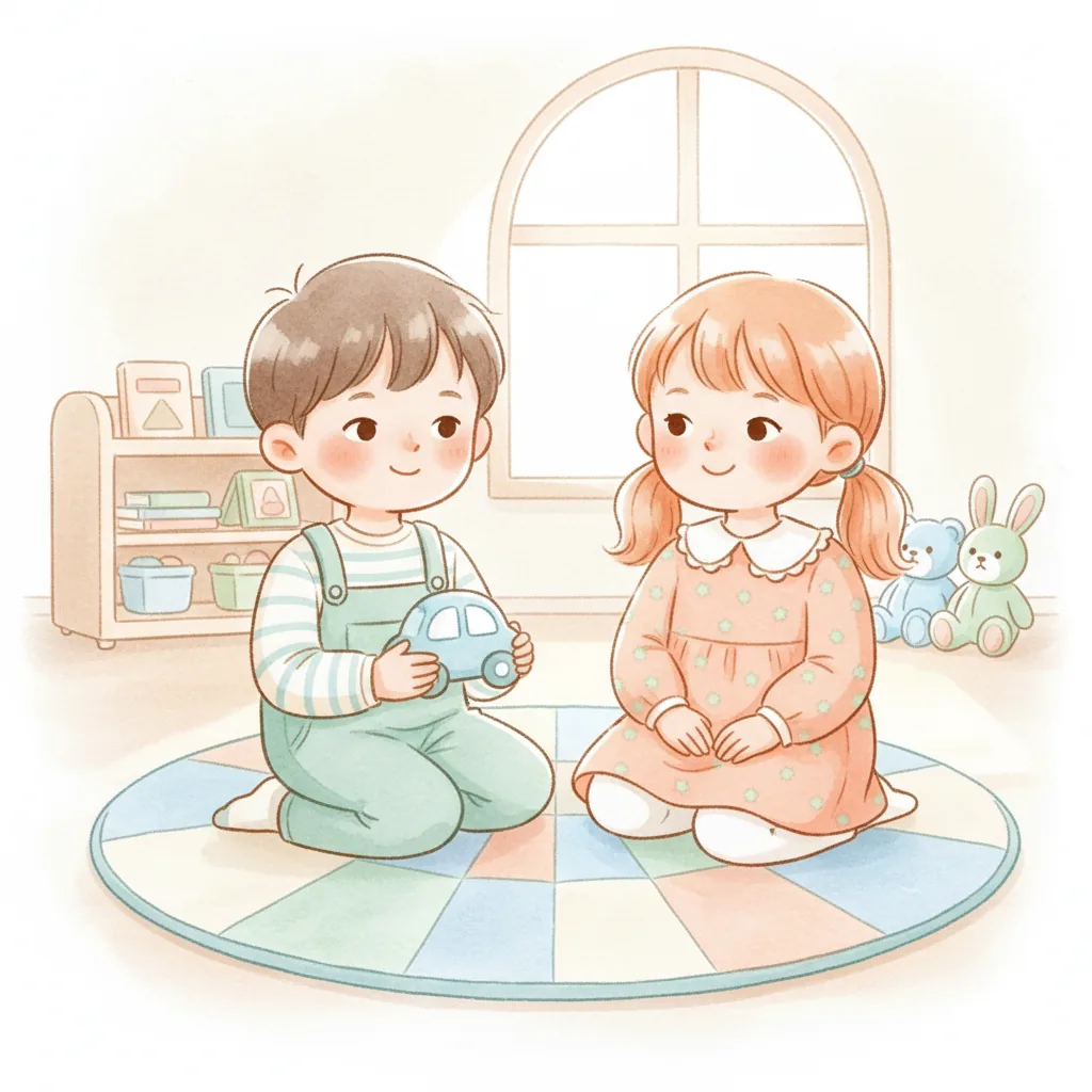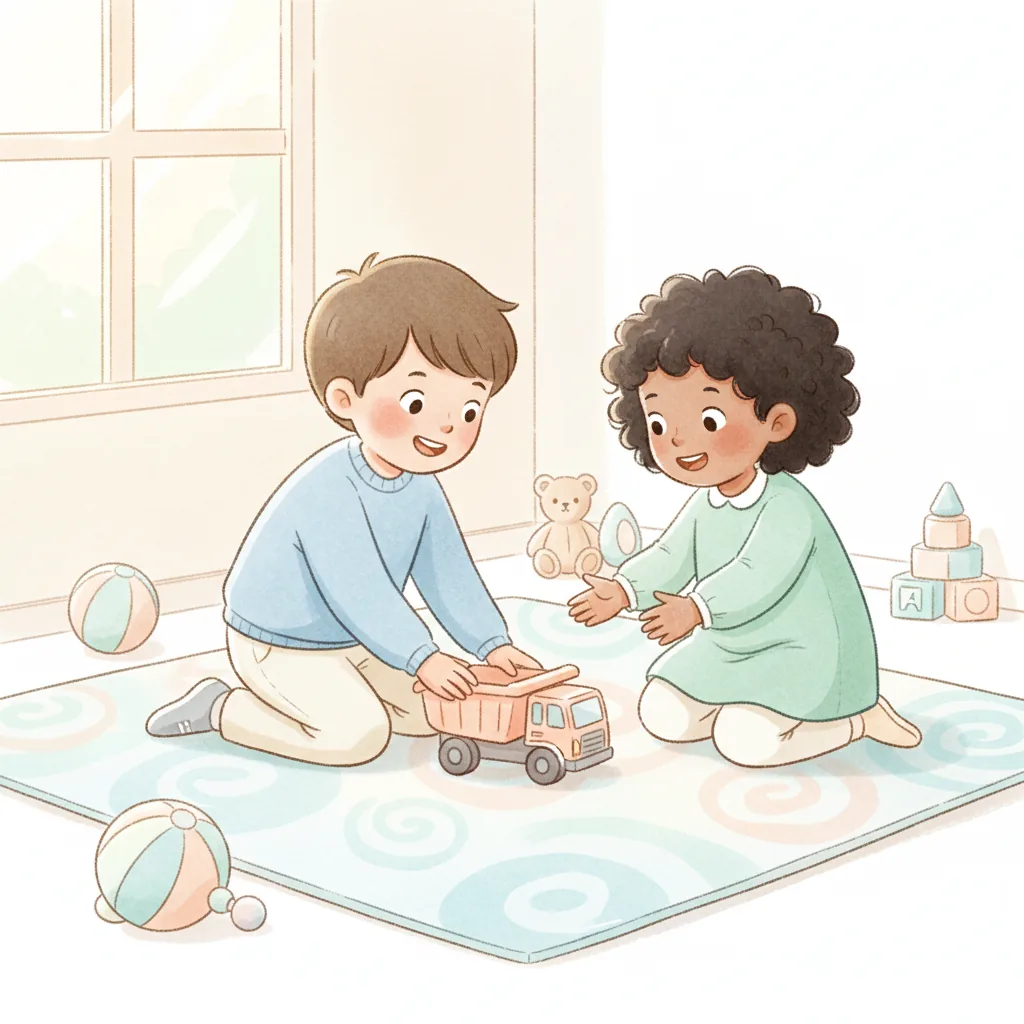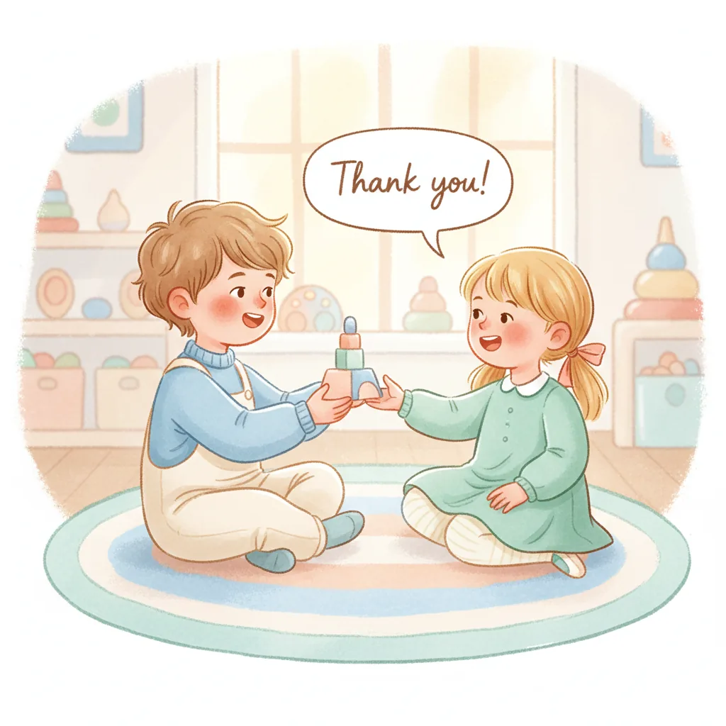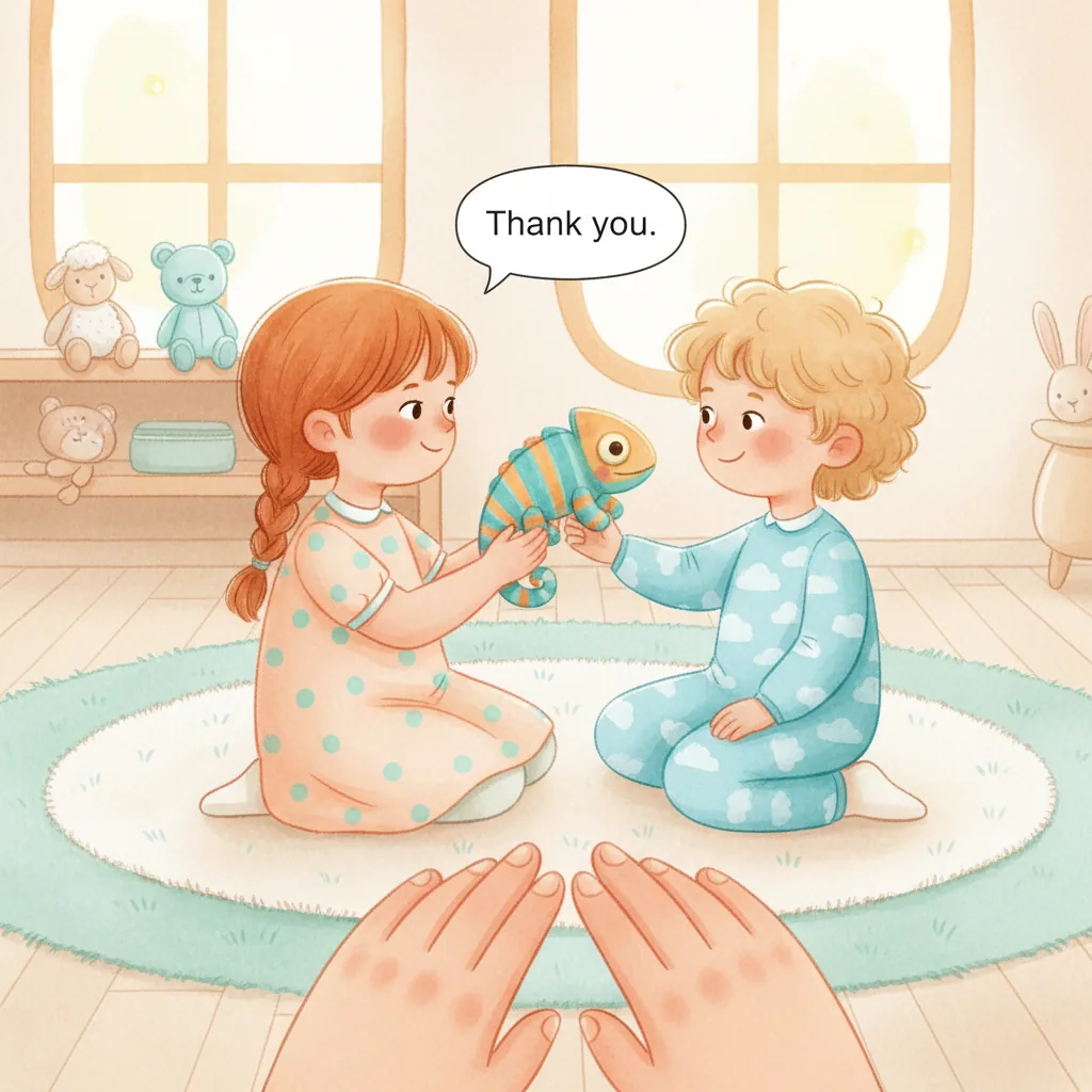 "content": "**Sharing Circle** \nGather a few toys (e.g., blocks, cars, dolls) and sit in a circle with the child and a few peers or family members. \nTake turns choosing a toy to play with for a short time, then say, \"Your turn!\" to pass it to the next person. \nEncourage everyone to share how it feels to take turns sharing toys.\n\n**Toy Sharing Storybook** \nHelp the child create a simple storybook by folding paper in half and drawing pictures. \nOn each page, illustrate scenes from the story, like asking to play, taking turns, and having fun. \nEncourage the child to add their feelings or thoughts to each page, such as \"I felt happy sharing!\"",