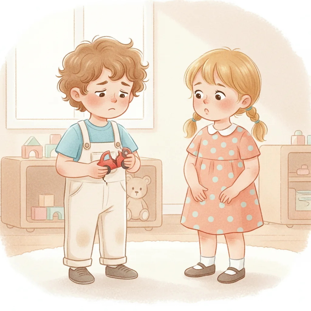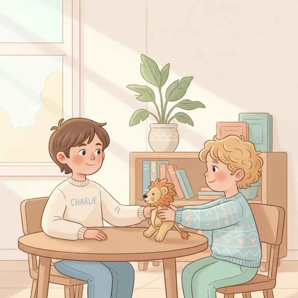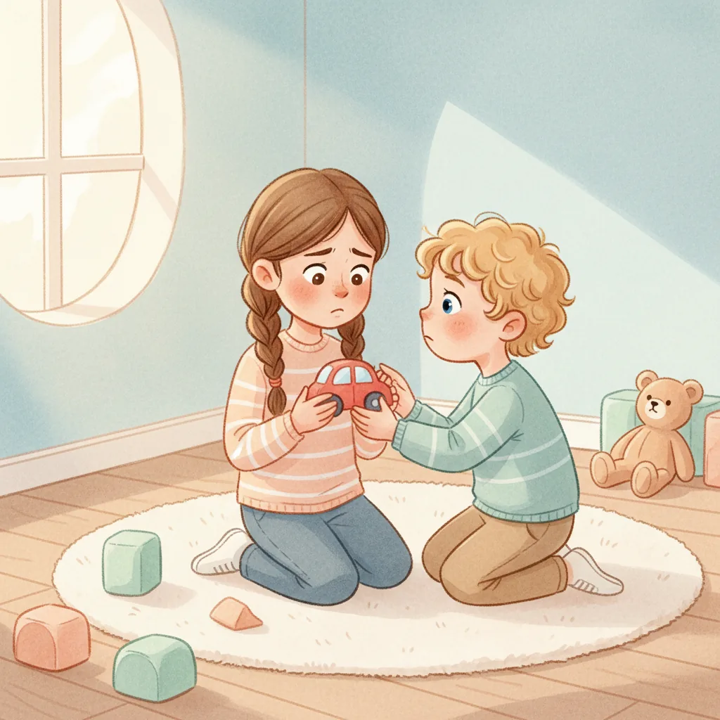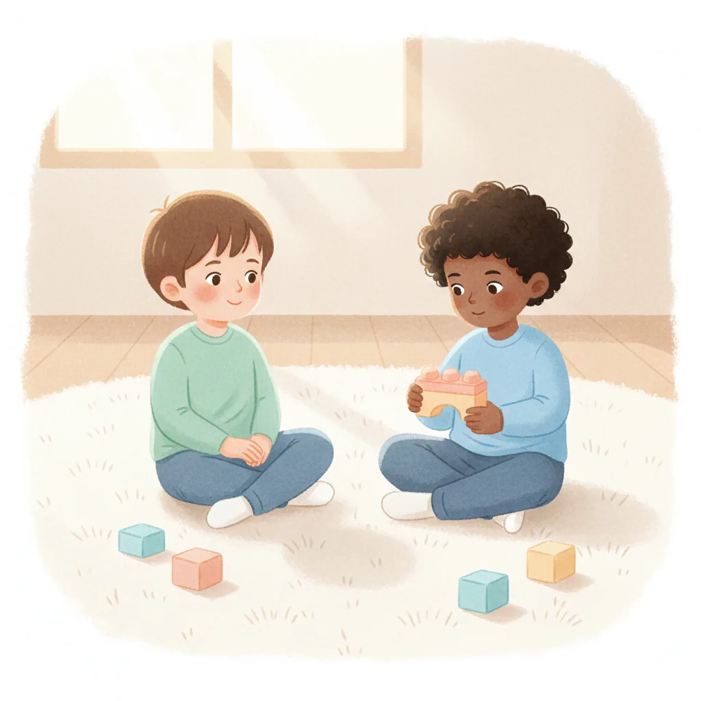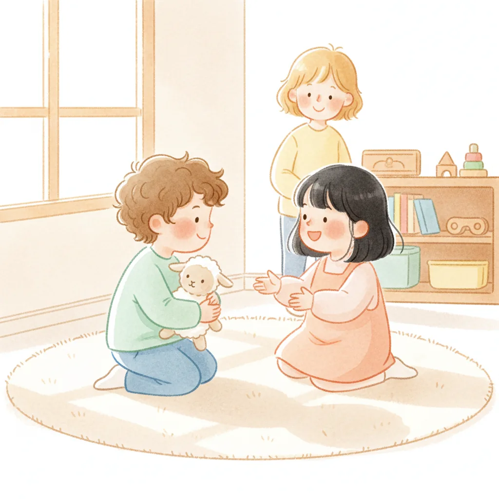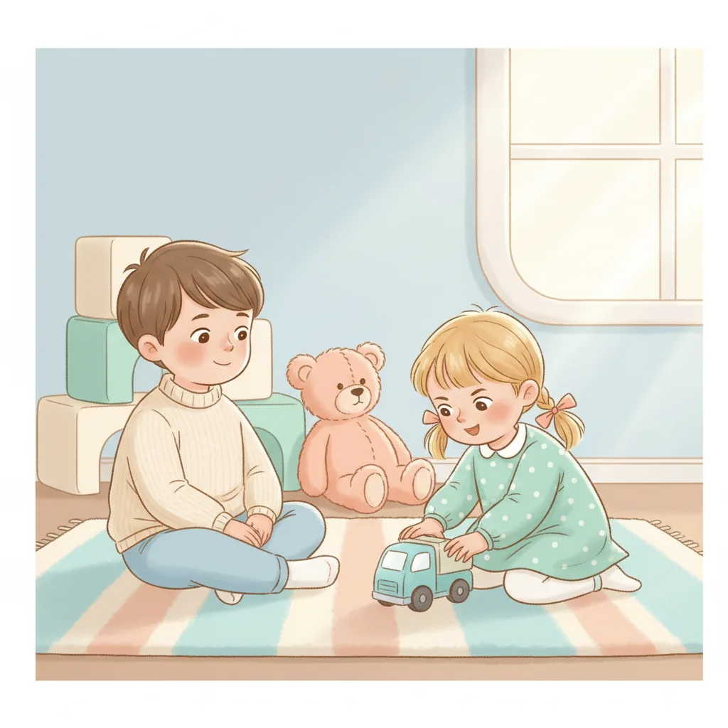 "content": "**Sharing Circle** \nGather a few toys (e.g., blocks, cars, dolls) and sit in a circle with the child and a few peers or family members. \nTake turns choosing a toy to play with for a short time, then say, \"Your turn!\" to pass it to the next person. \nEncourage everyone to share how it feels to take turns sharing toys.\n\n**Toy Sharing Storybook** \nHelp the child create a simple storybook by folding paper in half and drawing pictures. \nOn each page, illustrate scenes from the story, like asking to play, taking turns, and having fun. \nEncourage the child to add their feelings or thoughts to each page, such as \"I felt happy sharing!\"",