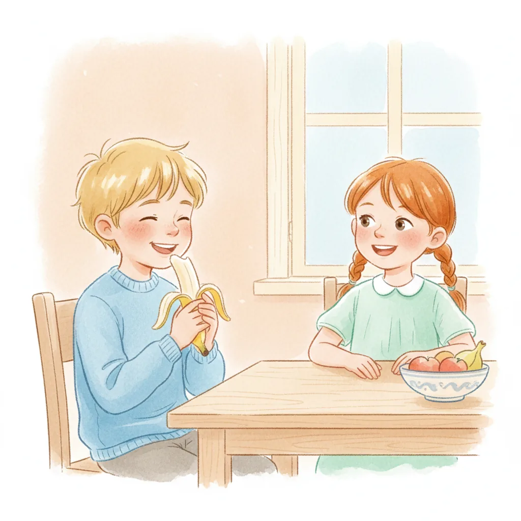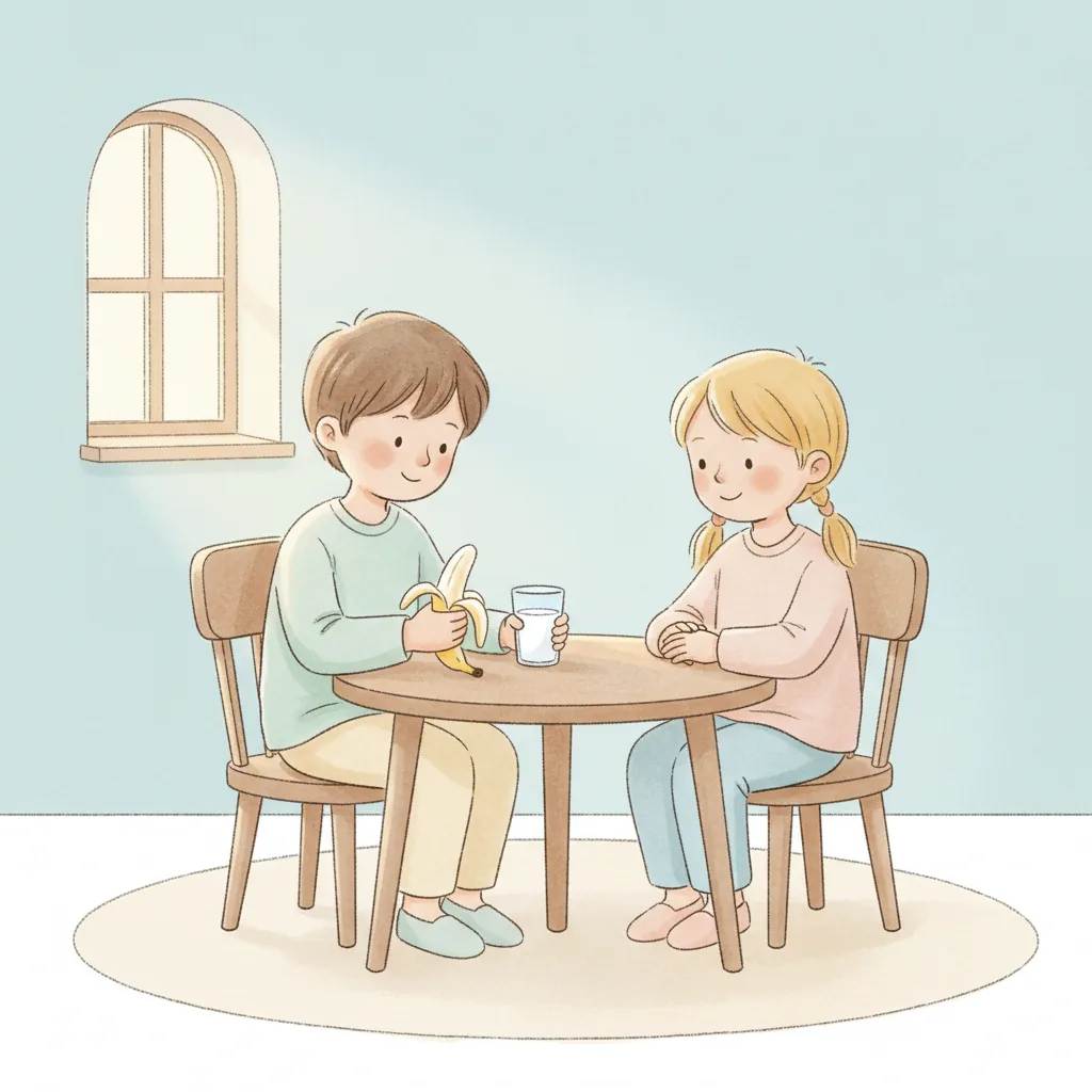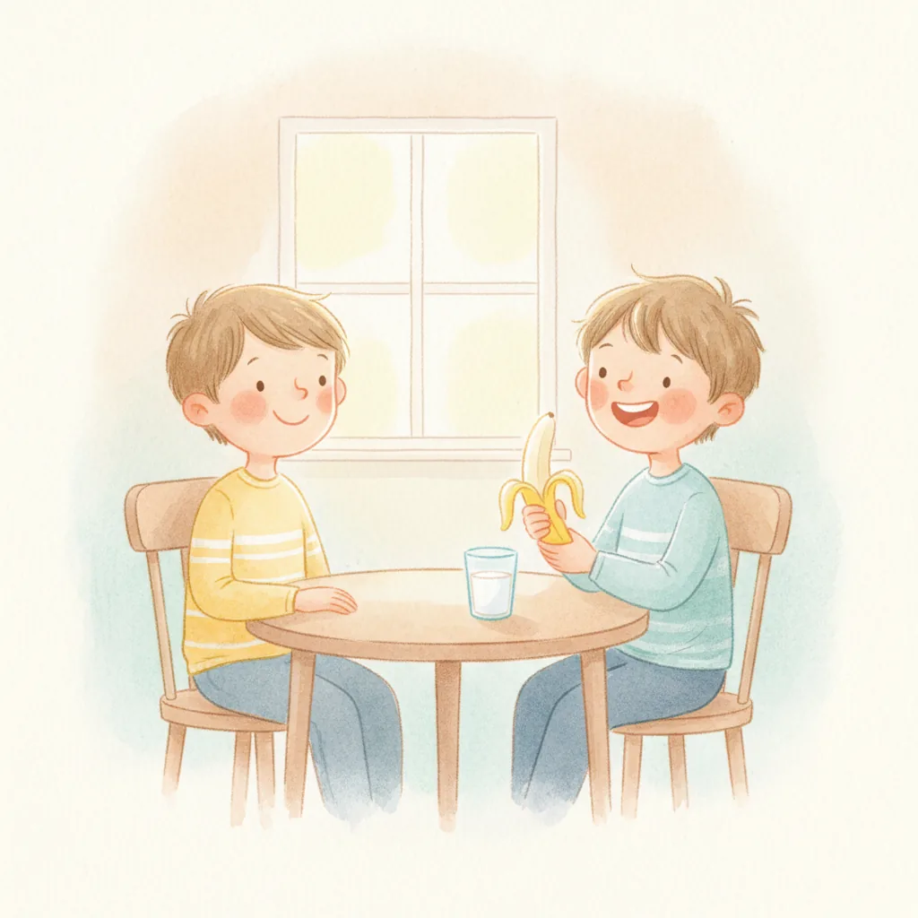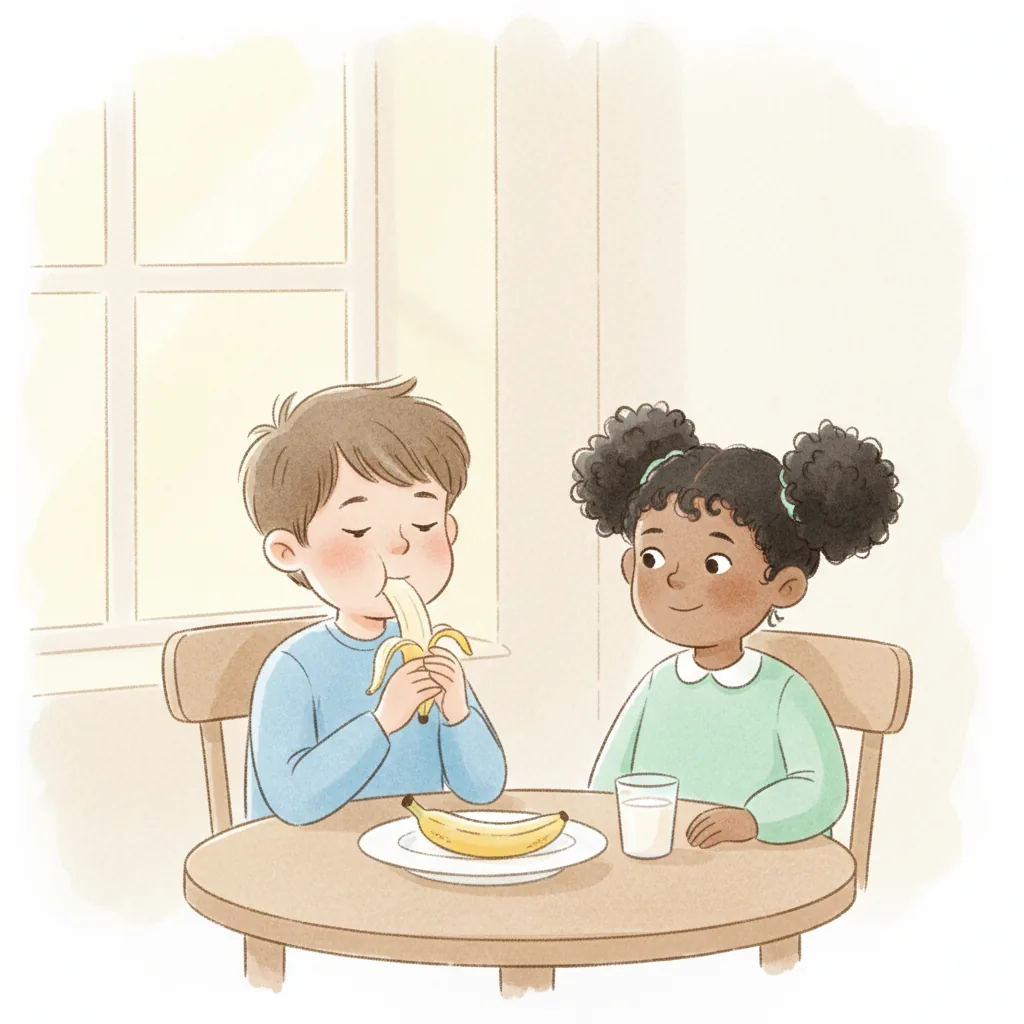 "es": "Texto: Yo como un plátano y bebo un vaso de leche.",