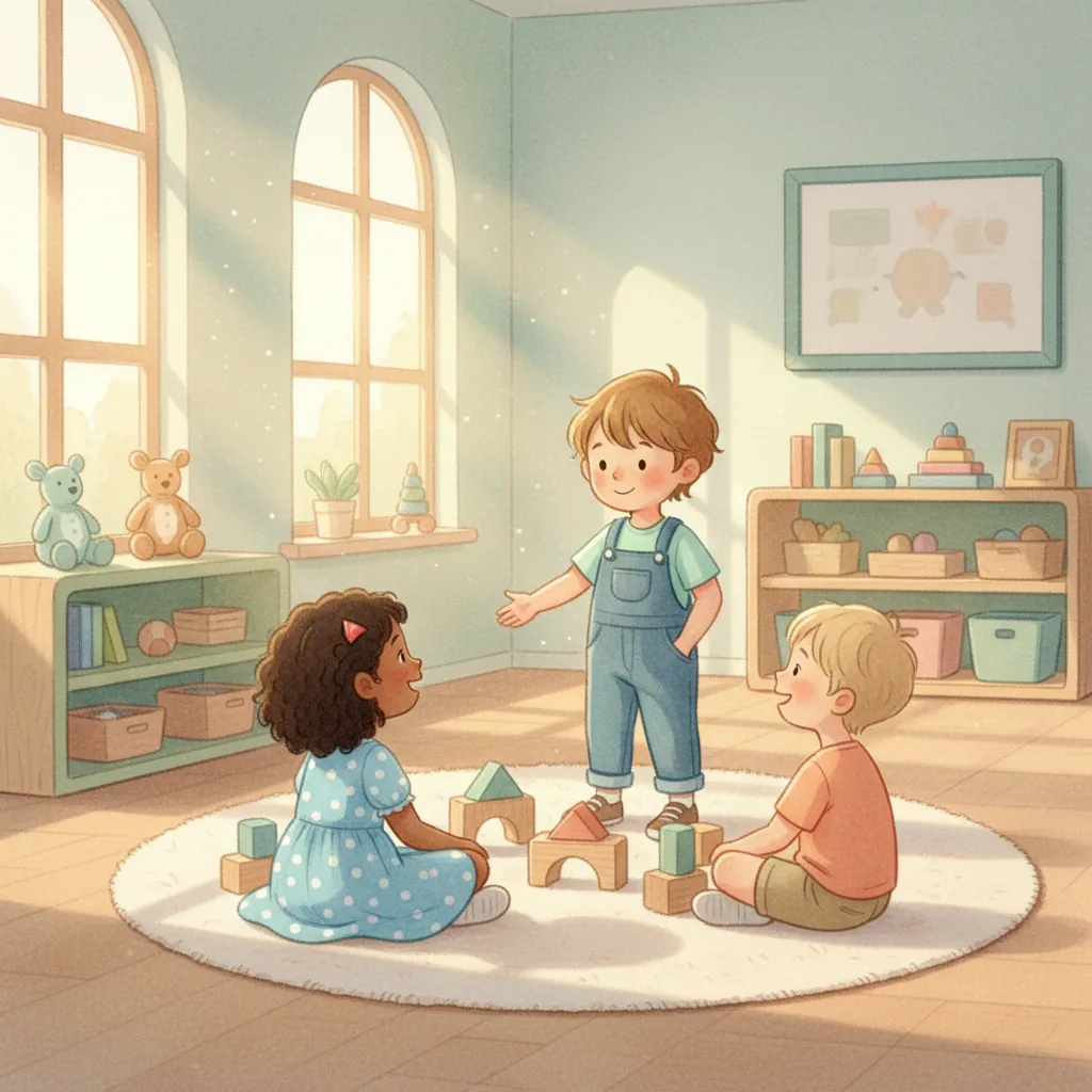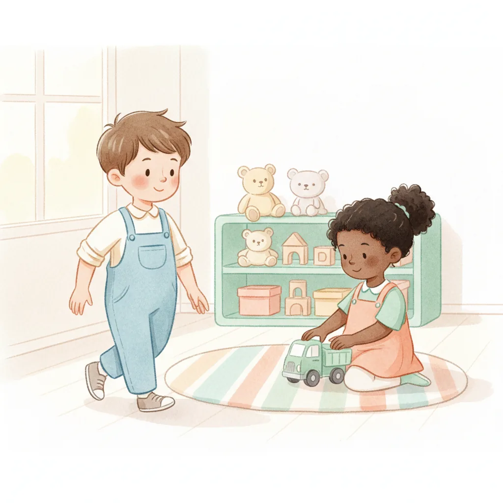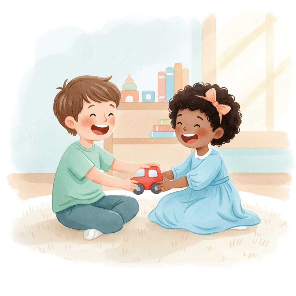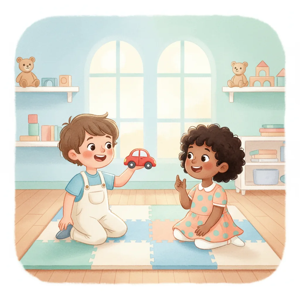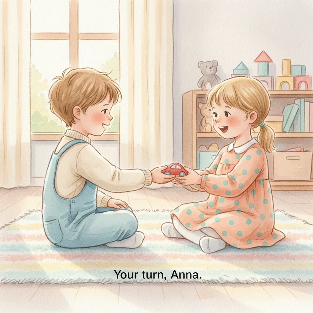 "content": ": Sharing Toys with Friends**\n\n**Scenario 1** \nPretend the child sees a friend playing with a favorite toy. \nPractice saying, \"Can I play with the toy too?\" — feeling a bit shy, then happy when the friend says, \"Yes, let's play together!\"\n\n**Scenario 2** \nAct out a situation where both children have a toy. \nPractice taking turns by saying, \"Your turn,\" with a smile, and waiting patiently for the friend to finish before saying, \"My turn now,\" feeling proud.\n\n**Scenario 3** \nPretend the child is playing with a toy and a friend asks to join. \nPractice responding with, \"Sure, let's share!\" — feeling excited to play together and happy when the friend joins in.",