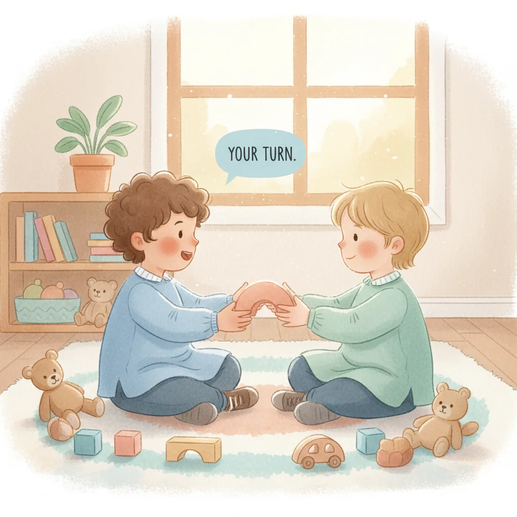 "content": "✏️ Vocabulary:\n\n1. **Share**\n - Letting someone else use or play with something that belongs to you \n\n2. **Toy**\n - An object like a truck or doll used for playing \n\n3. **Friend**\n - Someone you like to spend time with \n\n4. **Turn**\n - Waiting for your time to do something \n\n5. **Happy**\n - Feeling good inside \n\n6. **Together**\n - Being with someone and doing something as a group \n\n7. **Wait**\n - Staying patient and not rushing \n\n8. **Proud**\n - Feeling pleased and happy about something you did",