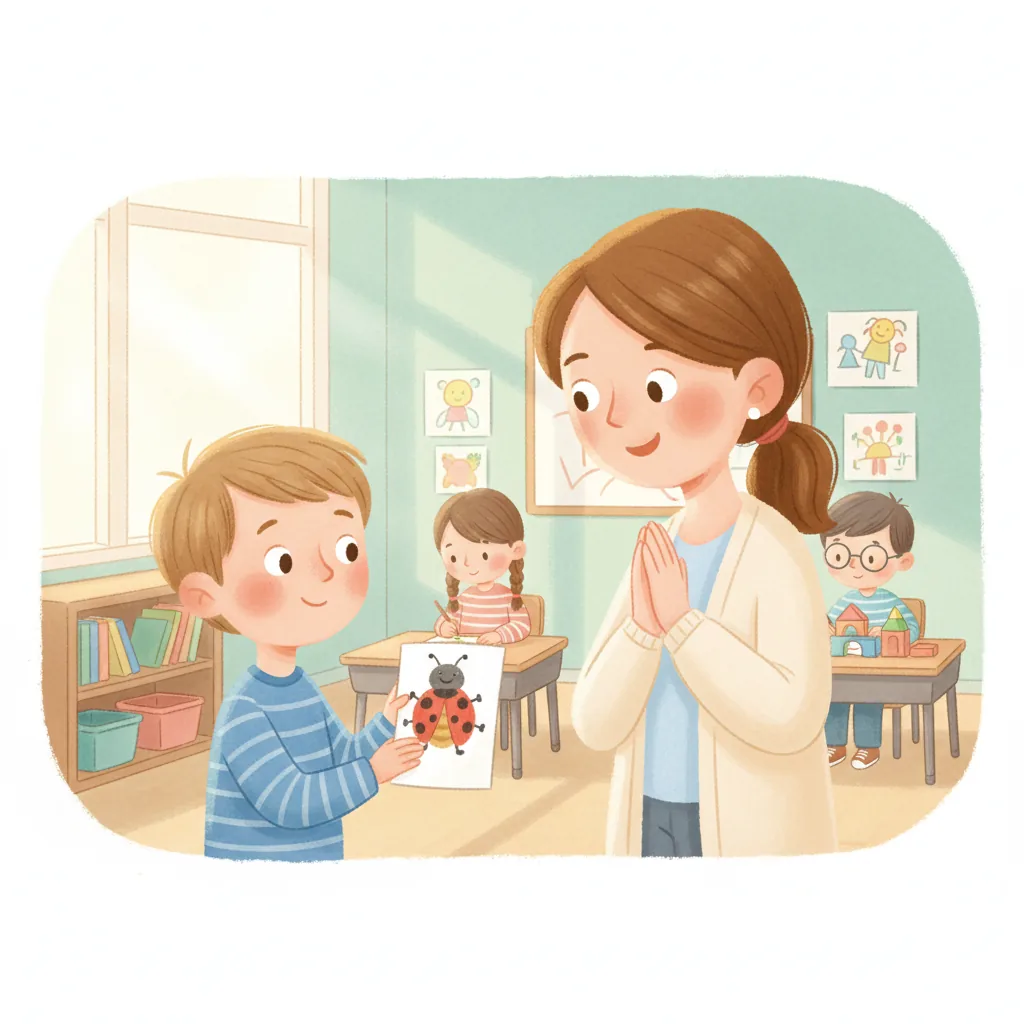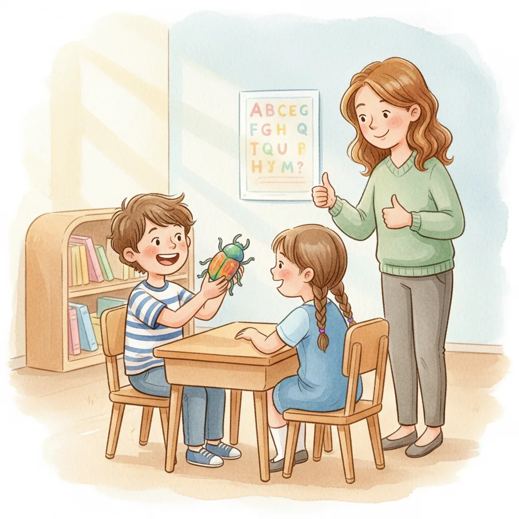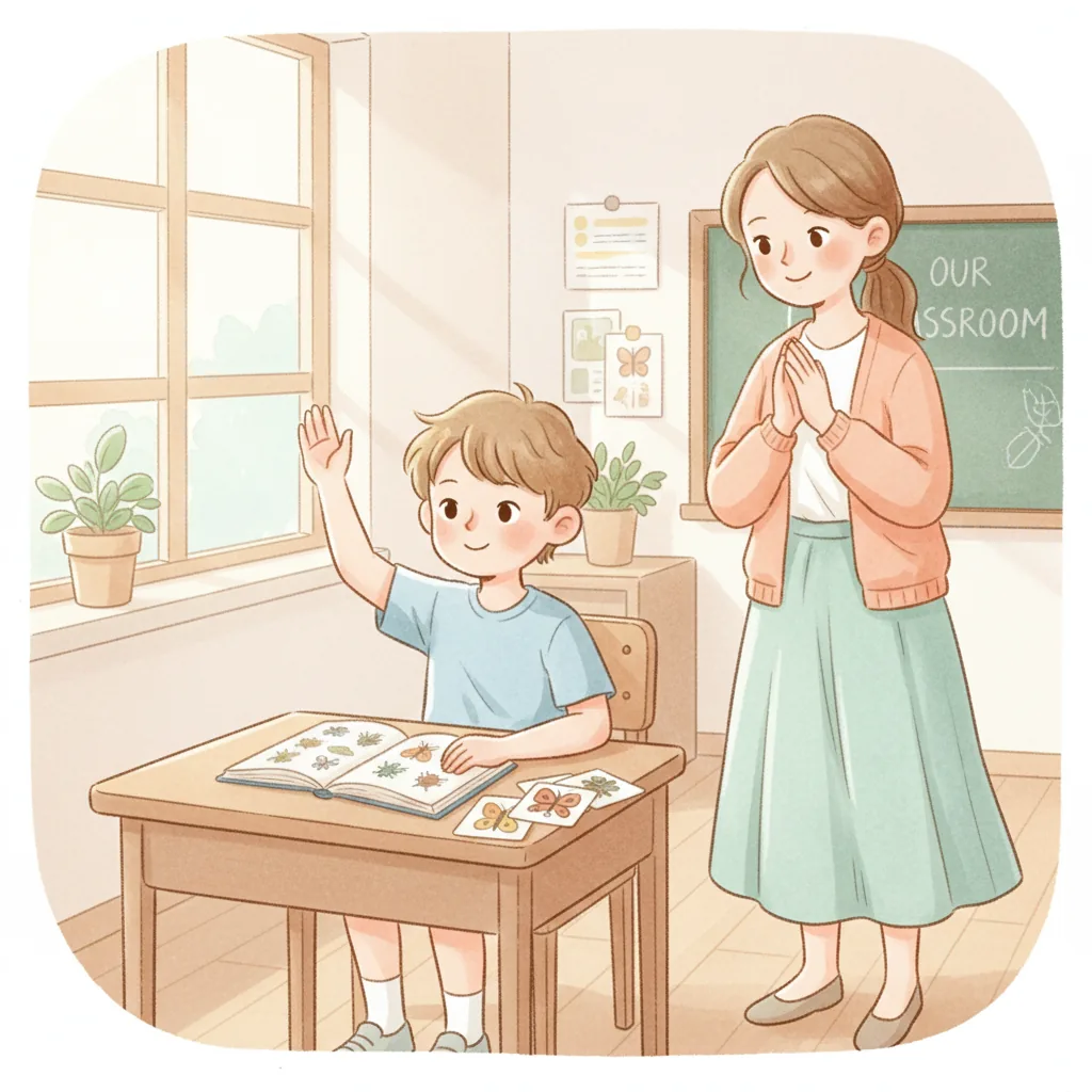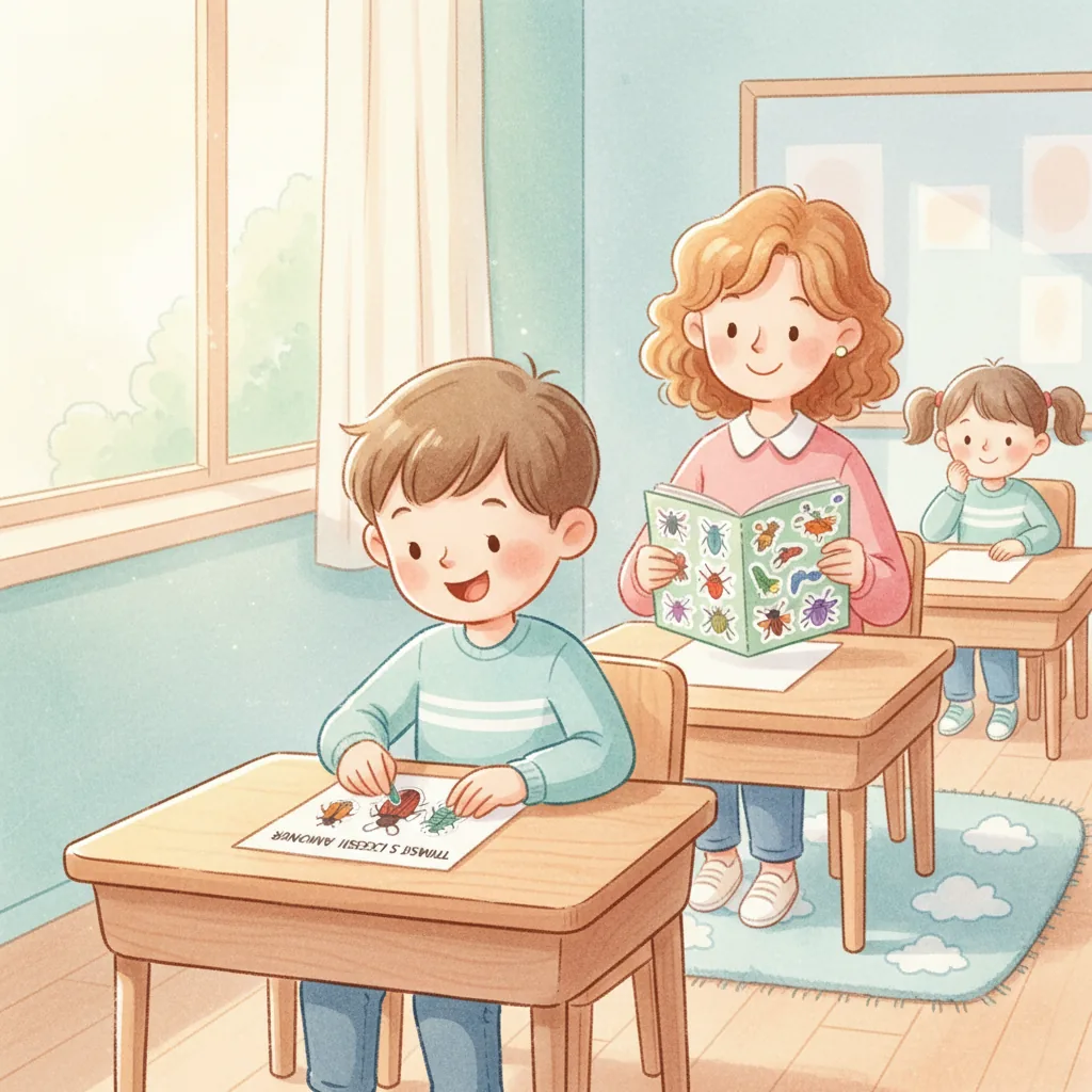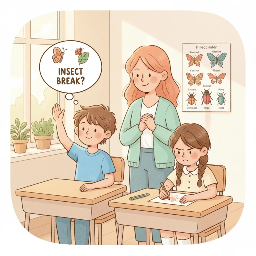 "content": ": Thomas's Journey to School Success\n\n**Scenario 1** \nPretend it's time to line up in class. \nPractice standing behind a friend and keeping hands to oneself. \nChild says, \"I’m ready to line up!\" — feeling focused and proud.\n\n**Scenario 2** \nAct out a situation where the child feels wiggly. \nPractice showing a special picture to the teacher and saying, \"Can I have a Bug Break, please?\" — feeling nervous, then relieved.\n\n**Scenario 3** \nPretend to share a fun fact during a class lesson. \nPractice waiting for a turn and saying, \"Did you know bugs can sing?\" — feeling excited and happy when friends listen and smile.",