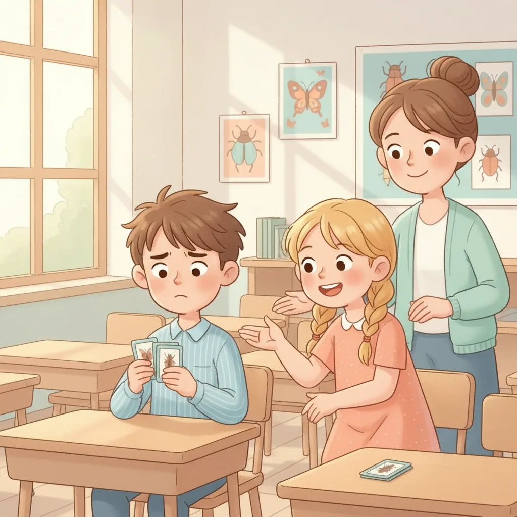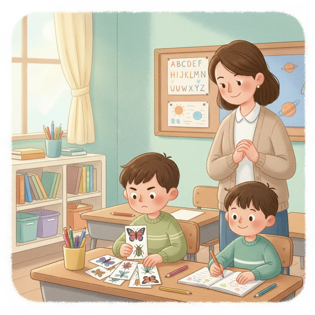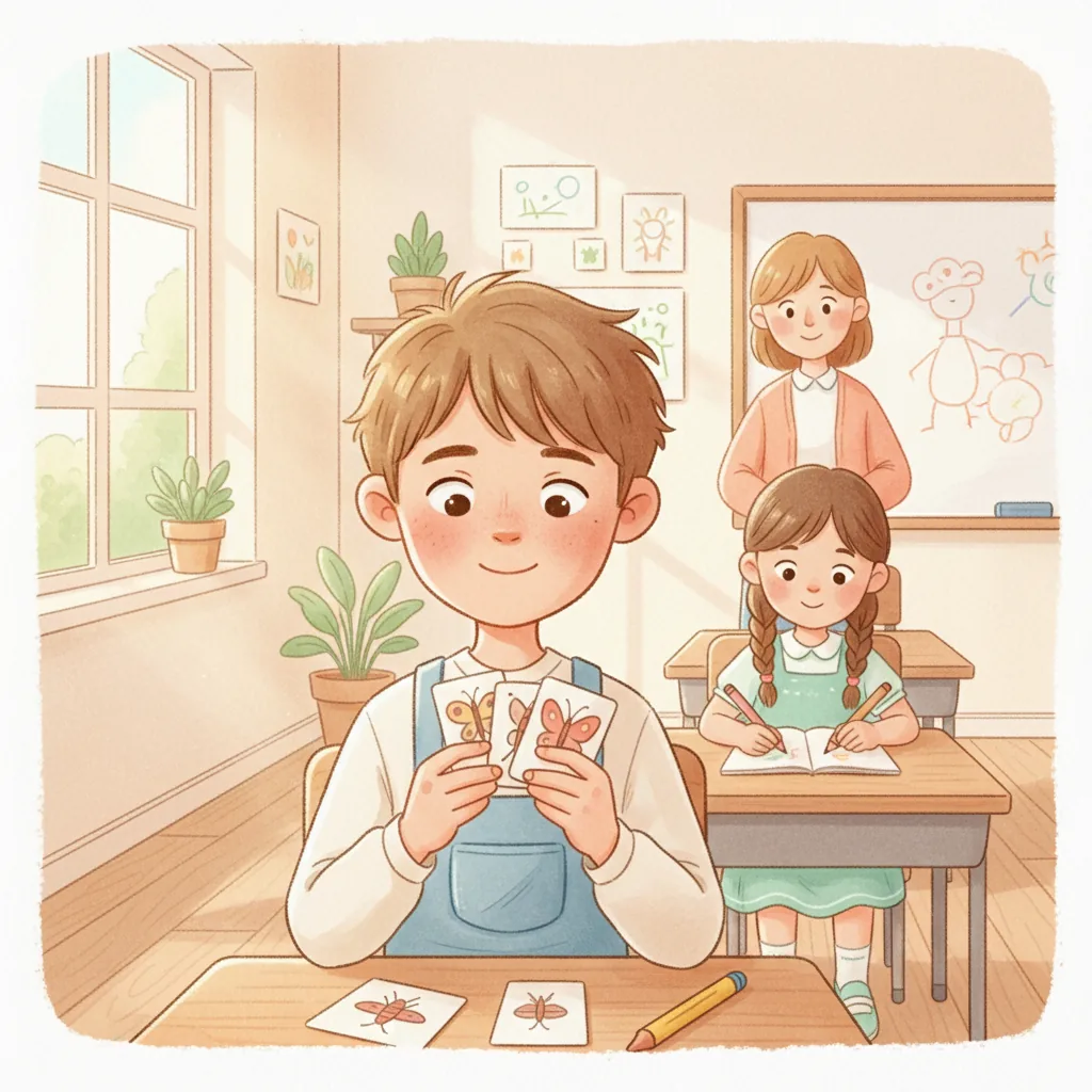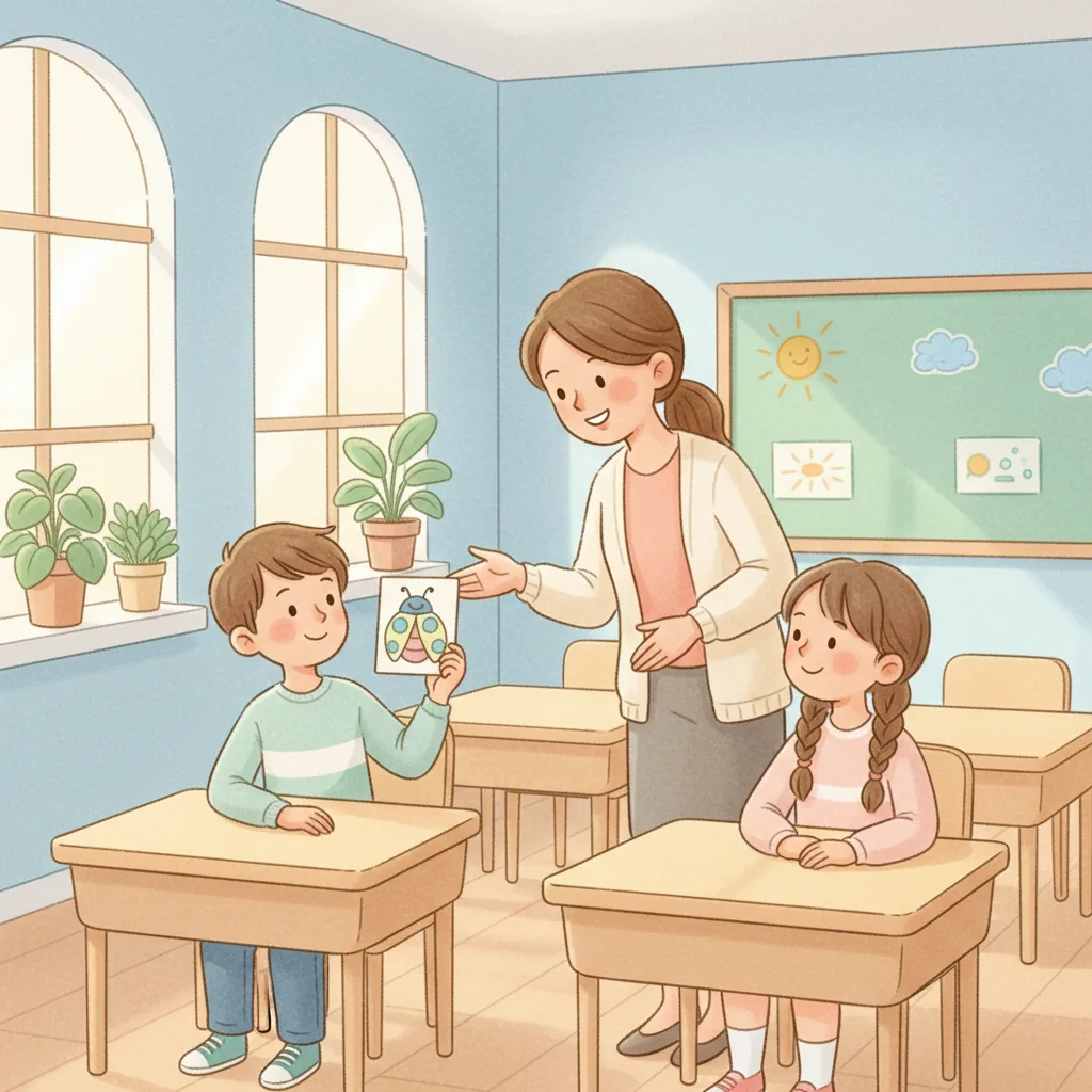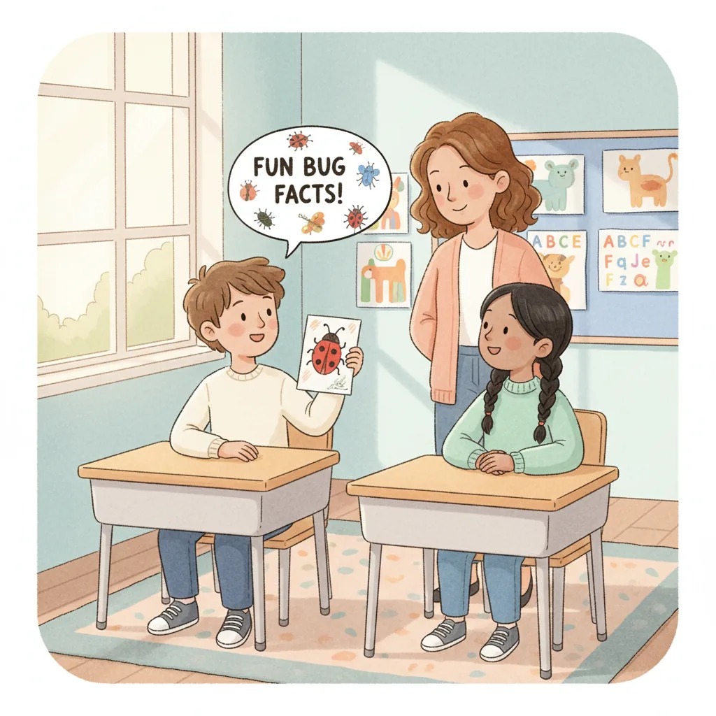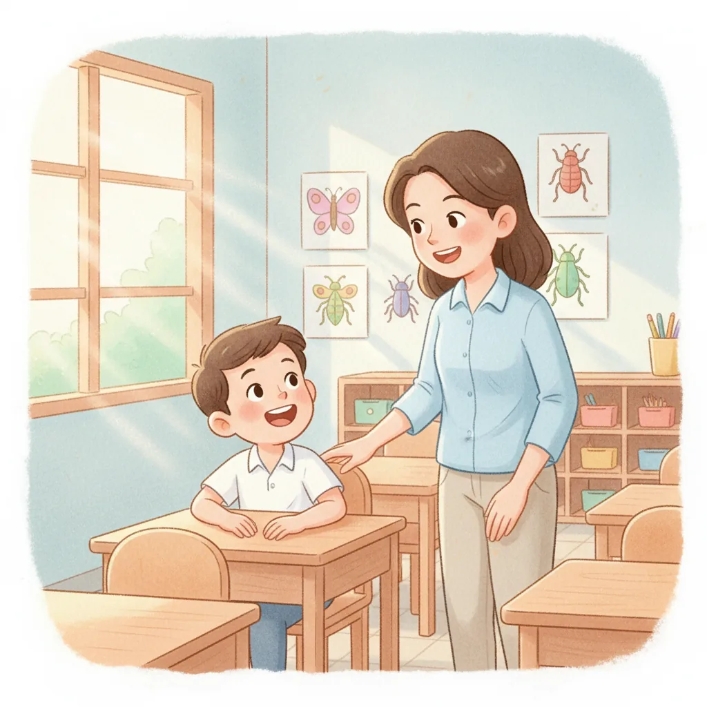 "content": ": Thomas's Journey to School Success\n\n**Scenario 1** \nPretend it's time to line up in class. \nPractice standing behind a friend and keeping hands to oneself. \nChild says, \"I’m ready to line up!\" — feeling focused and proud.\n\n**Scenario 2** \nAct out a situation where the child feels wiggly. \nPractice showing a special picture to the teacher and saying, \"Can I have a Bug Break, please?\" — feeling nervous, then relieved.\n\n**Scenario 3** \nPretend to share a fun fact during a class lesson. \nPractice waiting for a turn and saying, \"Did you know bugs can sing?\" — feeling excited and happy when friends listen and smile.",