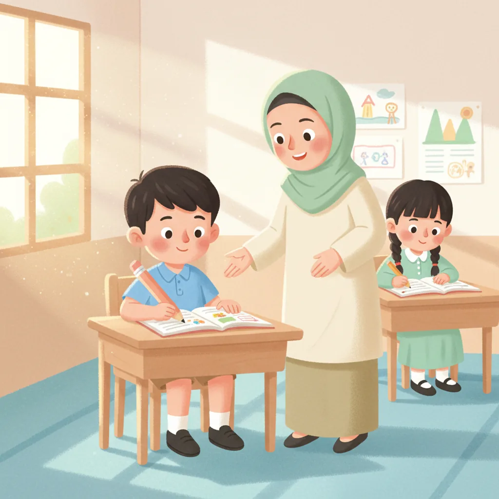 "hi": "हमारी टीचर मुझे शेयर करने और अपनी बारी का इंतज़ार करने के लिए अंगूठा ऊपर दिखाती हैं।",