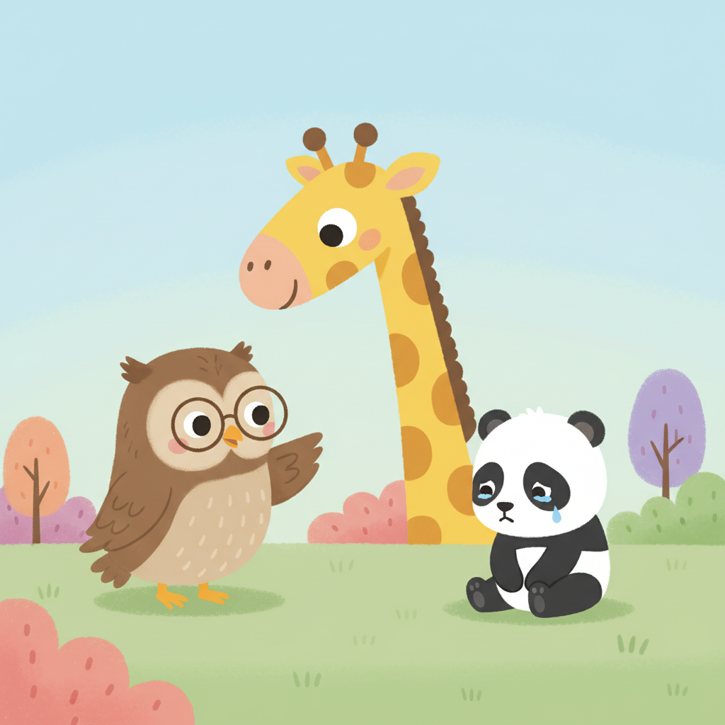 "te": "గుడ్లగూబ గుసగుసలాడుతూ పాండా వైపు చూపిస్తోంది"