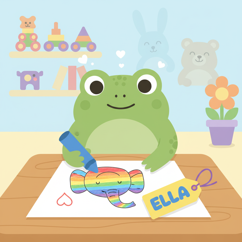"scenario_text": "The frog is drawing a picture for the elephant as a surprise!",