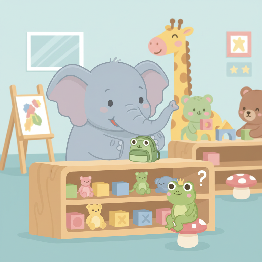 "scenario_text": "The elephant is hiding the frog's backpack as a mean joke",