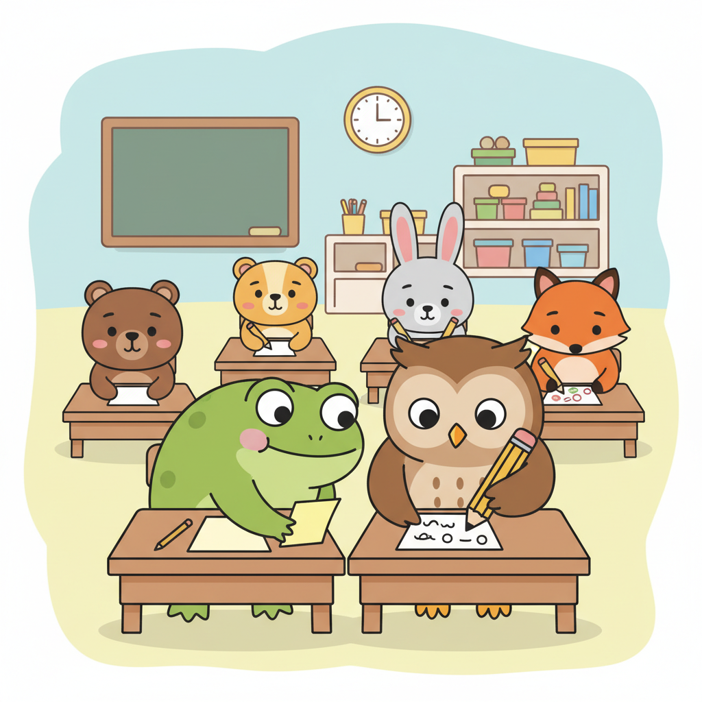 "scenario_text": "The frog is copying the owl's answers and not doing its own work",
