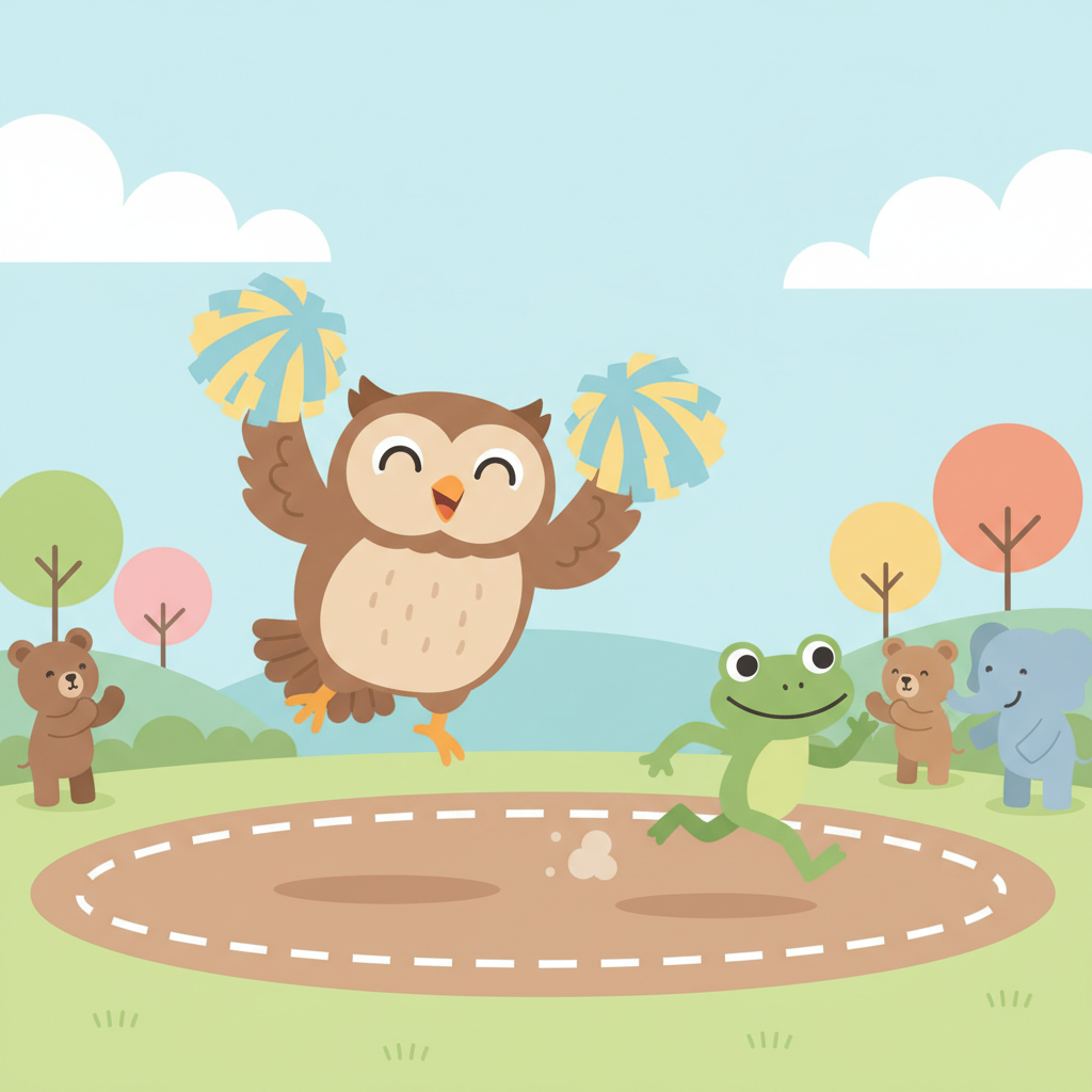 "scenario_text": "The owl is cheering for the frog at the race!",
