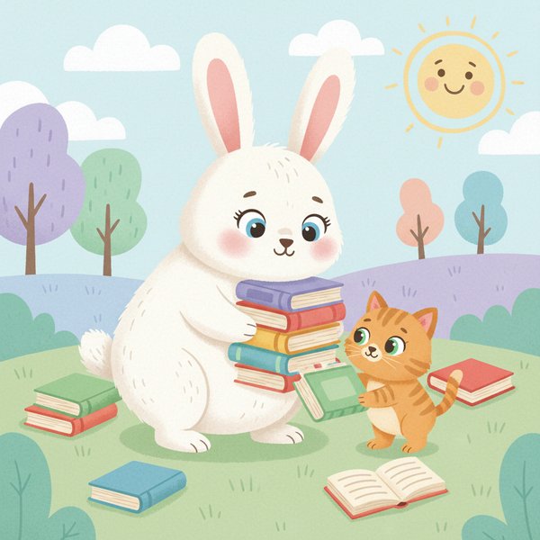 "te": "ఈ కుందేలు పిల్లి పిల్లకు పుస్తకాలు ఏరుకోవడంలో సాయం చేస్తోంది!"
