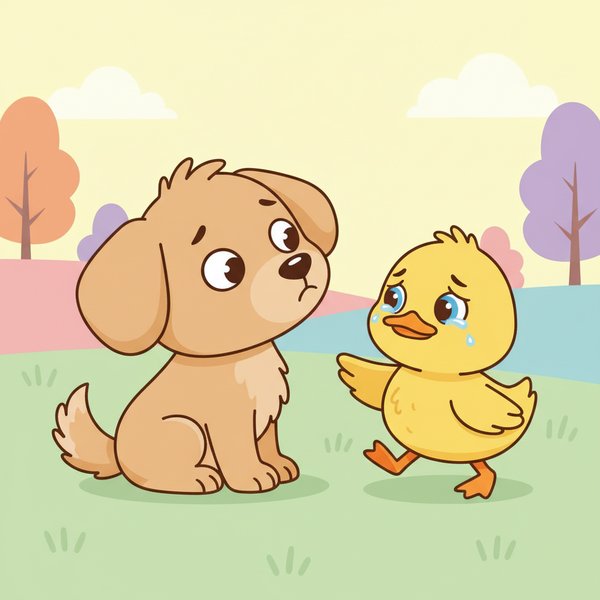 "te": "ఈ కుక్కపిల్ల బాధగా ఉన్న బాతు పిల్లను పట్టించుకోవడం లేదు"