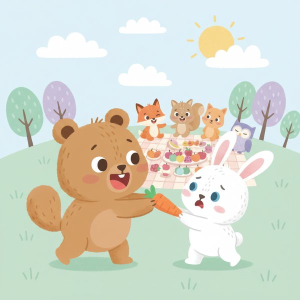 "scenario_text": "This bear cub is grabbing the bunny's snack",