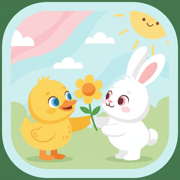 "te": "ఈ బాతు పిల్ల కుందేలుకు పువ్వు ఇస్తోంది!"