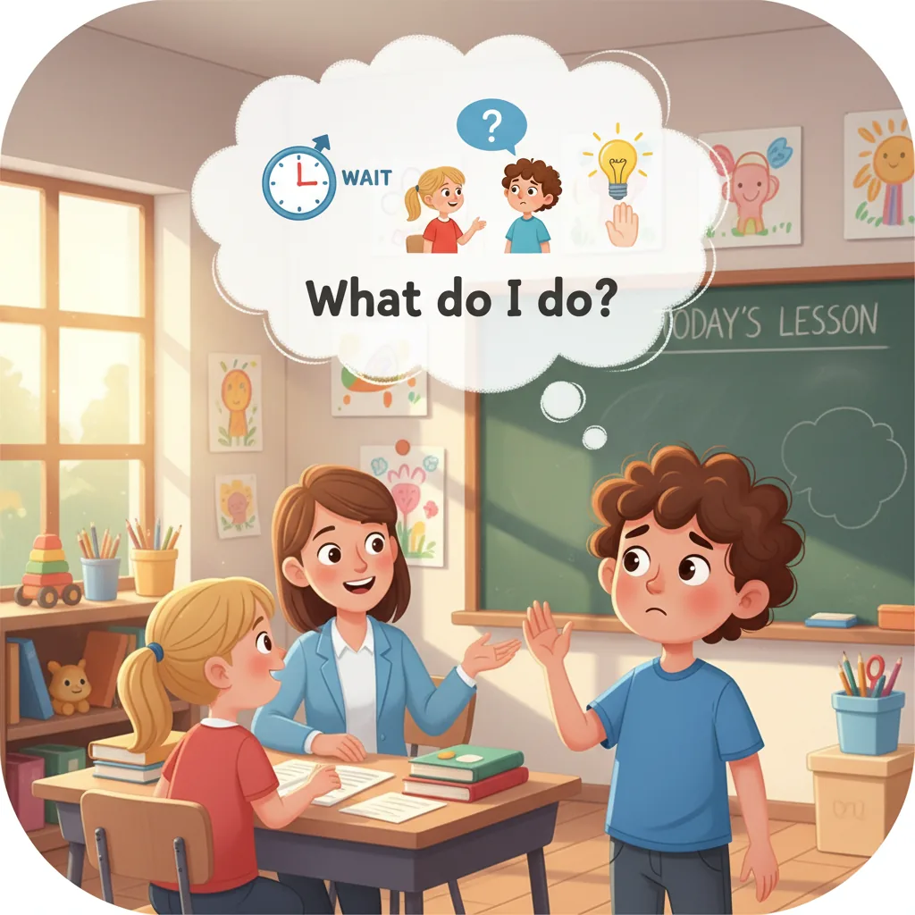 "es": "Tu compañero de clase está hablando y compartiendo algo. Tú también quieres decir algo, pero aún no es tu turno.",