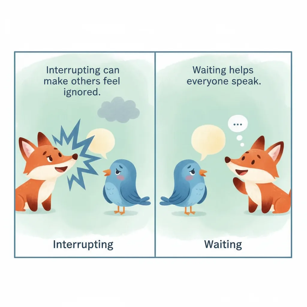 "en": "Interrupting makes others feel ignored. Respect means letting others finish.",