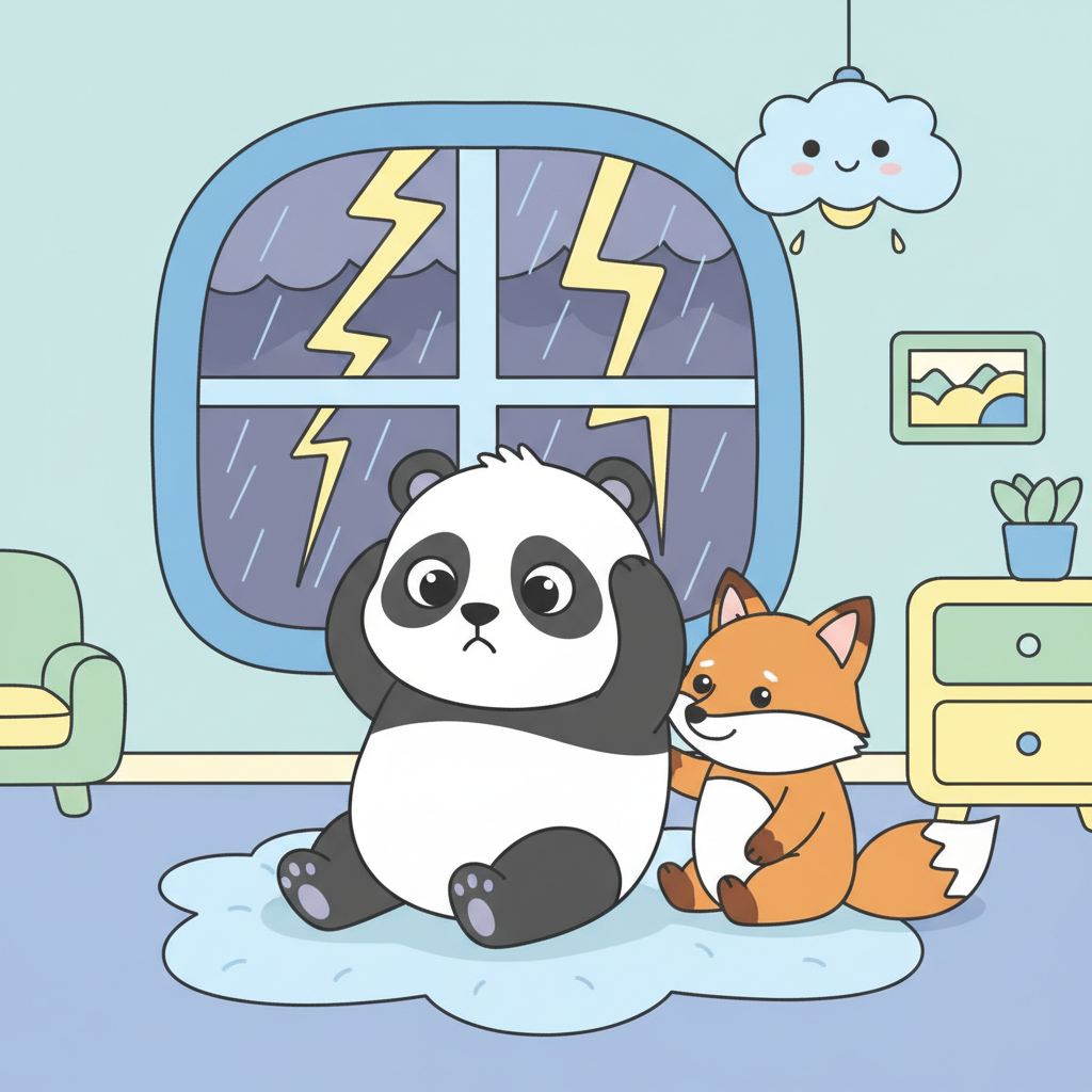 "scenario_text": "The panda is scared of the loud thunder outside!",