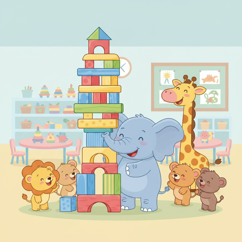 "es": "¡El elefante terminó de construir una torre alta con bloques!",