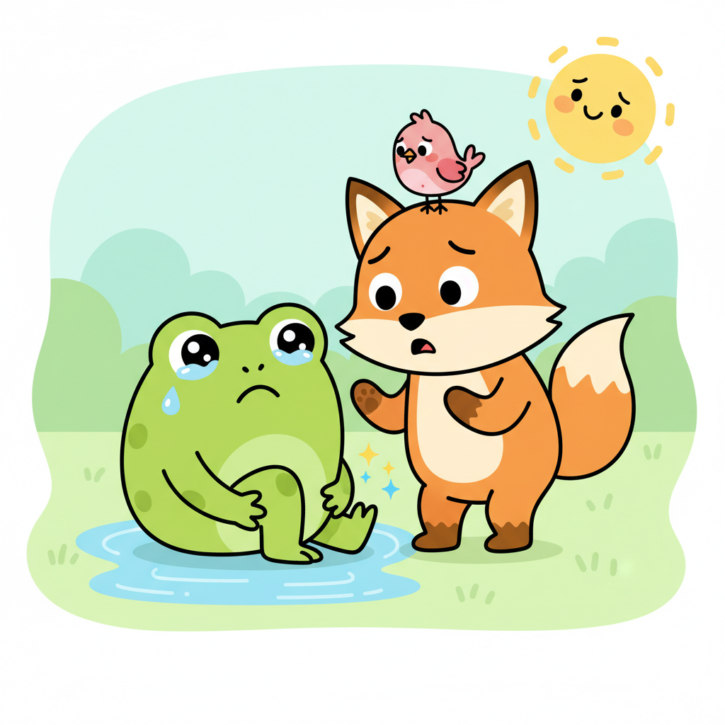 "es": "¡La rana resbaló en el piso mojado y parece herida!",