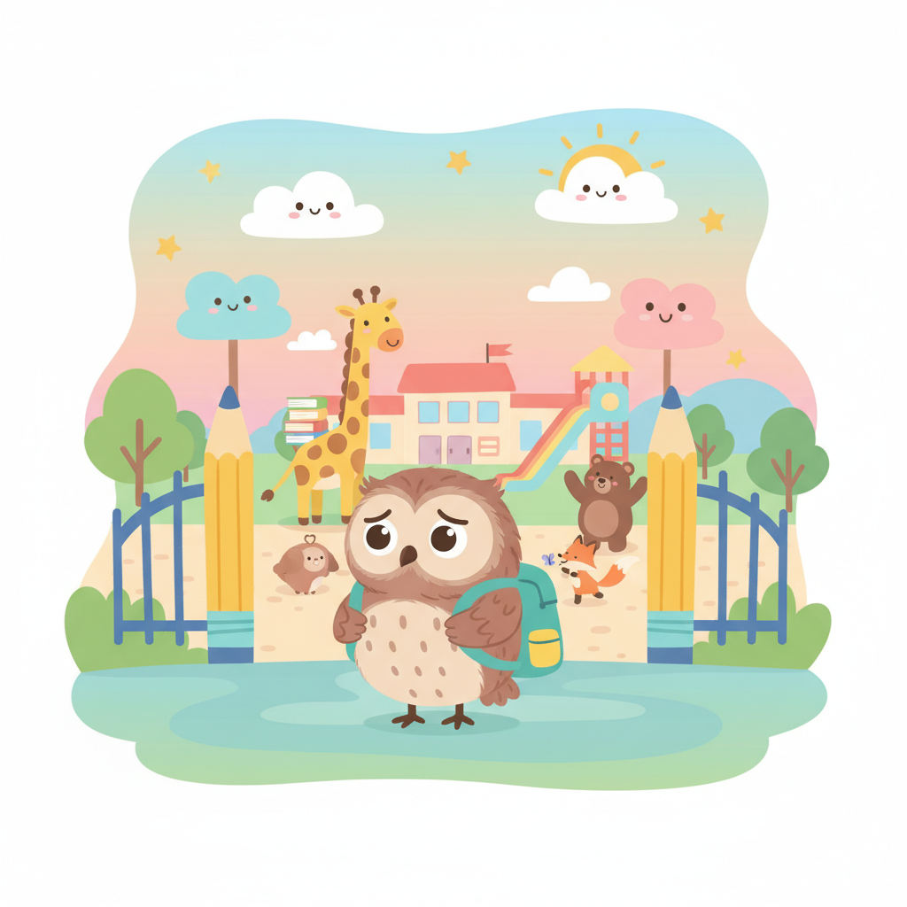 "es": "¡El búho está nervioso por el primer día en una escuela nueva!",