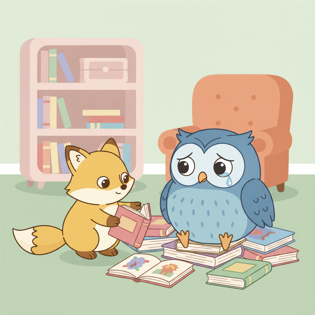 "te": "గుడ్లగూబ పుస్తకాలు జారవిడిచి బాధగా కనిపిస్తోంది!"
